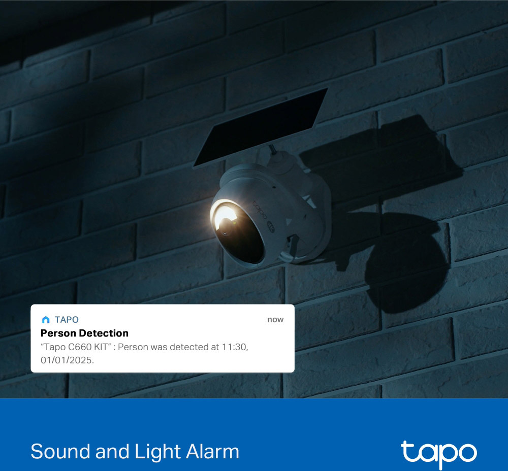 Tapo C660 KIT - La sécurité 4K qui réfléchit. Faites l'expérience d'un nouveau niveau de sécurité avec le Tapo C660 KIT - la caméra de surveillance 360° à énergie solaire pour l'extérieur. Équipée d'une résolution 4K Ultra-HD d'une grande netteté, d'un zoom numérique 18x et d'un objectif lumineux F1.6, aucun détail n'échappe à cette caméra, qu'il s'agisse d'une plaque d'immatriculation, d'un animal domestique ou d'un mouvement étranger devant la porte d'entrée. Grâce à l'intelligence artificielle intégrée, la caméra reconnaît de manière fiable les personnes, les animaux domestiques et les véhicules - sans aucun abonnement. Le suivi intelligent à 360° veille à ce qu'aucun mouvement ne puisse se cacher dans l'angle mort. La nuit, le puissant capteur Starlight, combiné à des spots, fournit des images couleur brillantes même en cas de faible luminosité. Le cœur du système : une batterie puissante de 10.000 mAh, sans entretien, qui se recharge quotidiennement grâce au panneau solaire fourni, avec seulement 45 minutes d'exposition directe au soleil. La caméra reste ainsi active en permanence - sans aucune prise de courant. Grâce à la connexion WLAN bi-bande (2,4 & 5 GHz), vous profitez d'une transmission 4K fluide, même à grande distance du routeur. Avec la possibilité d'enregistrer 24h/24 et 7j/7 en 4K, des options de stockage flexibles (localement par microSD jusqu'à 512 Go ou via le Tapo Cloud) et le contrôle intuitif via l'application Tapo, vous maîtrisez votre sécurité à tout moment. De plus, des zones d'activité réglables individuellement, une alarme sonore et lumineuse personnalisable et un design IP65 résistant aux intempéries protègent votre maison par tous les temps. Que ce soit pour la maison, le jardin ou l'entrée, le Tapo C660 KIT offre une solution de sécurité complète, intelligente et fiable avec une flexibilité maximale. Et le meilleur : il fonctionne sans aucun câble et est prêt à l'emploi.