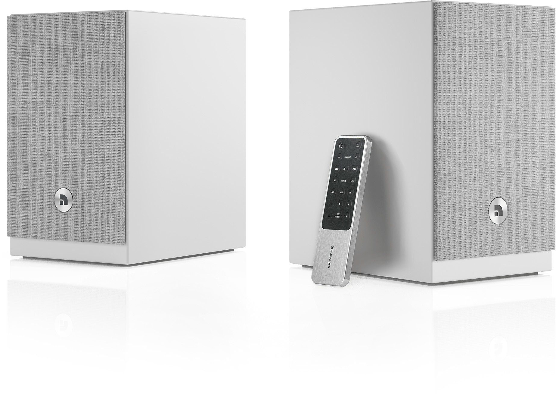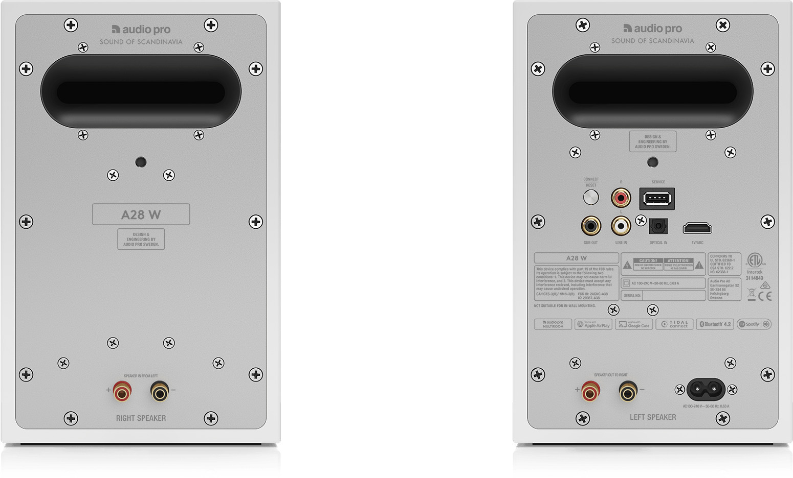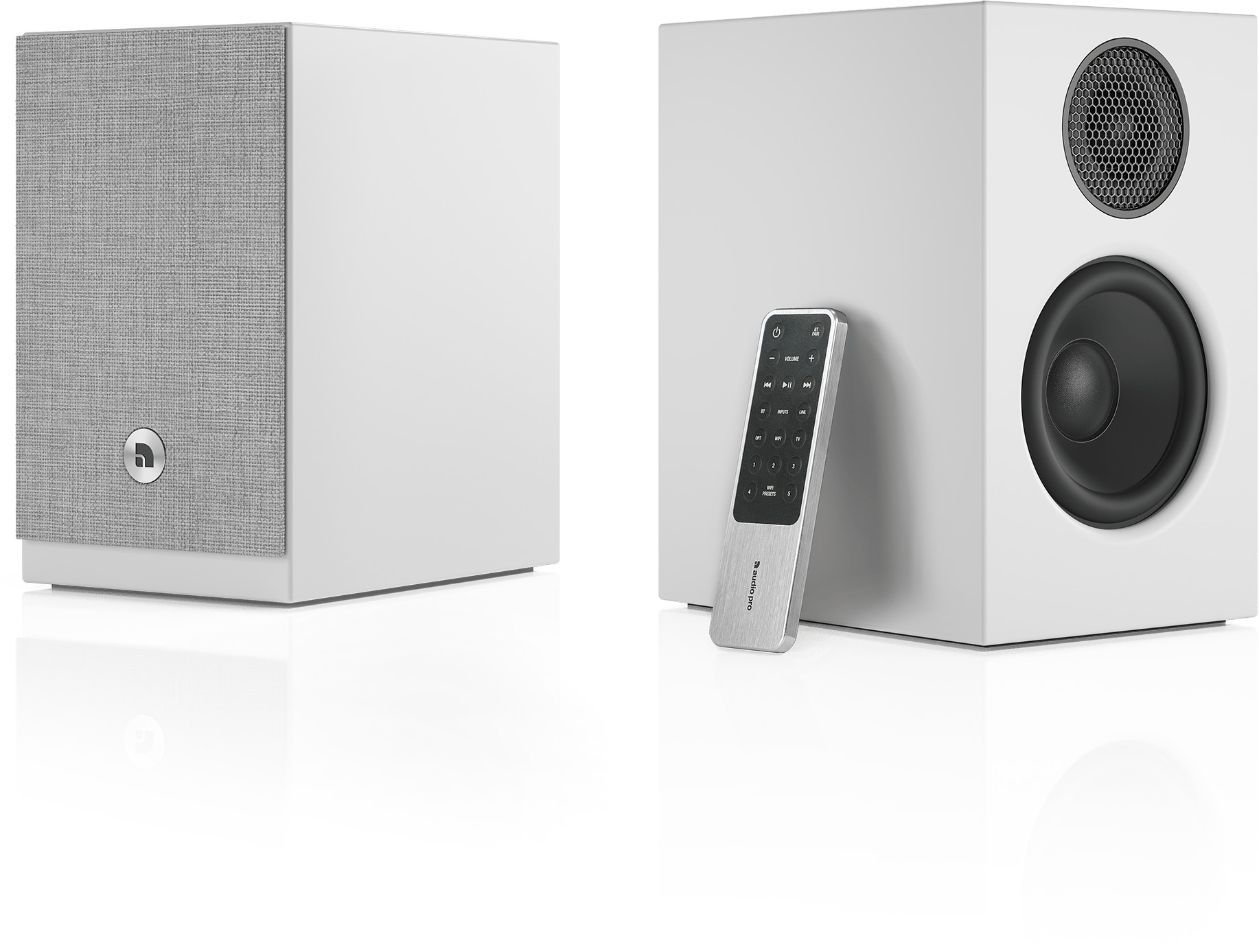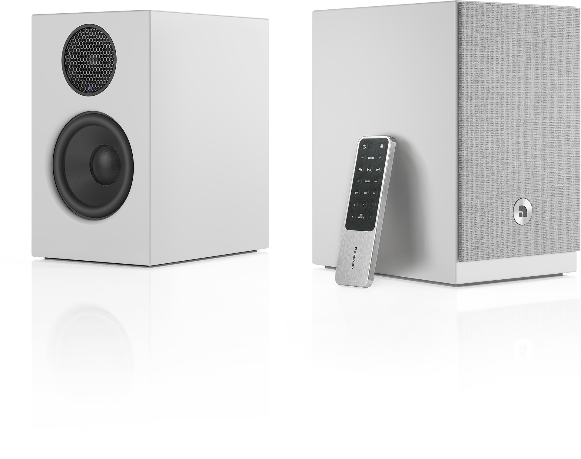 - Le boîtier en MDF blanc ou noir élégant ou, si vous préférez, en placage de noyer exclusif, s'intègre harmonieusement dans votre intérieur. Les façades en tissu sont fixées magnétiquement et peuvent être facilement retirées pour un look plus moderne, si vous préférez ce design. Le A28 W est prêt à être fixé au mur (supports vendus séparément), mais il trouve aussi facilement sa place sur une étagère.