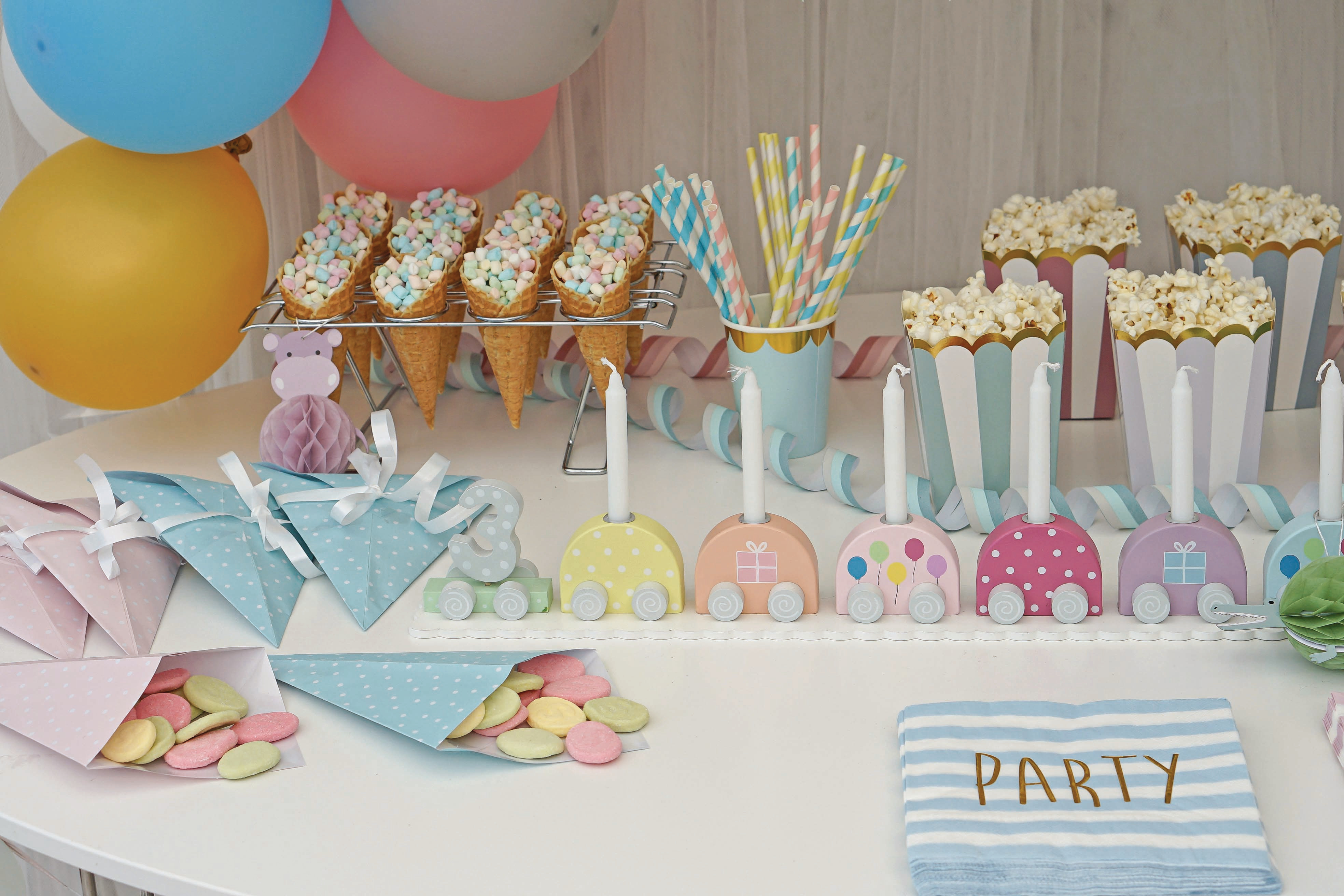 Train d'anniversaire avec locomotive et 7 wagons assortis avec des motifs différents et mignons. Le train est un superbe détail festif sur la table lors des fêtes et c'est un cadeau qui fera à coup sûr un tabac. Placez un chiffre entre 0 et 9 sur le dernier chariot, les chiffres sont inclus. Faites de ce train votre nouvelle tradition à sortir lors de toute fête ou célébration.
