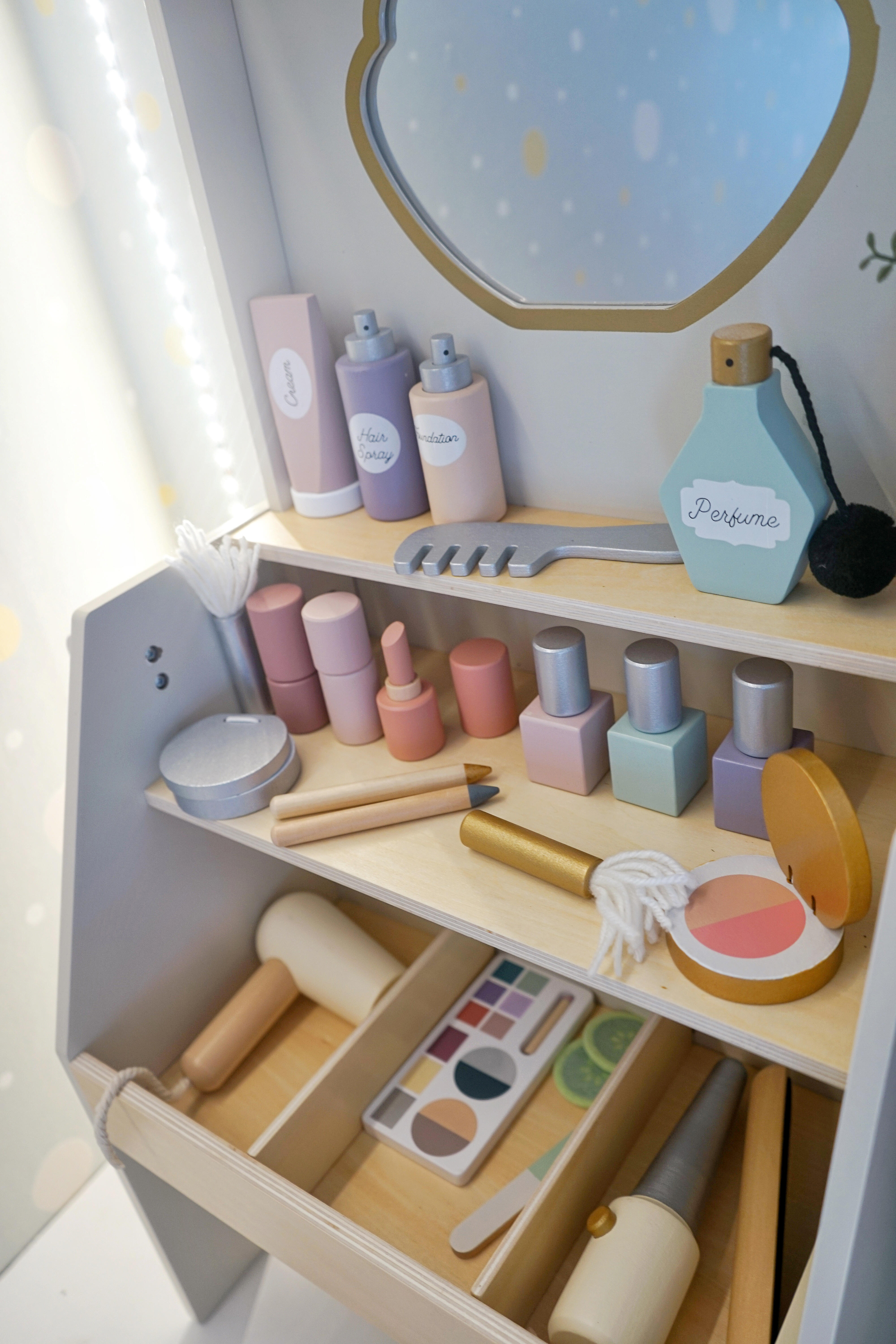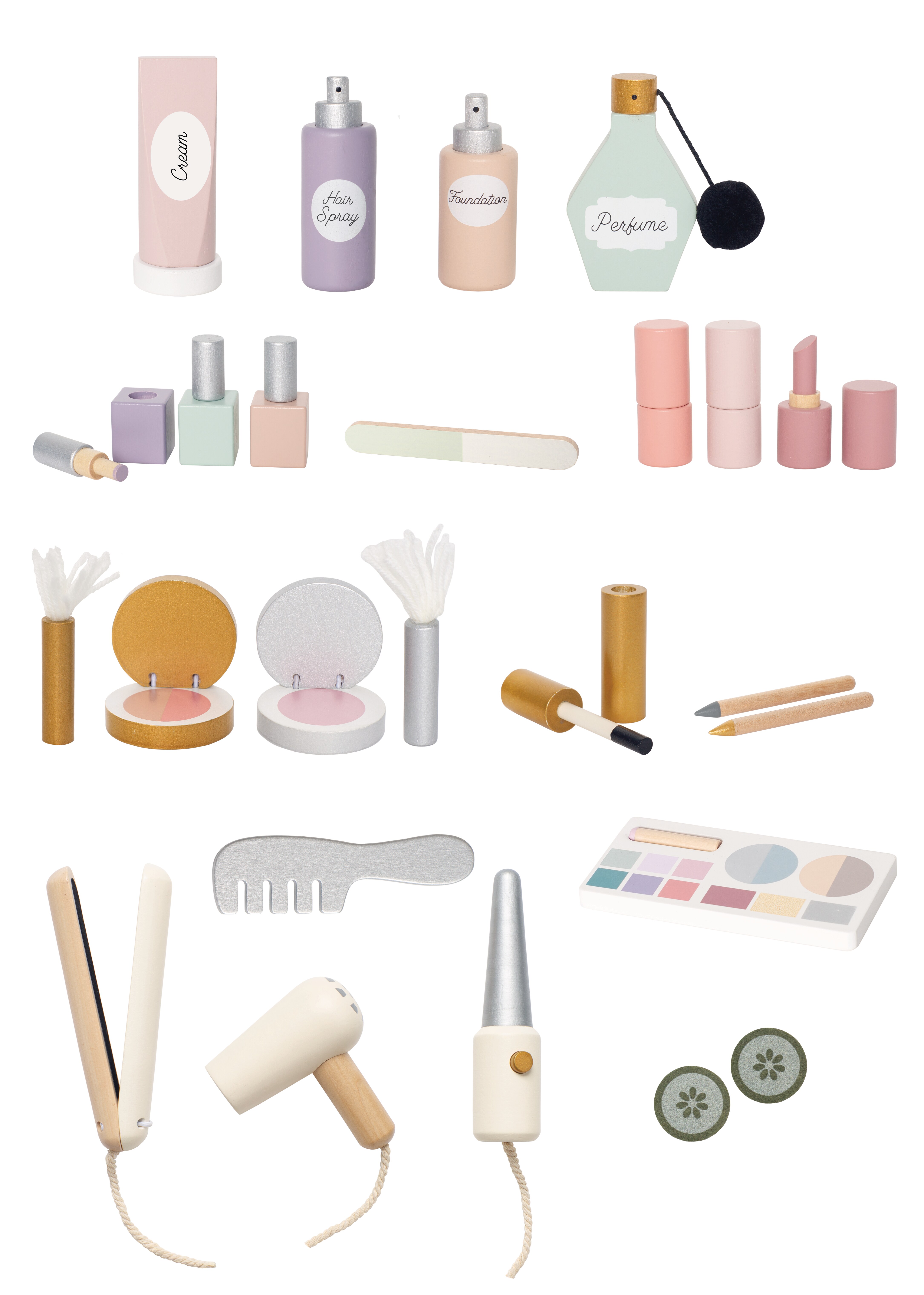 Bienvenue dans un salon de beauté vraiment luxueux ! Le salon de beauté en bois de Jabadabado est équipé de tout ce dont vous avez besoin pour ouvrir votre propre salon à la maison. Tous les accessoires sont fabriqués en bois pour ne pas s'effacer. Le salon de beauté est équipé de roues et de poignées pour pouvoir le déplacer facilement, et les deux étagères permettent de ranger tous les produits de maquillage et de coiffure. Au total, 26 accessoires différents et luxueux sont inclus. Garantit des heures d'occupation pour l'enfant. Encourage les jeux de rôle créatifs et seule l'imagination fixe les limites lorsque le jeu commence. 1x salon de beauté avec miroir, 1x peigne, 1x sèche-cheveux, 1x fer à lisser, 1x fer à friser, 1x laque, 1x fond de teint, 2x brosses, 1x lime à ongles, 3x vernis à ongles de différentes couleurs, 3x rouges à lèvres de différentes couleurs, 1x crème pour le visage, 2x rondelles de concombre.