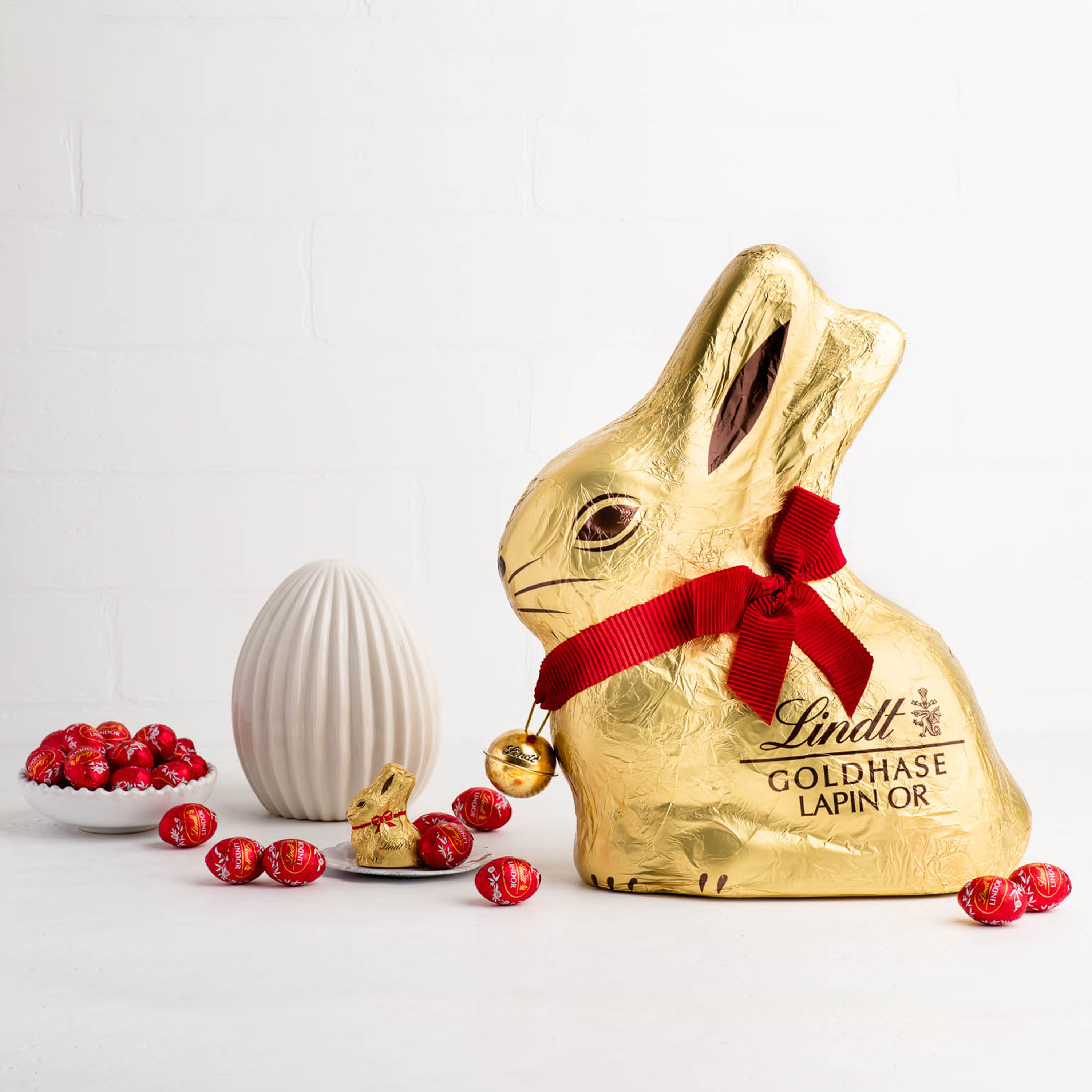 Offrez notre lait GOLDHASE 1kg - le must absolu parmi les cadeaux de Pâques ! Sans lui, Pâques serait impensable - dans le monde entier, le GOLDHASE de Lindt fait la joie des petits et des grands depuis plus de 70 ans déjà. Enveloppé avec précaution dans une feuille d'or de qualité supérieure et muni de sa clochette reconnaissable entre toutes et d'un ruban rouge, il entame chaque année son voyage de Pâques dans les nids du pays.