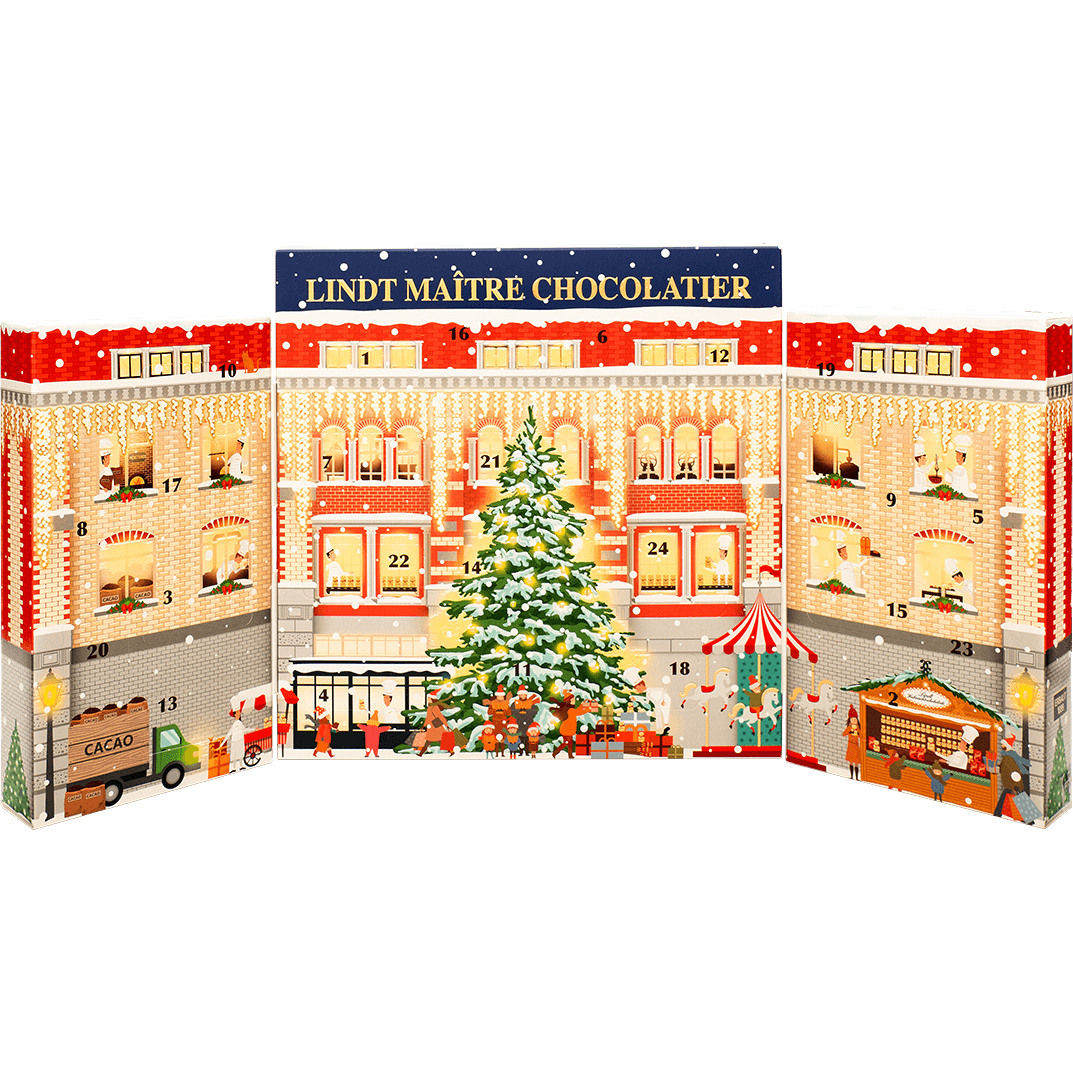 Dieser schön gestaltete Adventskalender von Lindt mit der Weihnachtsfabrik ist das ideale Geschenk zur Adventszeit. Alle 24 Türchen steigern mit feinstem Schokoladengenuss Tag für Tag die Vorfreude bei grossen und kleinen Geniessern. Hinter jedem Türchen wartet eine Überraschung. Inhalt: 4 LINDOR Kugeln Milch, 4 LINDOR Kugeln Surfin, 4 LINDOR Kugeln Caramel, 3 LINDOR Kugeln Haselnuss, 3 LINDOR Kugeln Salted Caramel, 3 LINDOR Kugeln Weiss, 1 Mini Samichlaus, 1 Mini TEDDY, 1 Mini Engel, 1 LINDOR Herz Milch