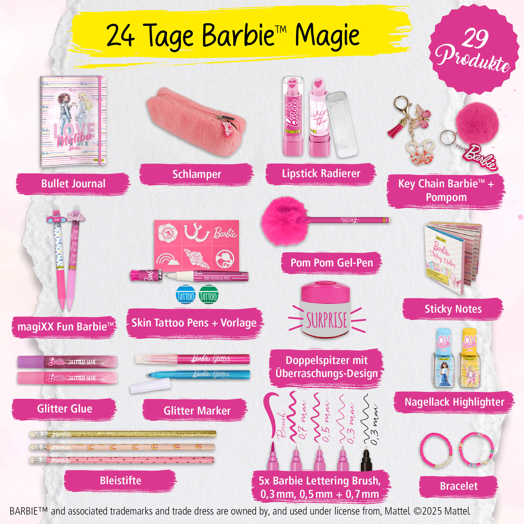 - >28produits dans le style Barbie : avec des stylos gel, des paillettes, des bracelets, des porte-clés, des stylos à tatouer et bien d'autres goodies, ce calendrier de l'Avent exceptionnel contient tout ce dont les petits rêveurs ont besoin pour faire vivre jour après jour leur propre univers Barbie avec des accessoires DIY créatifs.