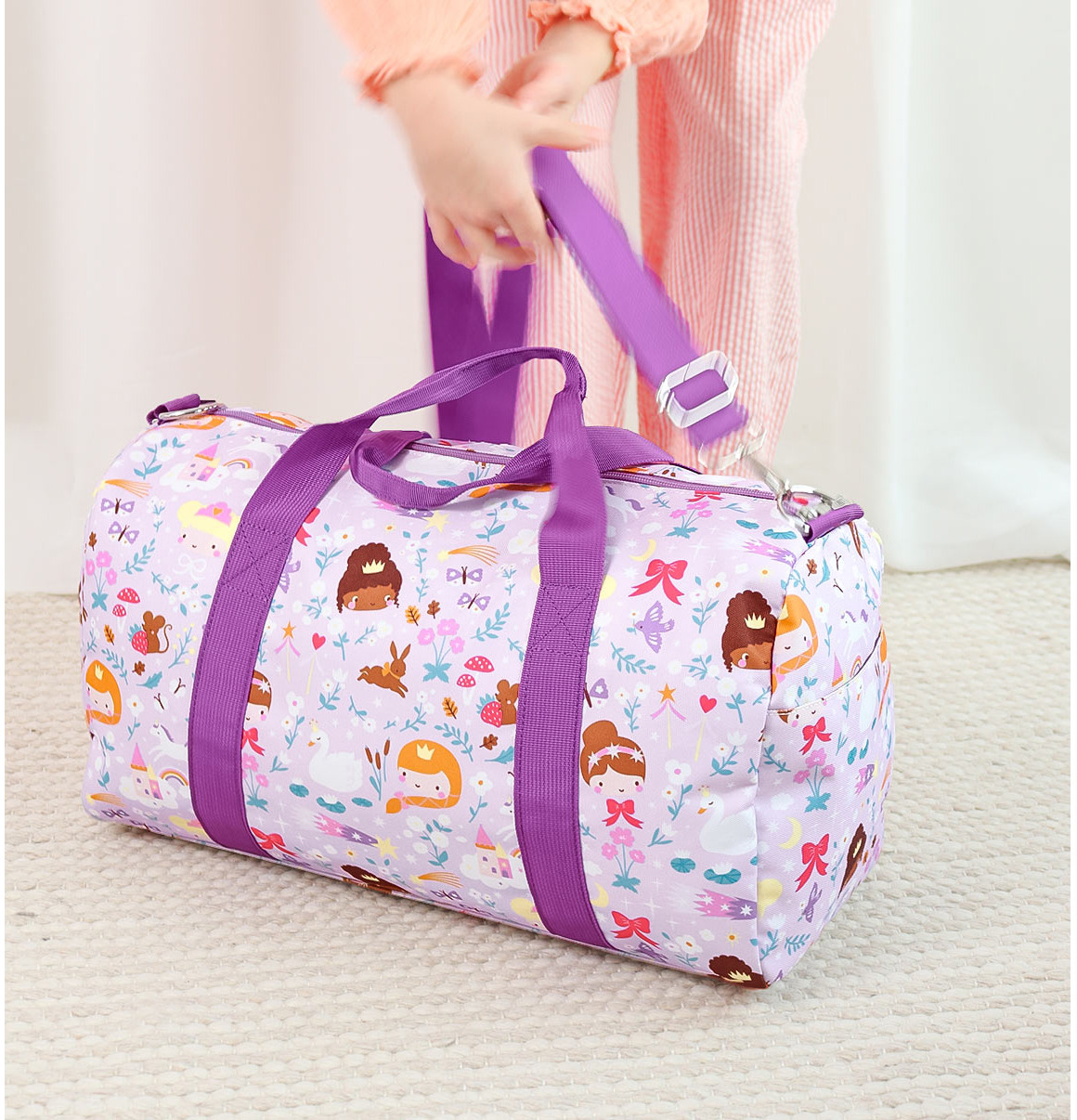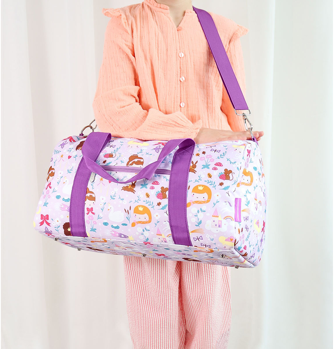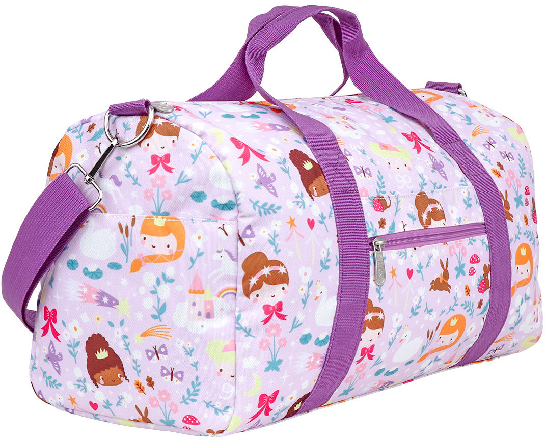 Le spacieux sac de week-end avec des princesses est idéal pour les vacances ou une soirée pyjama. La répartition du sac comprend un compartiment principal avec une poche supplémentaire, deux poches latérales et une poche zippée à l'avant. Le sac est doté de rivets en bas, d'une double poignée et d'une bandoulière réglable et amovible. En outre, le sac est également idéal comme sac de sport. Convient comme bagage à main (vérifiez toujours les directives de la compagnie aérienne).