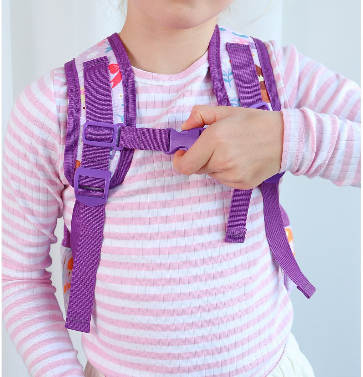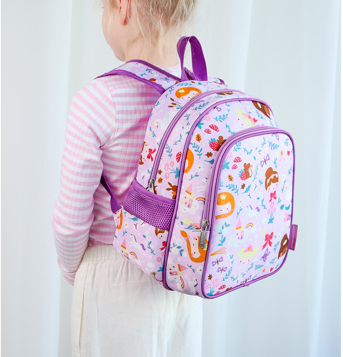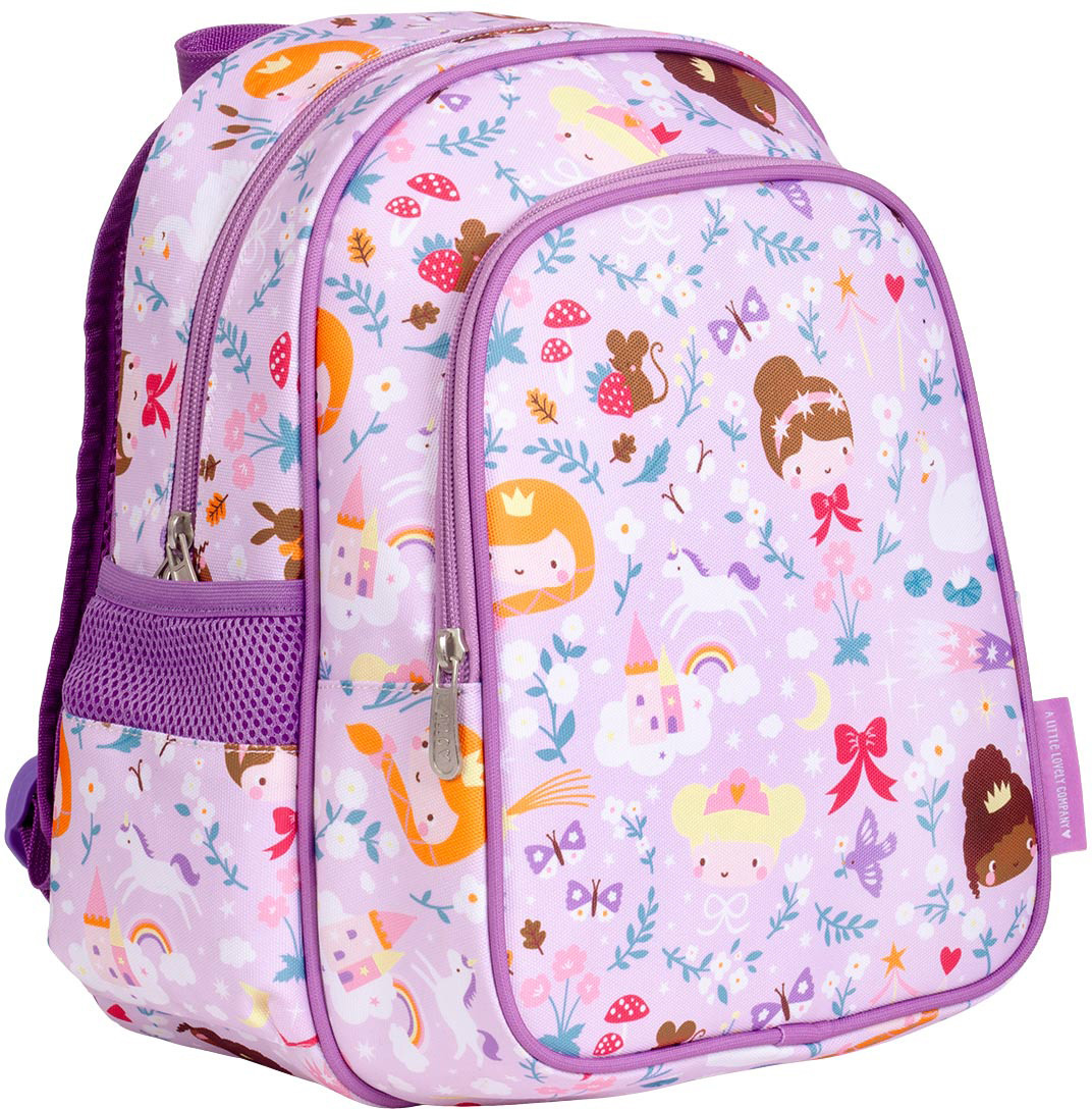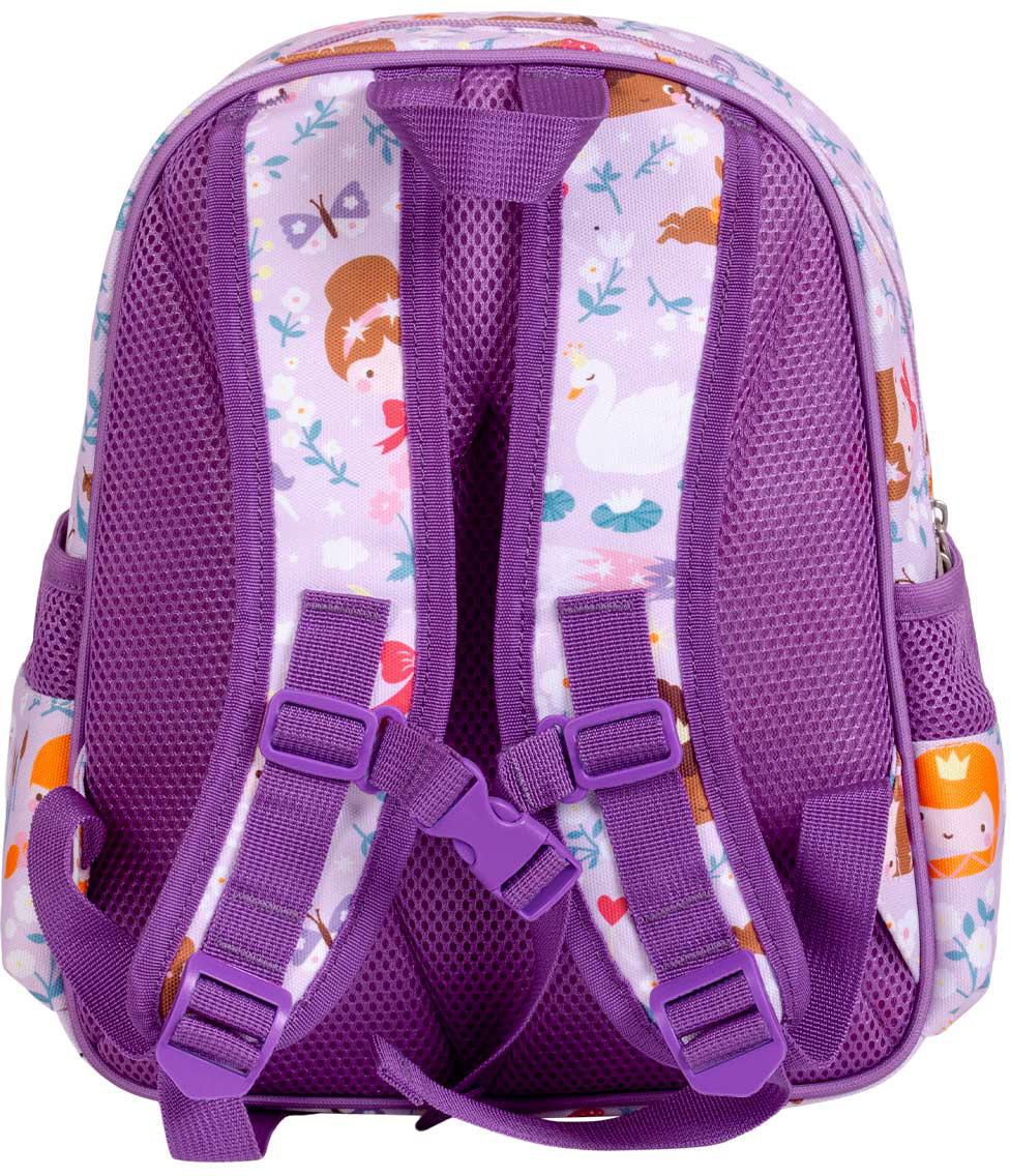 Der praktische violette Rucksack mit Prinzessinnen und vielen süssen Details ist ideal für die Schule oder für Ausflüge. Der Kinderrucksack hat ein geräumiges Hauptfach, eine isolierte Fronttasche und zwei offene Seitentaschen; gross genug für eine Brotdose, ein Pausenbrot und eine Wasserflasche. Der Rucksack hat gepolsterte Schultergurte und einen Brustgurt, so dass er nicht so leicht von den Schultern rutscht. Die Rückenpartie ist mit einem atmungsaktiven Stoff gefüttert, der für zusätzlichen Komfort sorgt.
