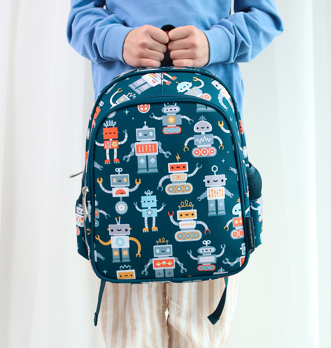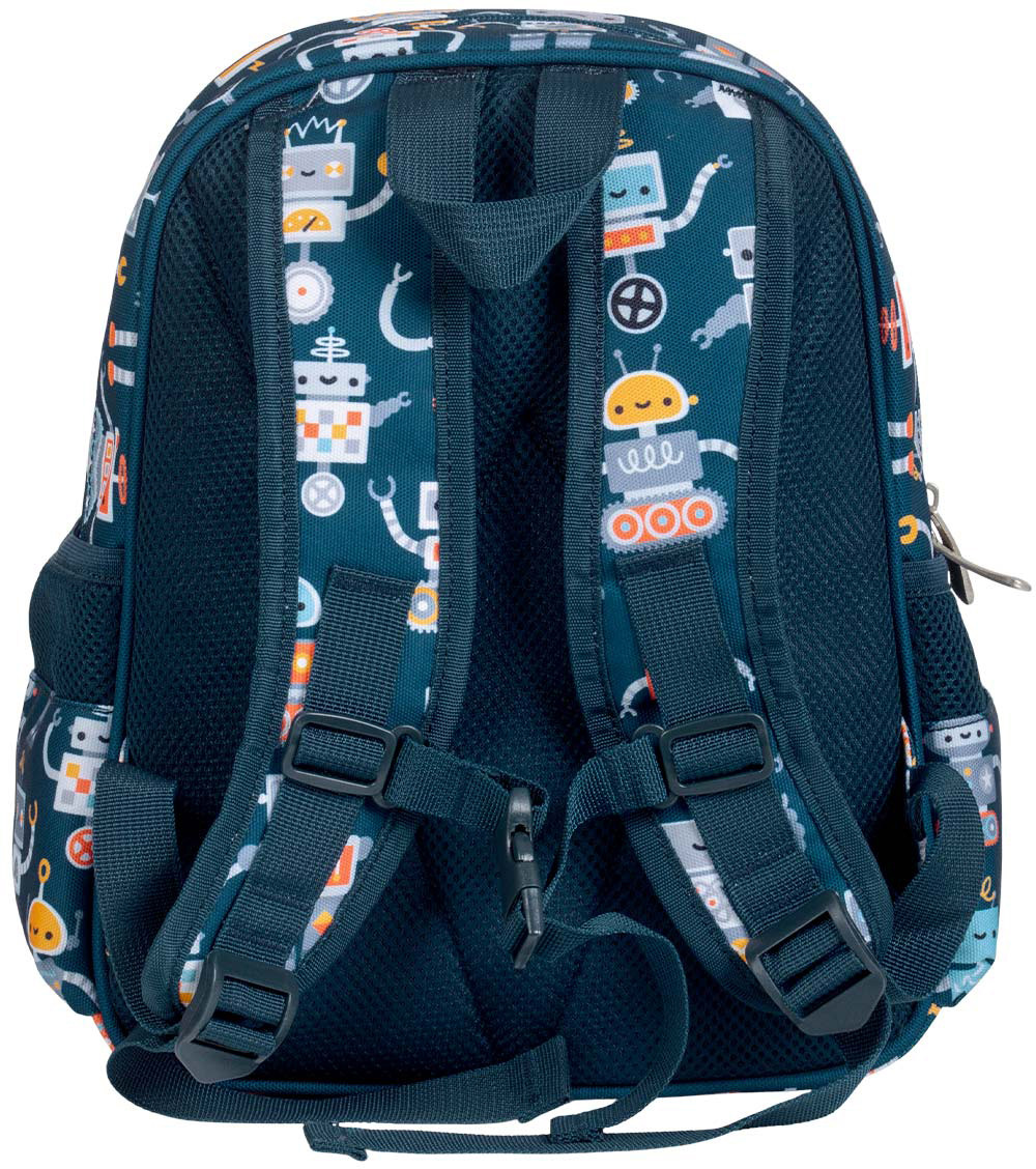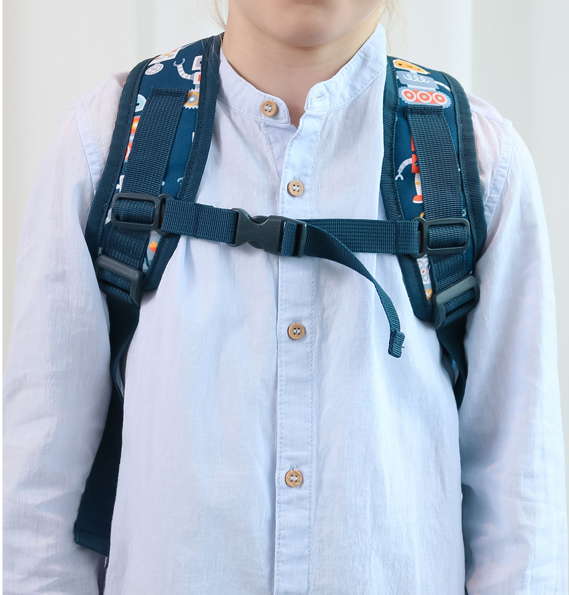 Der praktische dunkelblaue Rucksack mit Robotern Details ist ideal für die Schule oder für Ausflüge. Der Kinderrucksack hat ein geräumiges Hauptfach, eine isolierte Fronttasche und zwei offene Seitentaschen; gross genug für eine Brotdose, ein Pausenbrot und eine Wasserflasche. Der Rucksack hat gepolsterte Schultergurte und einen Brustgurt, so dass er nicht so leicht von den Schultern rutscht. Die Rückenpartie ist mit einem atmungsaktiven Stoff gefüttert, der für zusätzlichen Komfort sorgt.