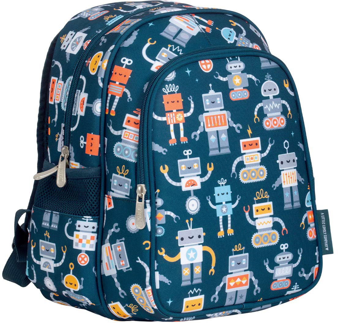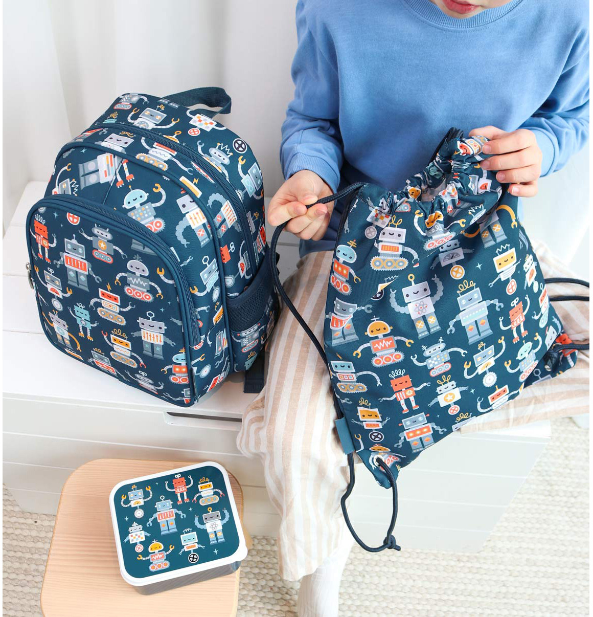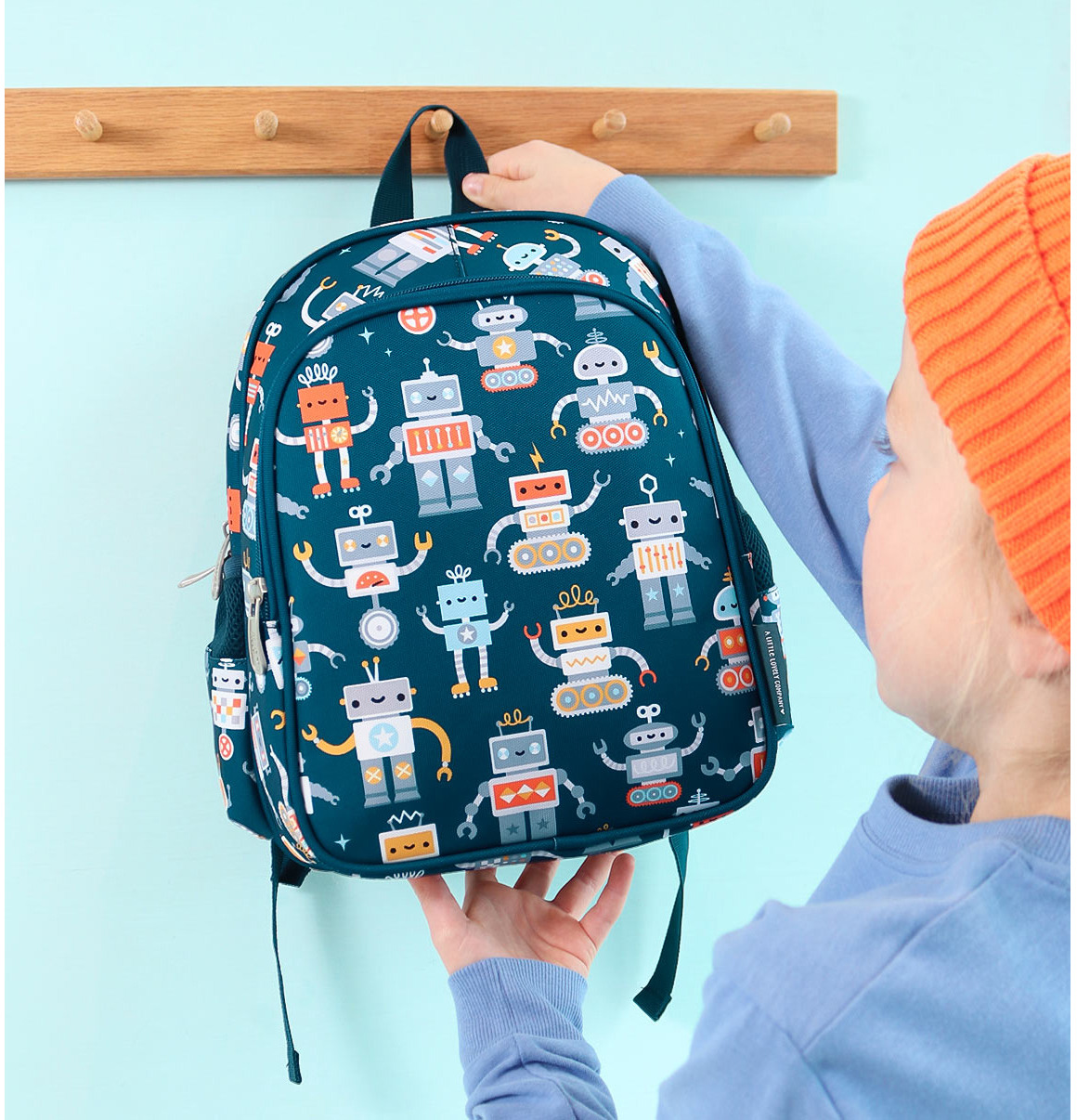 Der praktische dunkelblaue Rucksack mit Robotern Details ist ideal für die Schule oder für Ausflüge. Der Kinderrucksack hat ein geräumiges Hauptfach, eine isolierte Fronttasche und zwei offene Seitentaschen; gross genug für eine Brotdose, ein Pausenbrot und eine Wasserflasche. Der Rucksack hat gepolsterte Schultergurte und einen Brustgurt, so dass er nicht so leicht von den Schultern rutscht. Die Rückenpartie ist mit einem atmungsaktiven Stoff gefüttert, der für zusätzlichen Komfort sorgt.