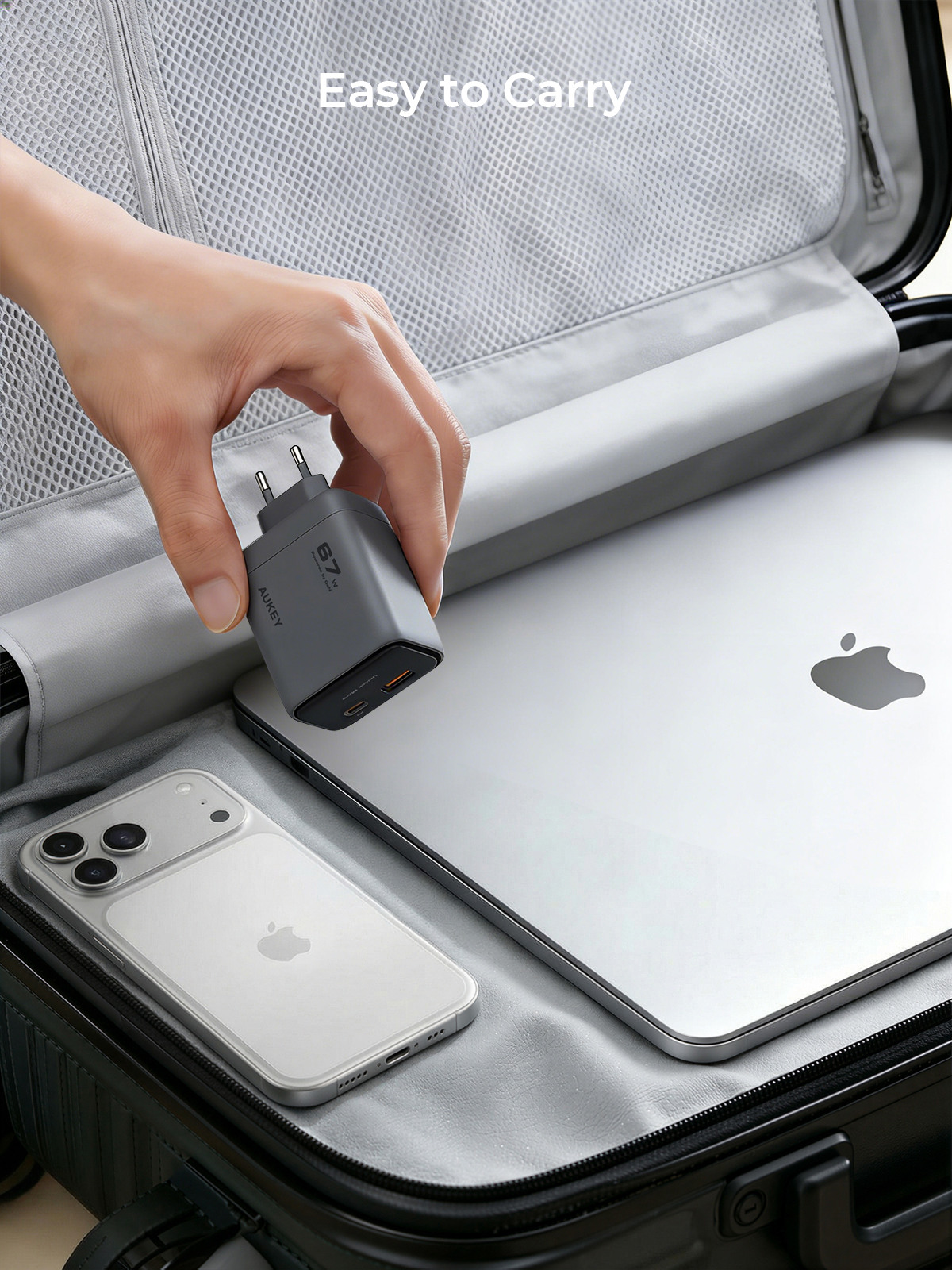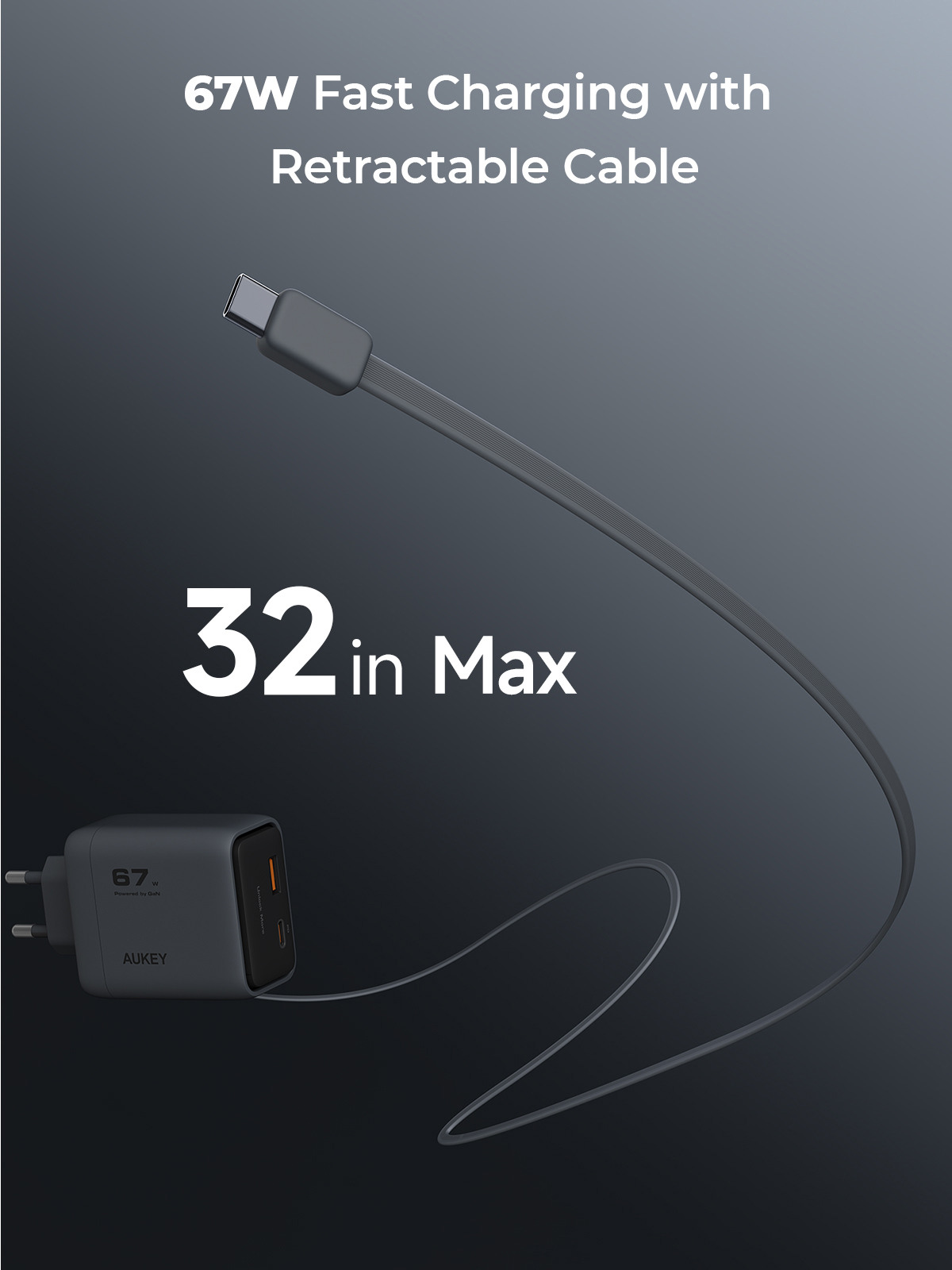 - Idéal pour les déplacements : le chargeur compact ne s'emmêle pas, est facile à transporter et se glisse parfaitement dans une poche ou un bagage à main. Bien que le câble rétractable occupe une partie de l'espace intérieur, il n'est que 25 % plus grand qu'un chargeur 67 W classique.