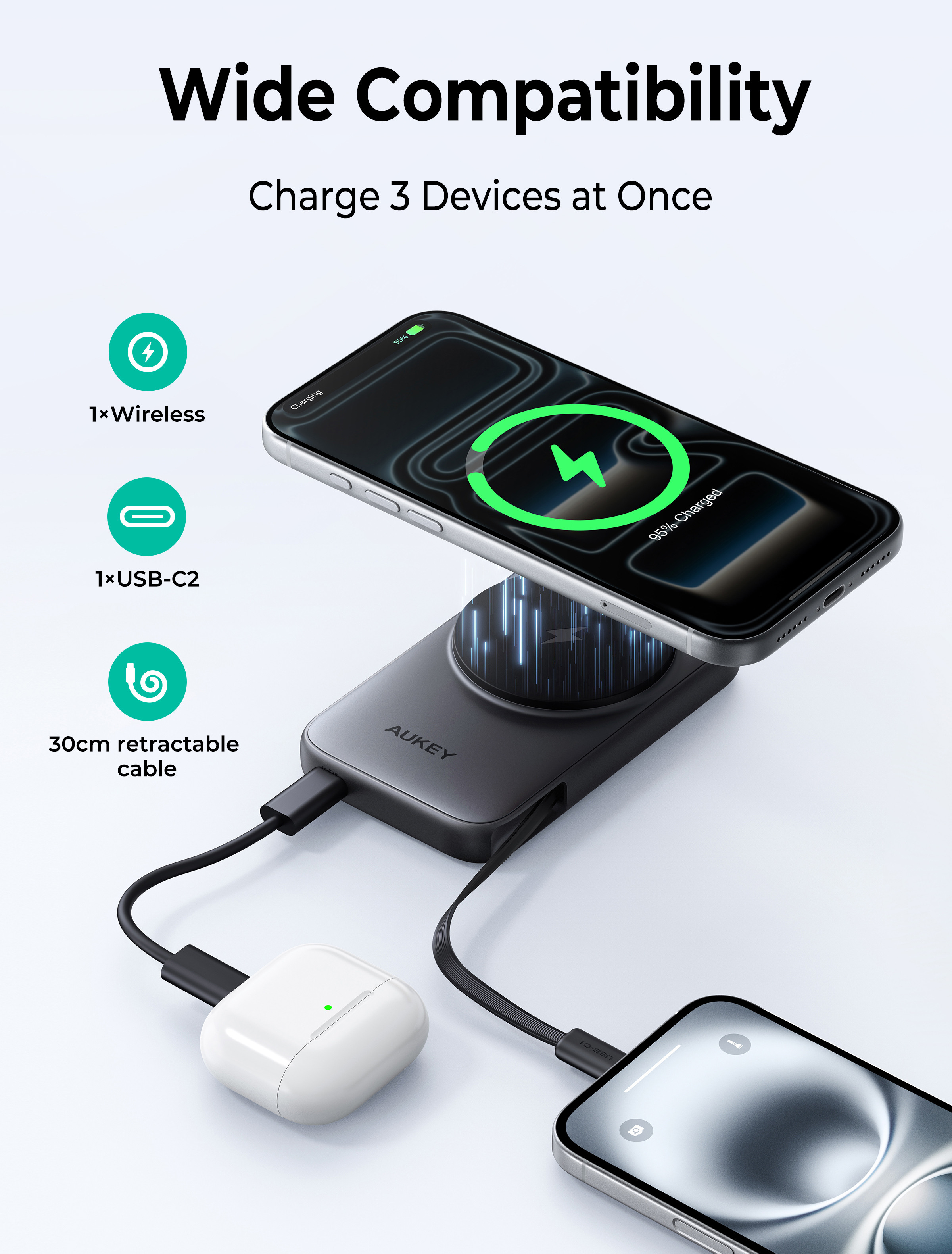 AUKEY MagFusion Slim 10000mAh PB-MS08 SW Powerbank Qi2 Wireless,White
