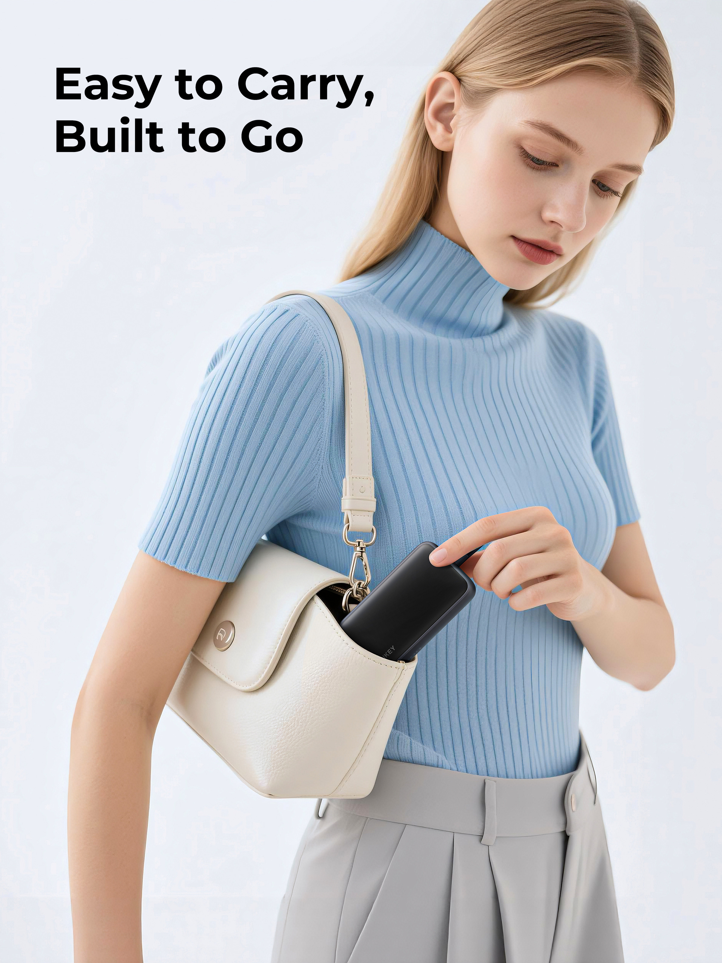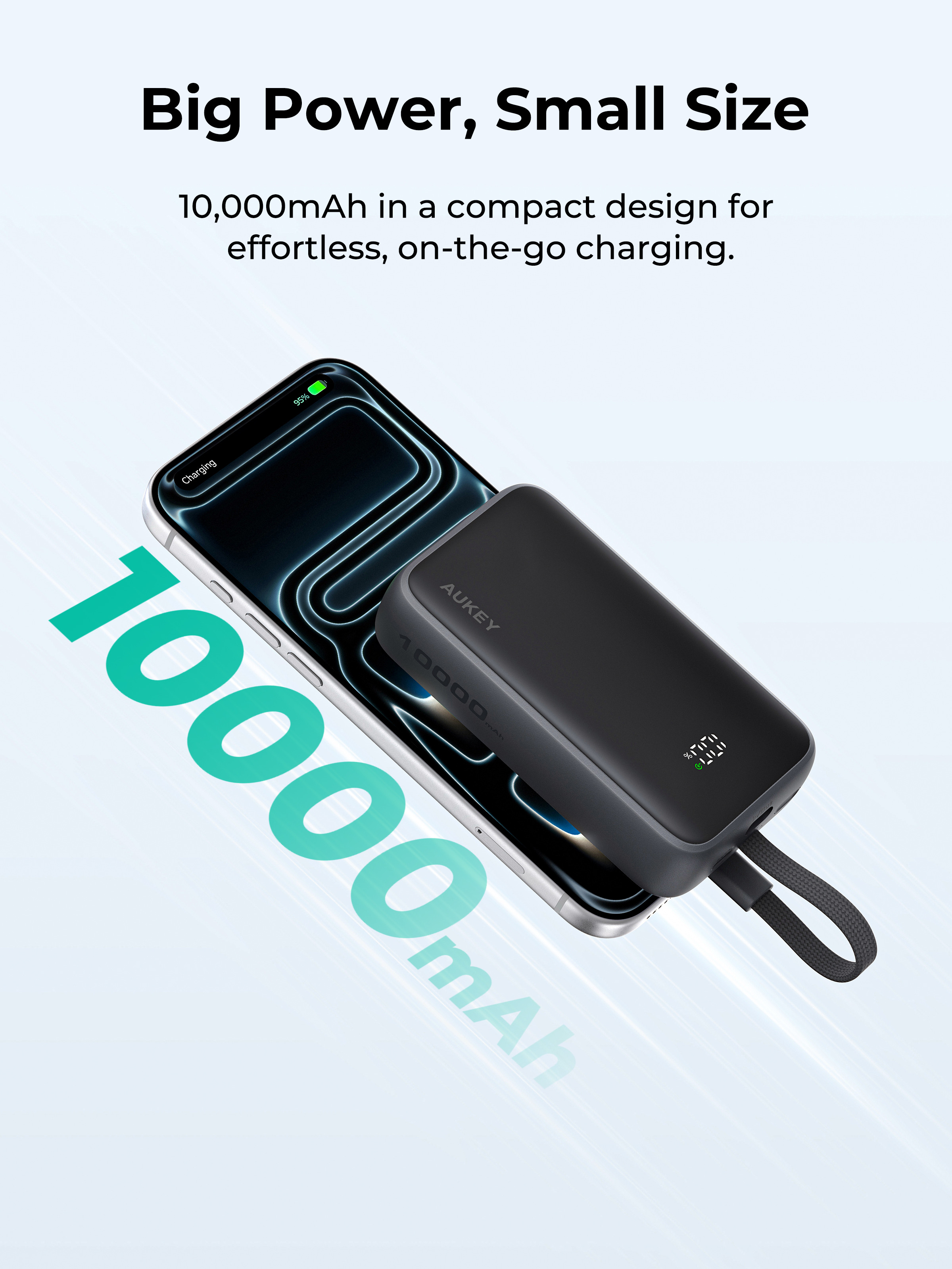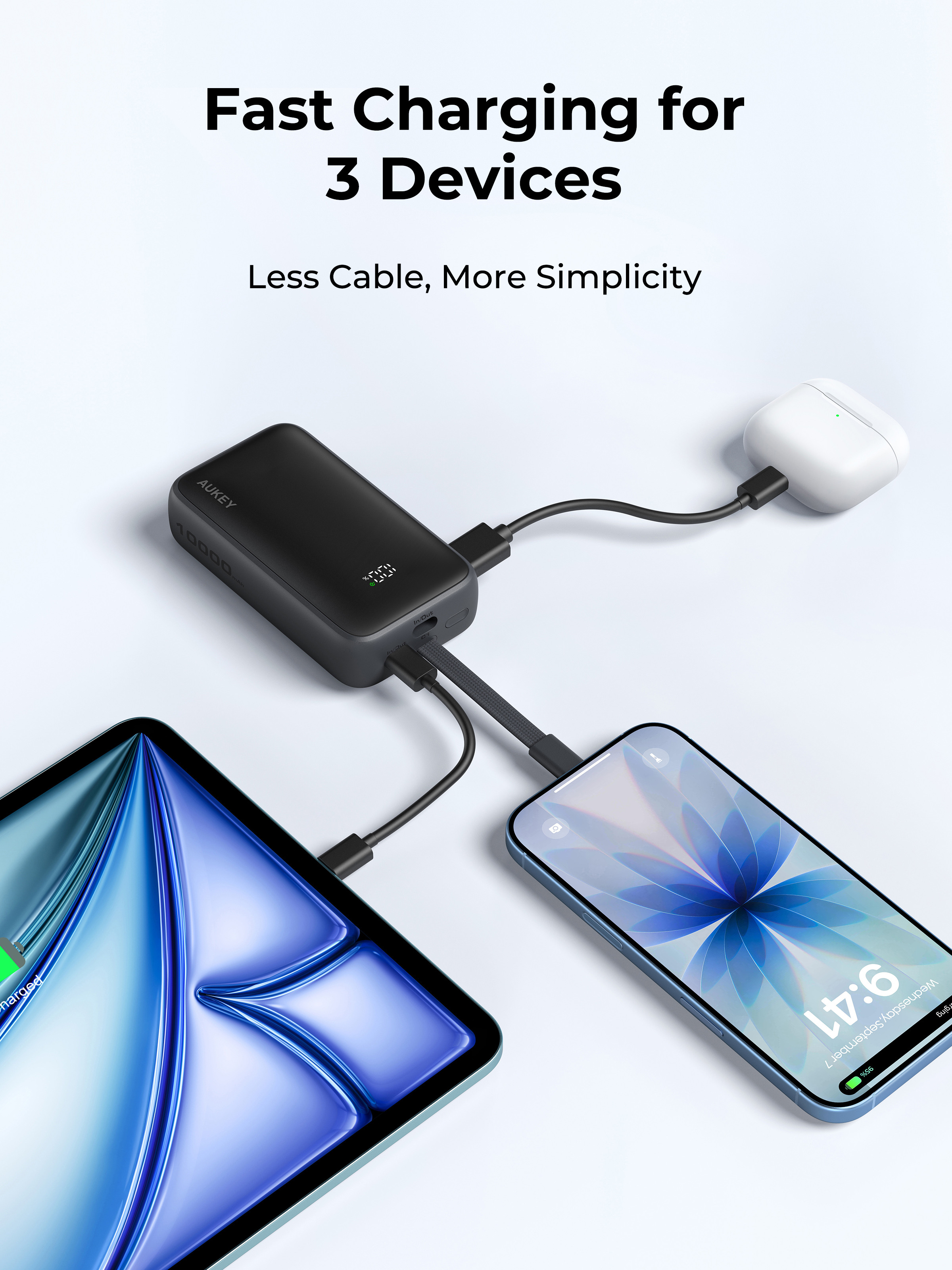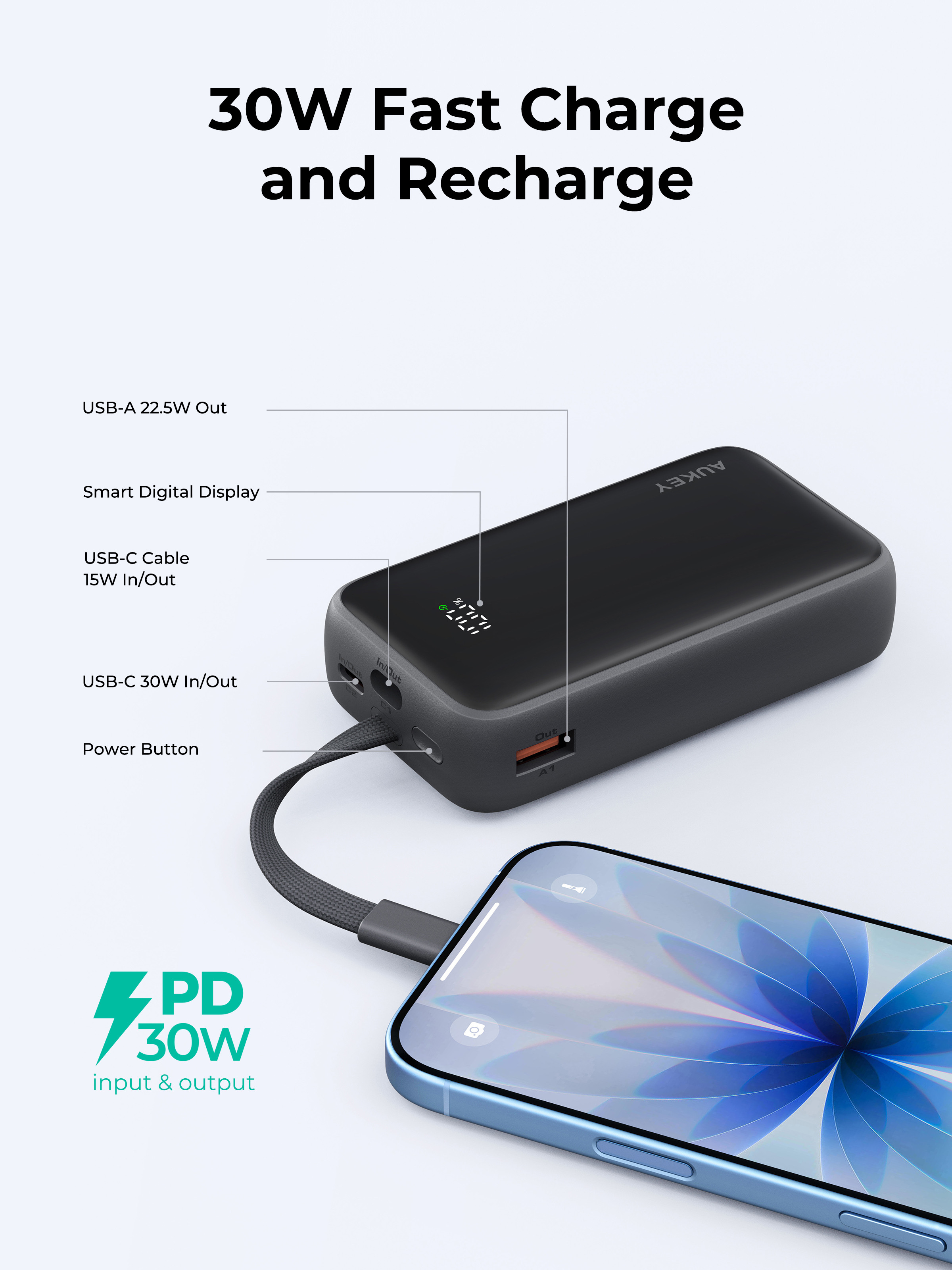 - Chargement et rechargement rapides de 30 W : Avec une puissance de sortie et d'entrée maximale de 30 W, cette banque d'énergie prend en charge le chargement rapide de différents appareils intelligents et se recharge elle-même rapidement, soit via le câble rétractable intégré, soit via le port USB-C. C'est pratique et idéal pour une charge continue.