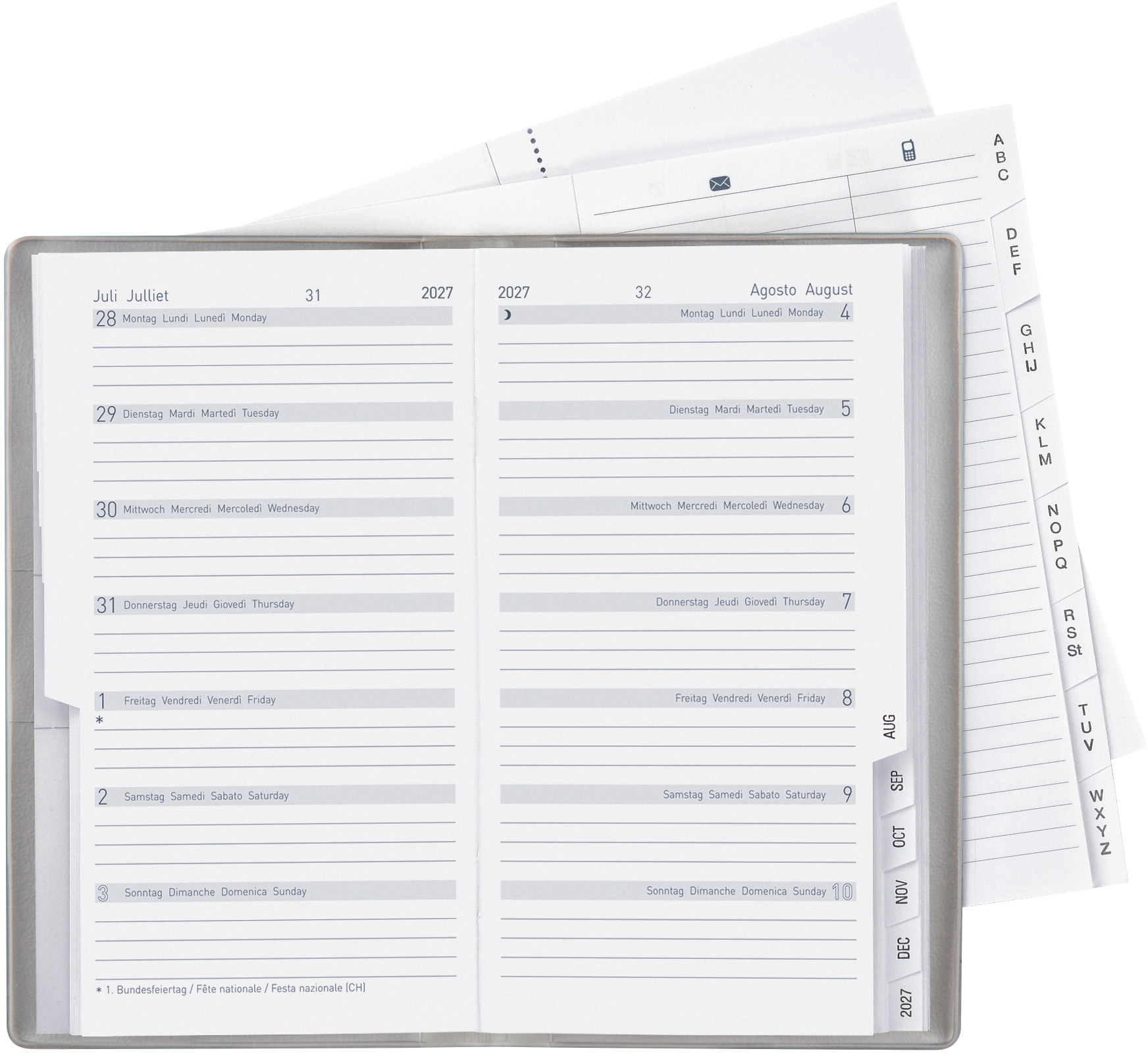 L'agenda Biella Bern est le mieux adapté aux "grands écrivains" avec son calendrier d'une semaine par page. Comme d'habitude, l'agenda contient également un répertoire d'adresses et du papier pour prendre des notes.