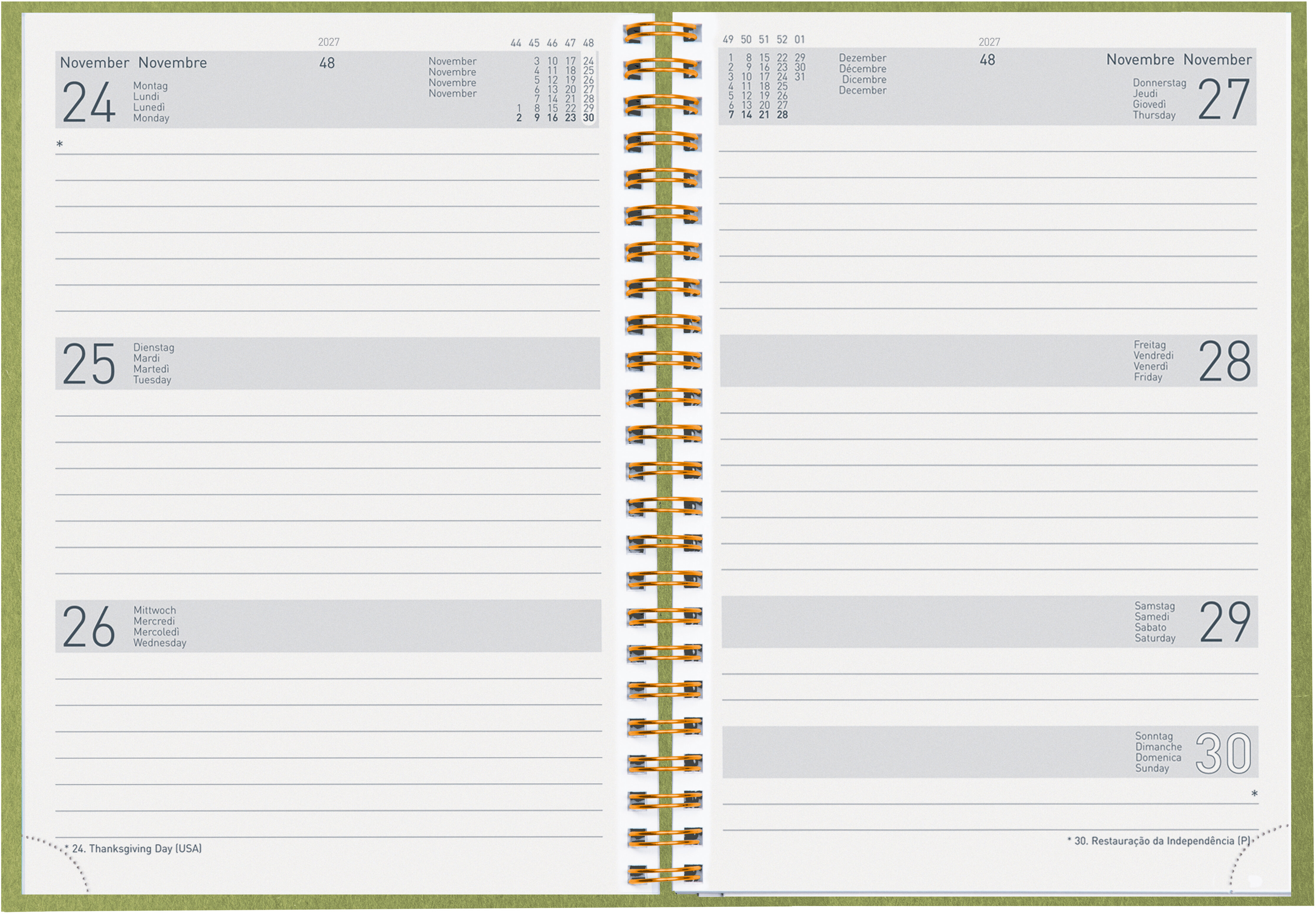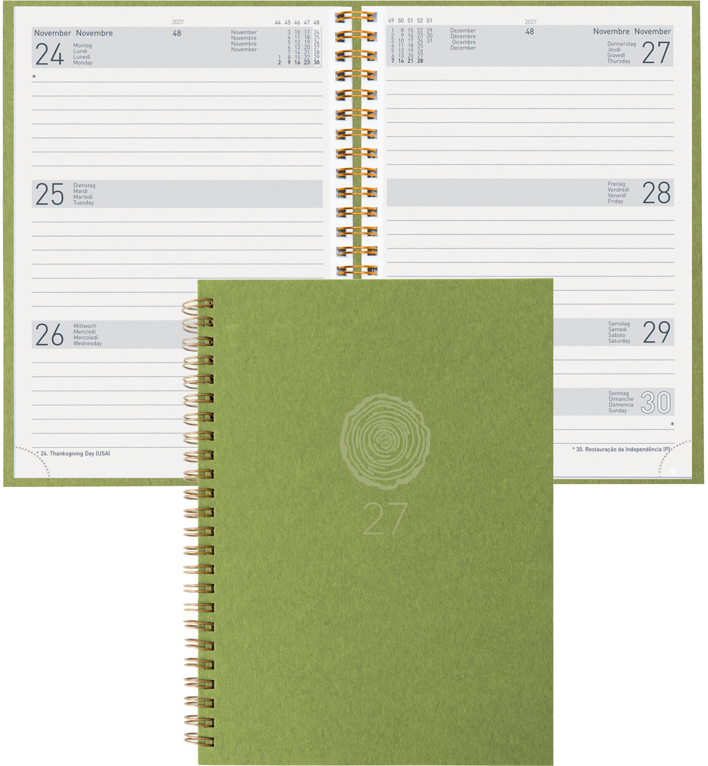 L'agenda professionnel Dispo Term Natural Wire-O de Biella est un support de planification bien pensé pour l'année 2027. Il offre une vue hebdomadaire pratique sur deux pages, ce qui permet d'organiser clairement les rendez-vous et les tâches. La couverture est en carton recyclé, ce qui est non seulement respectueux de l'environnement, mais offre également un toucher agréable.