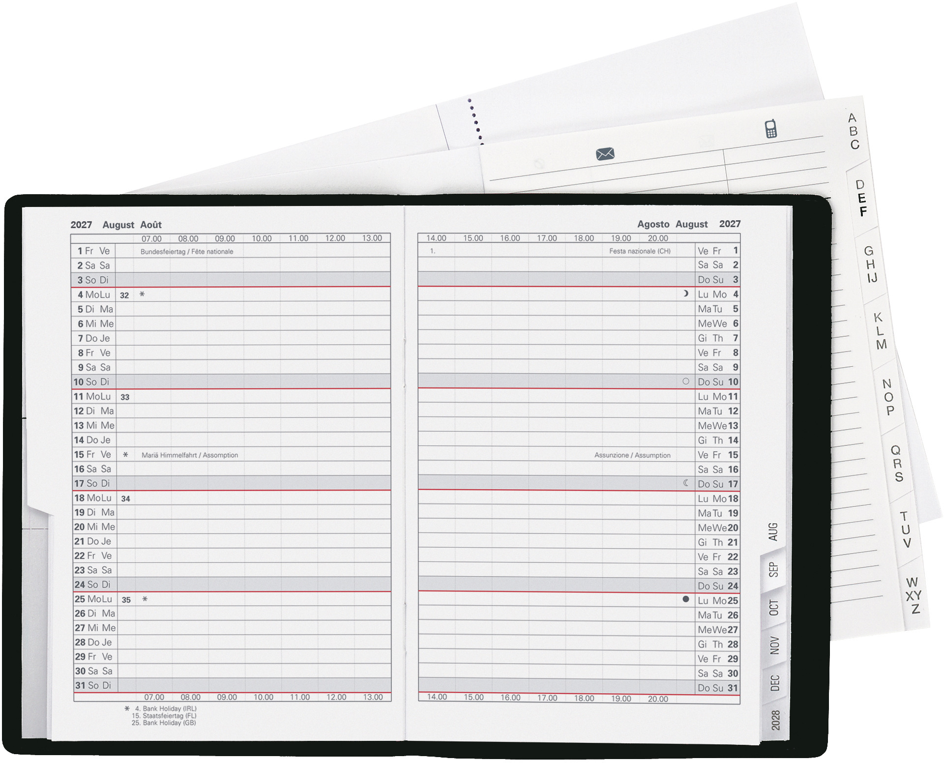L'agenda Glasgow de Biella convient aux utilisateurs qui ont besoin de plus de place et contient un calendrier 1 mois sur deux pages. Comme d'habitude, l'agenda contient en outre un répertoire d'adresses interchangeable de 16 pages et du papier pour notes.