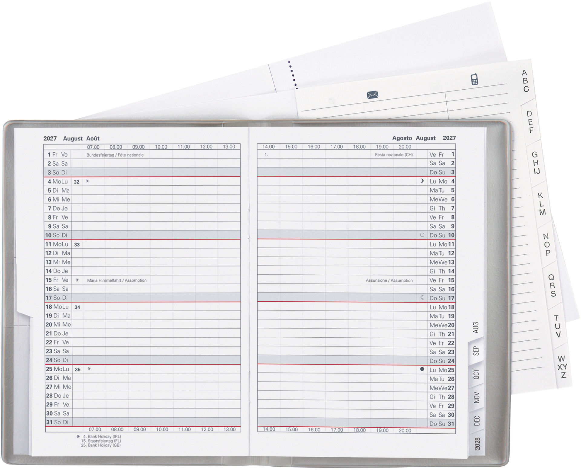 L'agenda Glasgow de Biella convient aux utilisateurs qui ont besoin de plus de place et contient un calendrier 1 mois sur deux pages. Comme d'habitude, l'agenda contient également 16 pages interchangeables.
