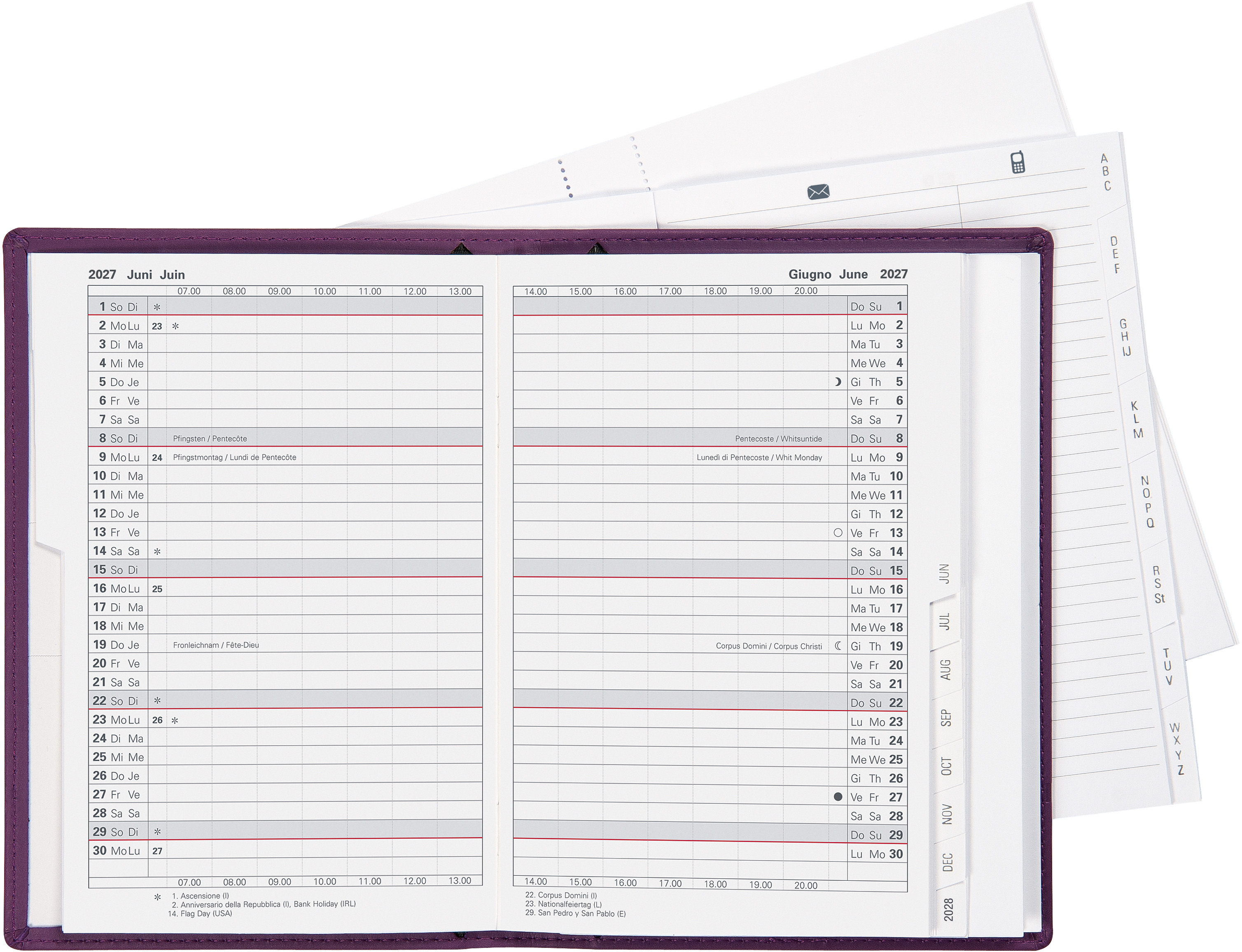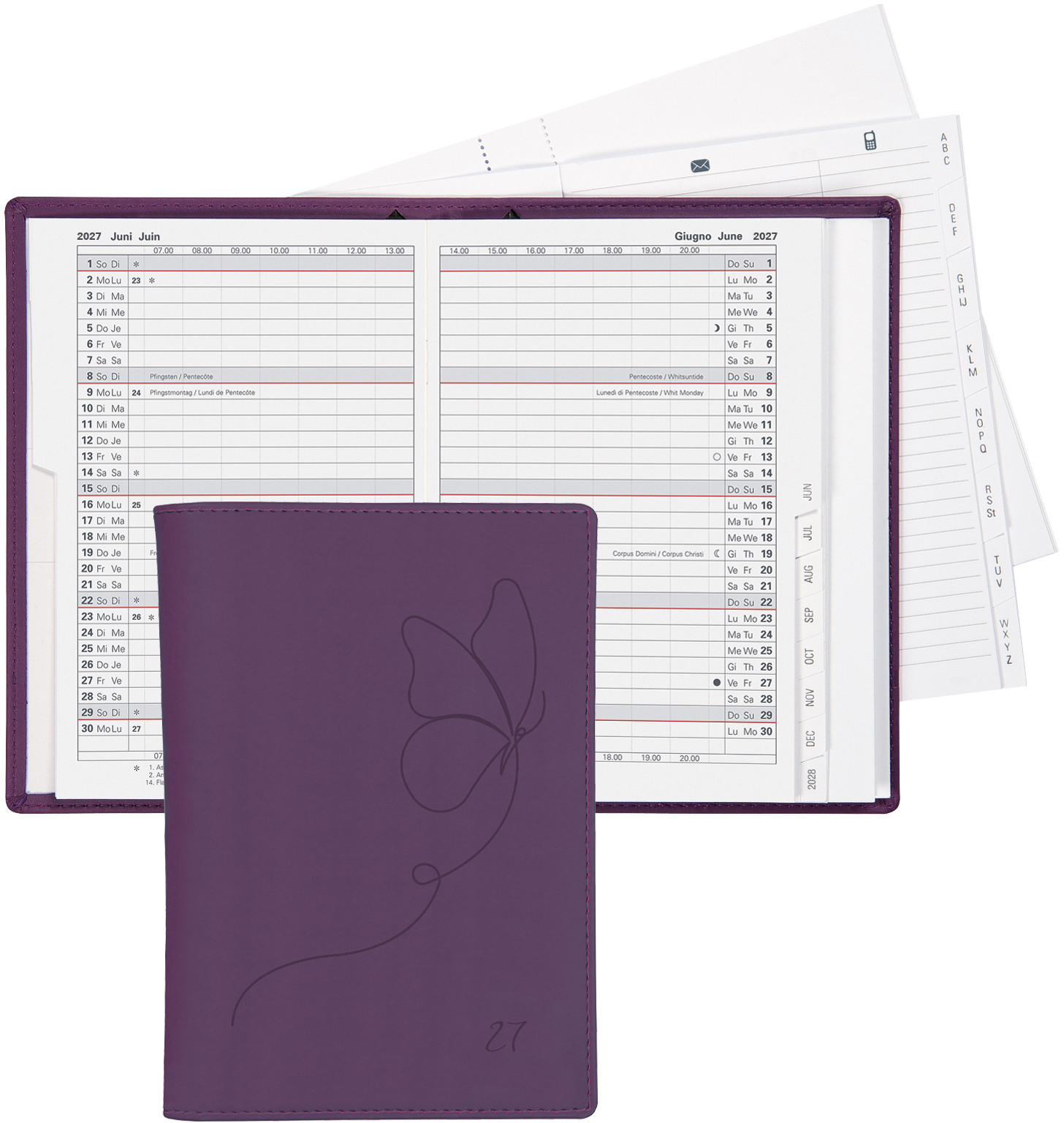 Le Ladyplaner Istanbul de Biella convient à l'utilisatrice soucieuse de la mode et ayant besoin d'un espace généreux. Il contient un calendrier 1 mois sur deux pages, et comme d'habitude, l'agenda contient également un registre d'adresses et du papier pour prendre des notes.