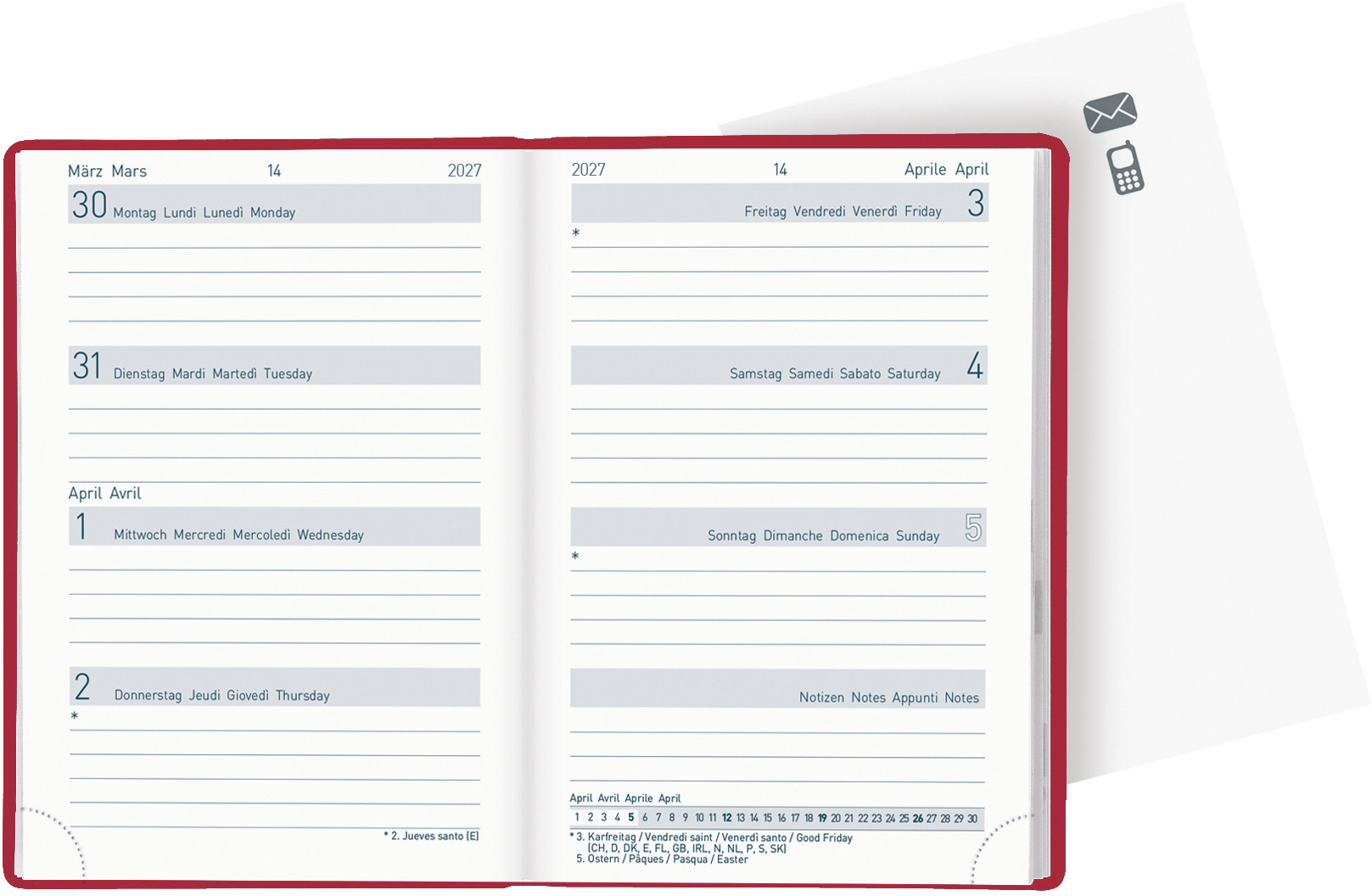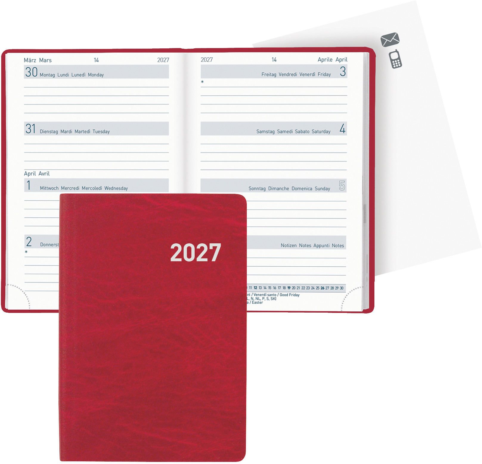 L'agenda de poche Biella est parfaitement adapté à un usage privé. Notre agenda de poche avec 1 semaine par page est pratique, se glisse dans une poche et vous donne un aperçu de vos rendez-vous hebdomadaires.