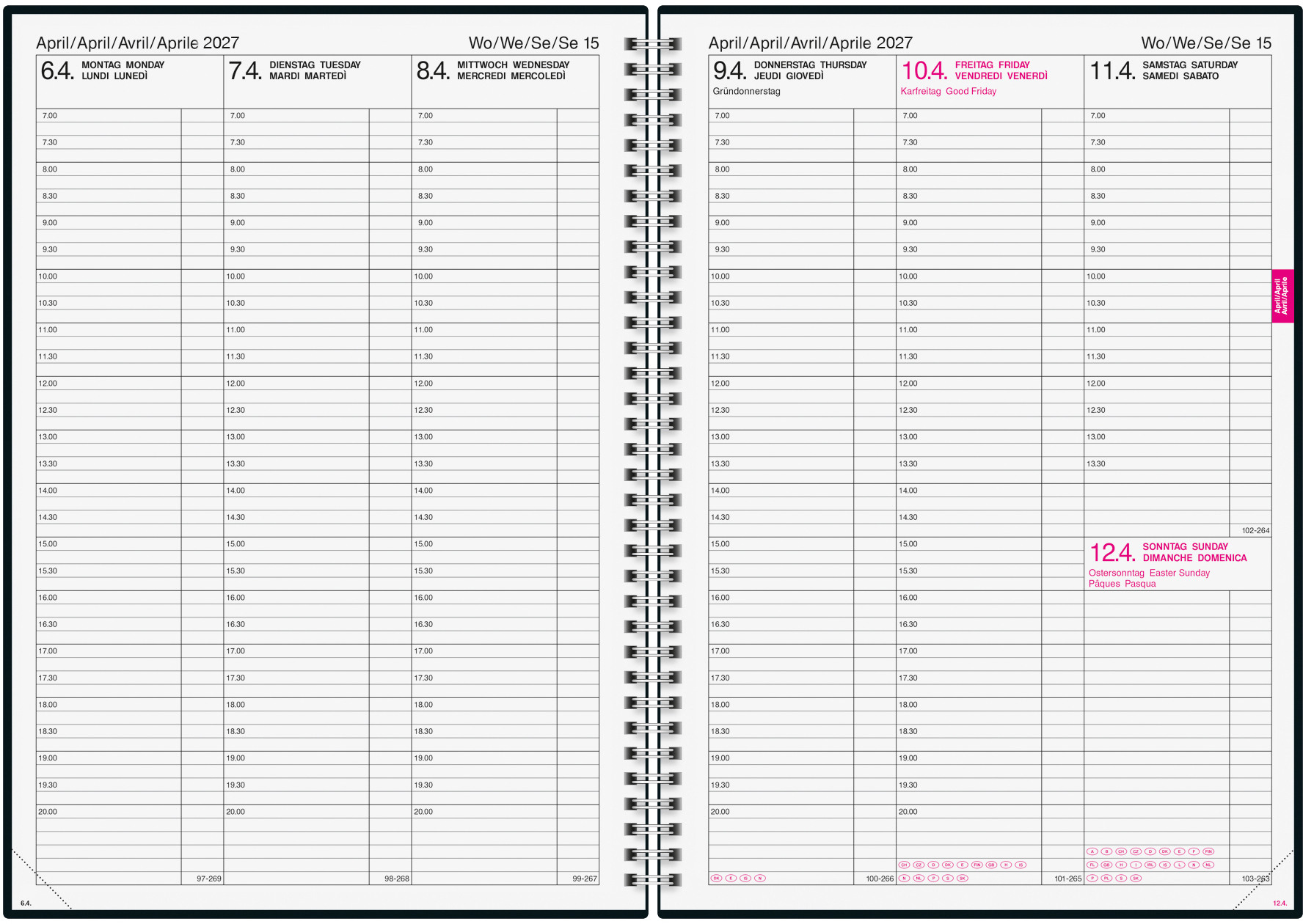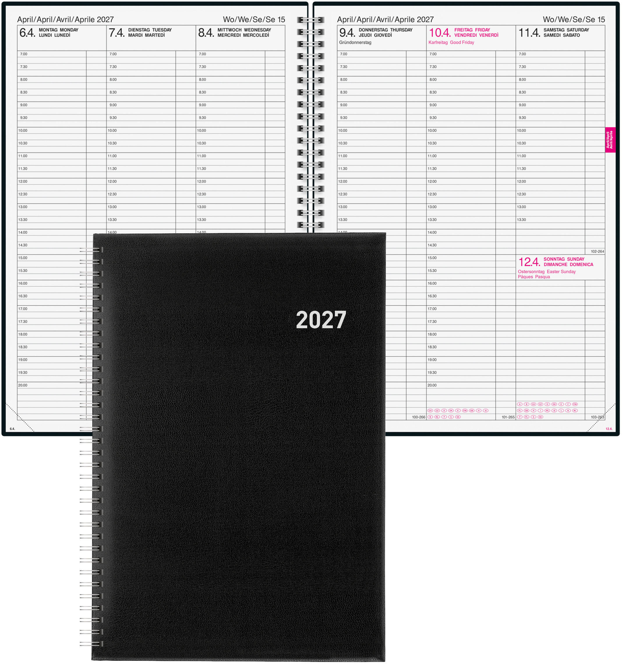 L'agenda professionnel est idéal pour planifier dans les moindres détails. L'agenda professionnel avec 1 semaine sur 2 pages et une répartition horaire prédéfinie garantit une organisation parfaite. Idéal pour les cabinets médicaux et les utilisateurs qui ont besoin de plusieurs heures de travail.