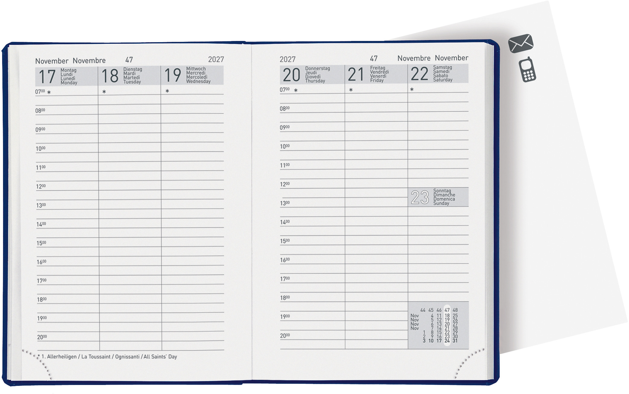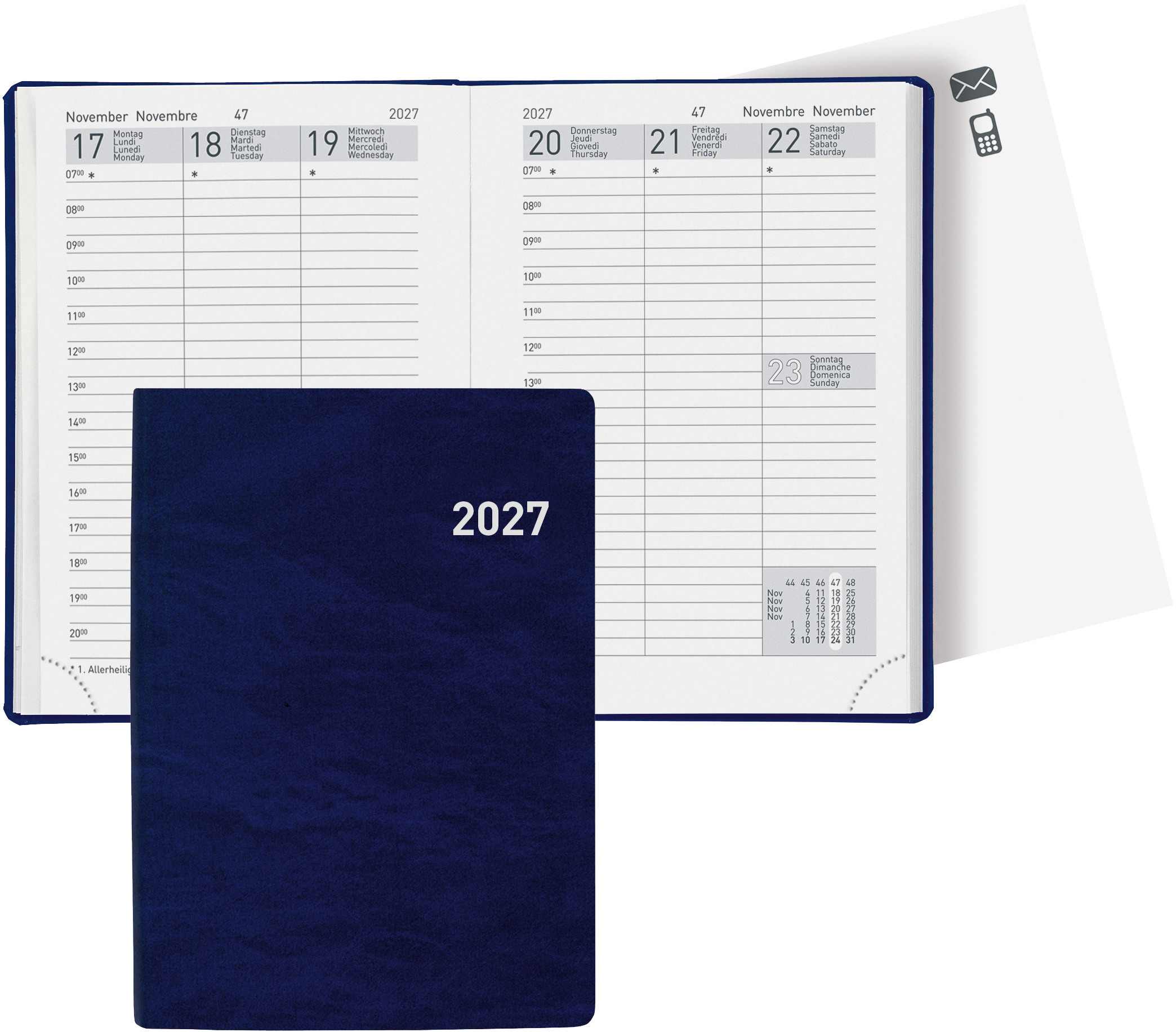 L'agenda de poche Biella est parfaitement adapté à un usage privé. Notre agenda de poche avec 1 semaine sur deux pages est pratique, se glisse dans une poche et vous offre une précision dans votre planification grâce à la répartition des heures.