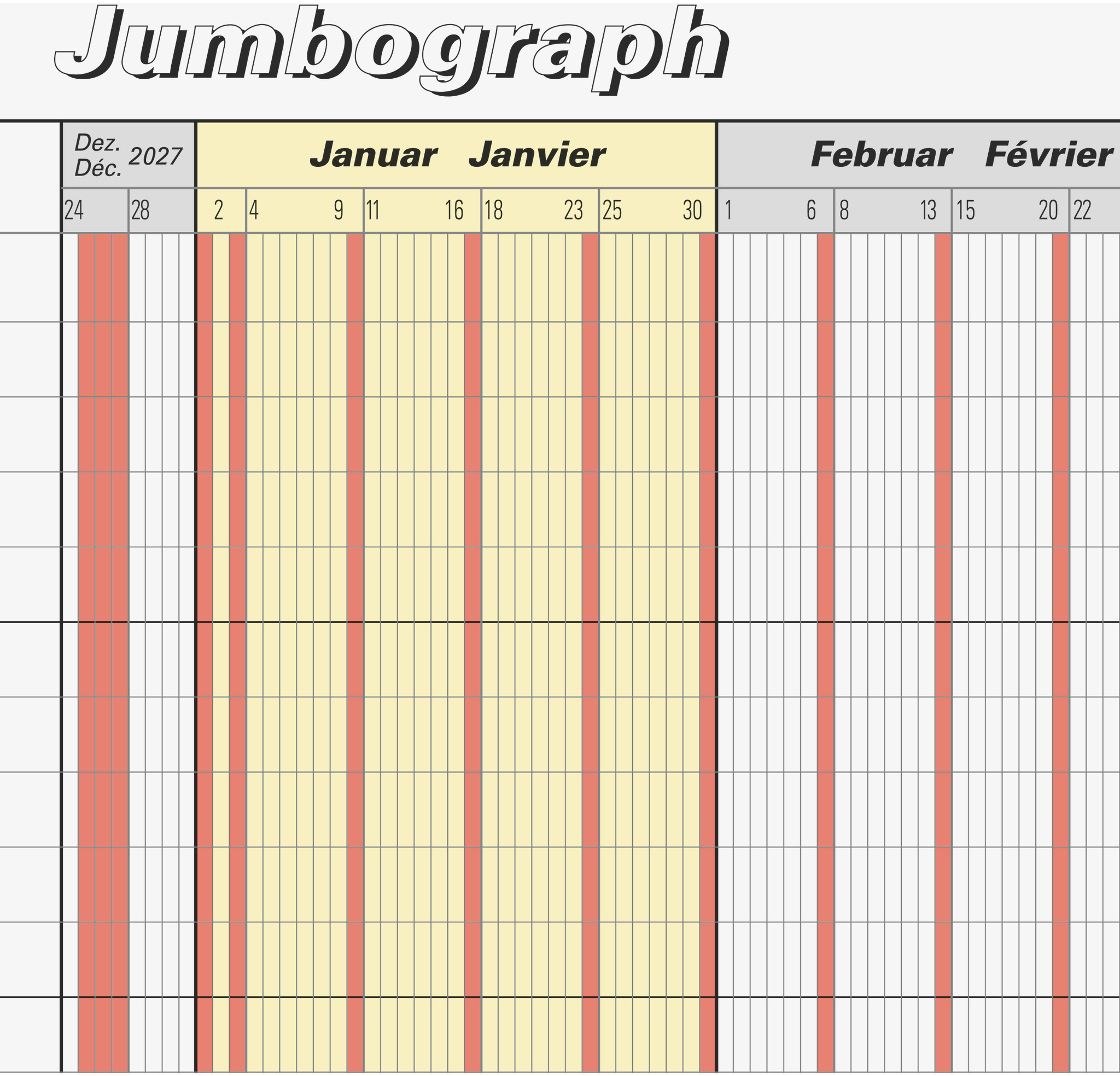Le planificateur de vacances BRUNNEN, également connu sous le nom de "Jumbograph", est un calendrier mural qui vous offre un aperçu clair de l'année. Il est plié en leporello, ce qui le rend peu encombrant. Avec de la place pour 35 personnes, il est idéal pour les familles, les colocations ou les équipes. Parfait
