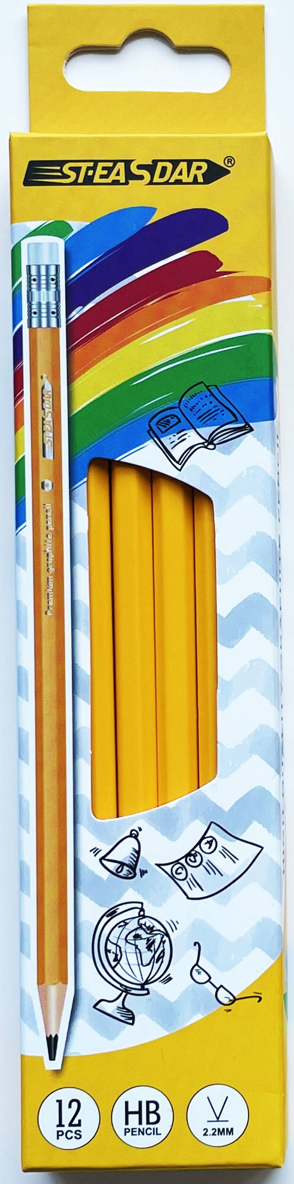 Le crayon en bois de tilleul dispose d'une gomme blanche et d'une mine incassable de 2,2 mm. Les crayons hexagonaux laqués en jaune sont livrés dans une boîte de 12.