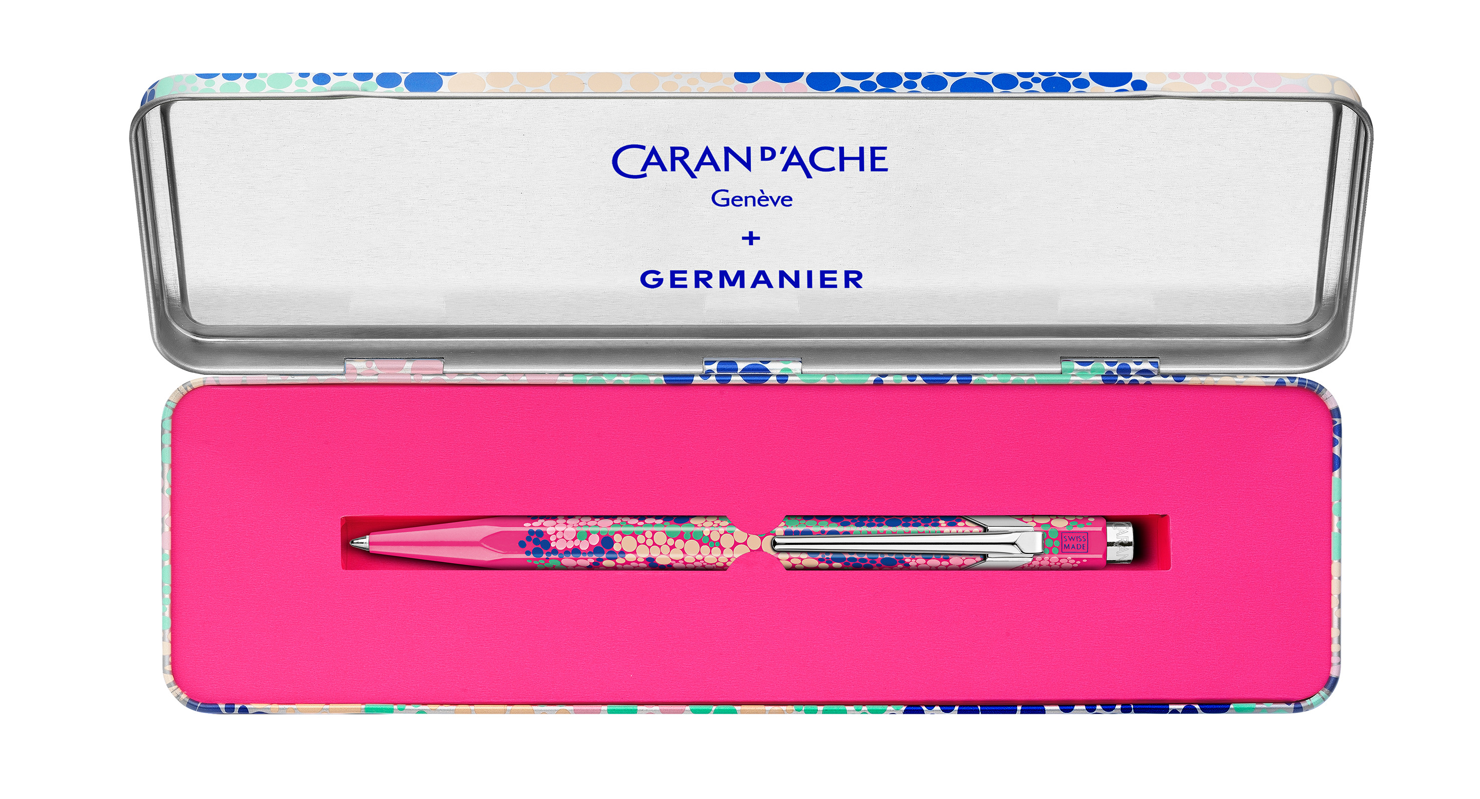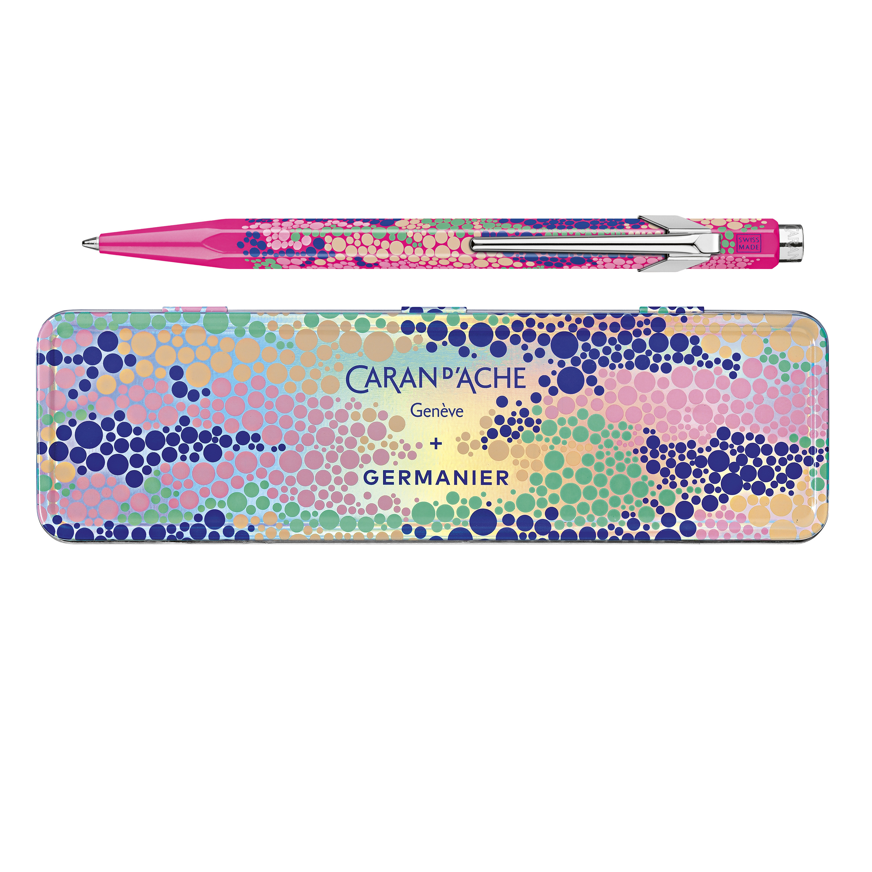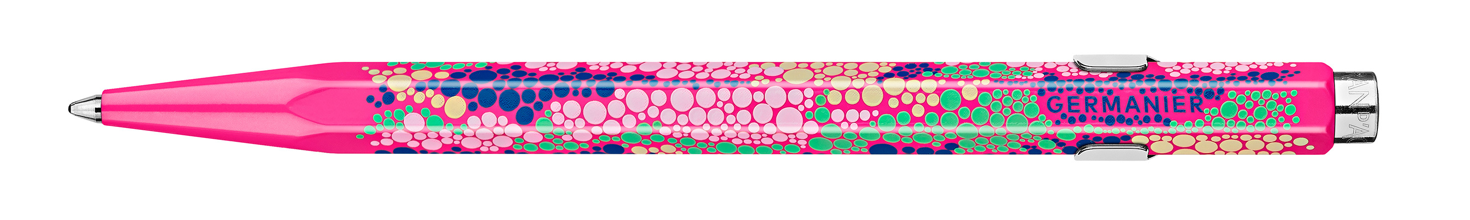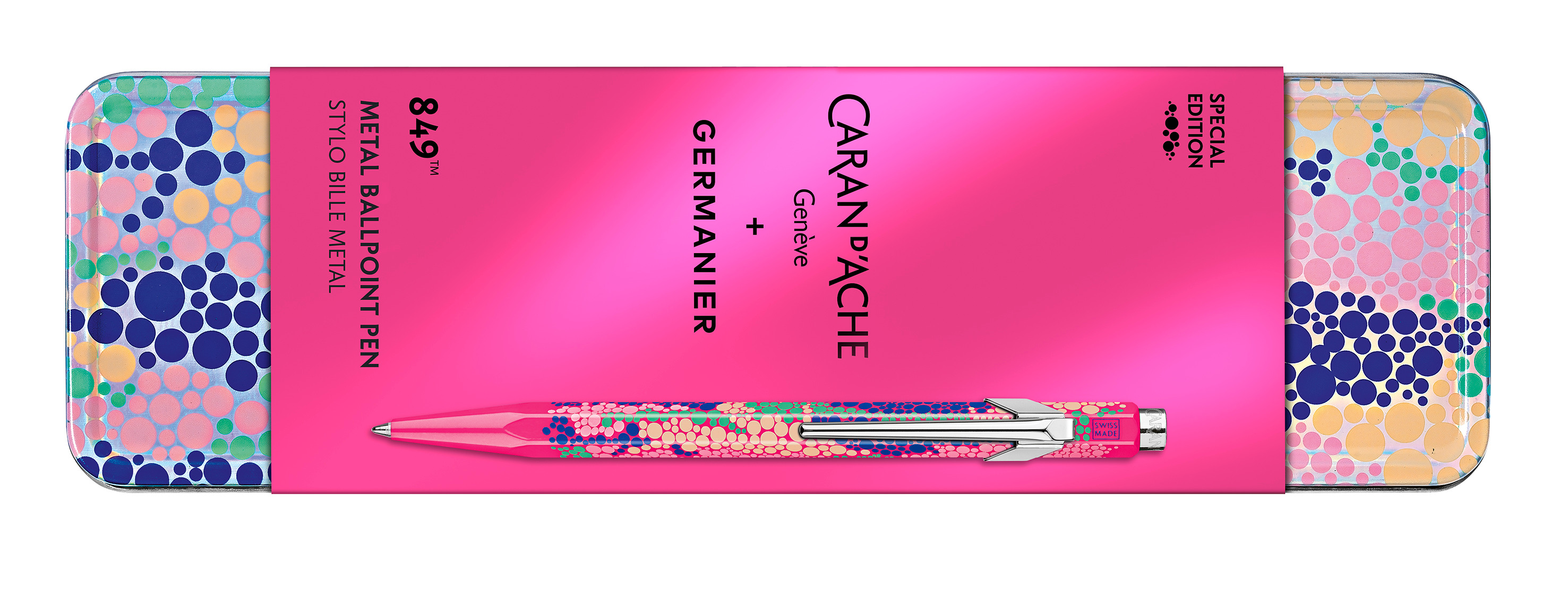 L'édition spéciale "Les Fulgureuses" incarne l'énergie intrépide de Germanier à travers des instruments d'écriture et d'art uniques. Au cœur de cette collection se trouvent deux stylos 849™ dans les couleurs néon préférées du designer : le rose et le vert. Leurs corps élancés sont ornés d'un motif coloré inspiré des perles - le motif central de cette collaboration - et portent le logo GERMANIER.