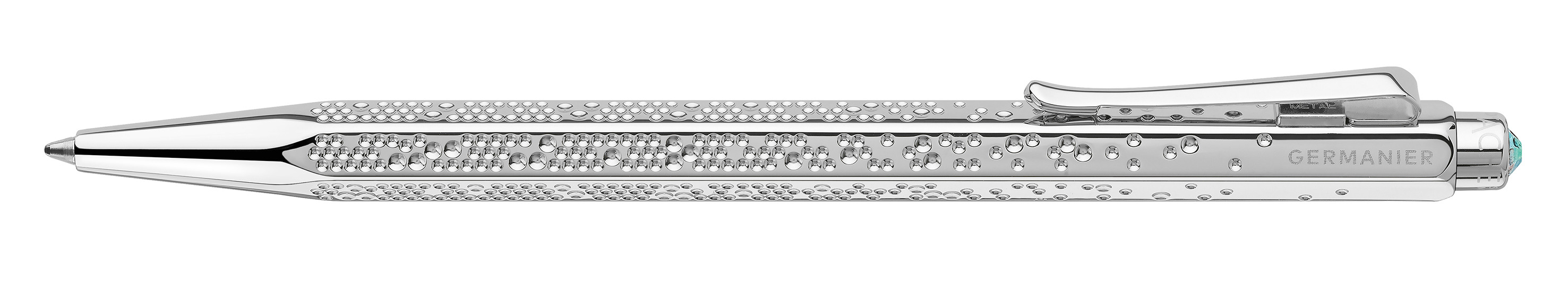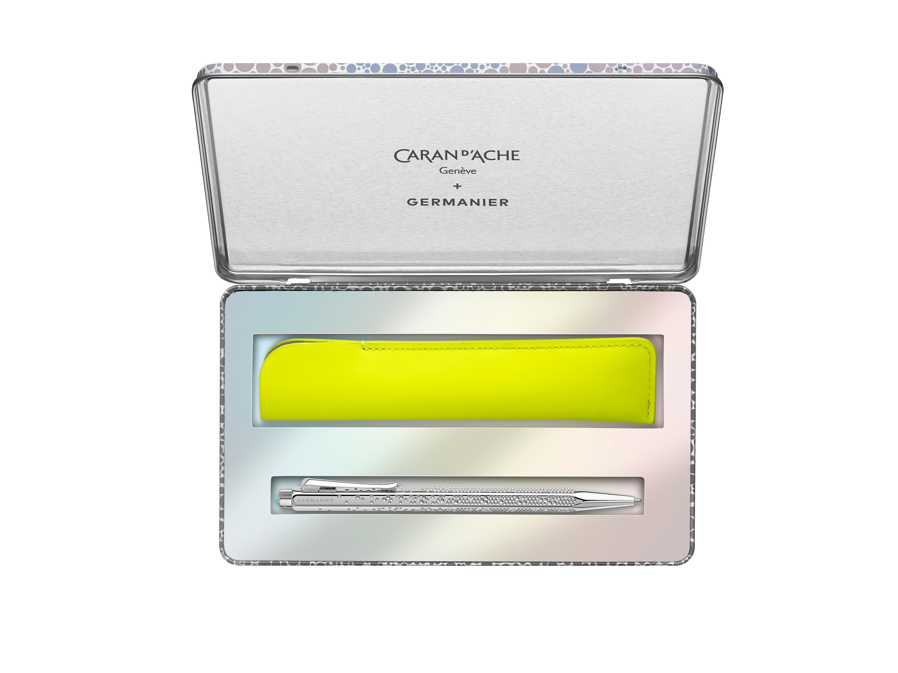 L'édition spéciale "Les Fulgureuses" incarne l'énergie intrépide de Germanier à travers des instruments d'écriture et d'art uniques. Le stylo à bille Ecridor™ ajoute une touche d'élégance à la collection, avec un motif guilloché qui rappelle les entrelacs de perles et une couronne en cristal de verre holographique qui reflète la lumière. Le stylo est gravé de la signature de Germanier et dispose d'une surface spéciale pour la personnalisation. Il est livré avec un étui en cuir jaune fluo, fabriqué à partir de matériaux recyclés provenant de marques de mode de luxe françaises, en hommage à l'engagement sans faille de Germanier pour la durabilité.