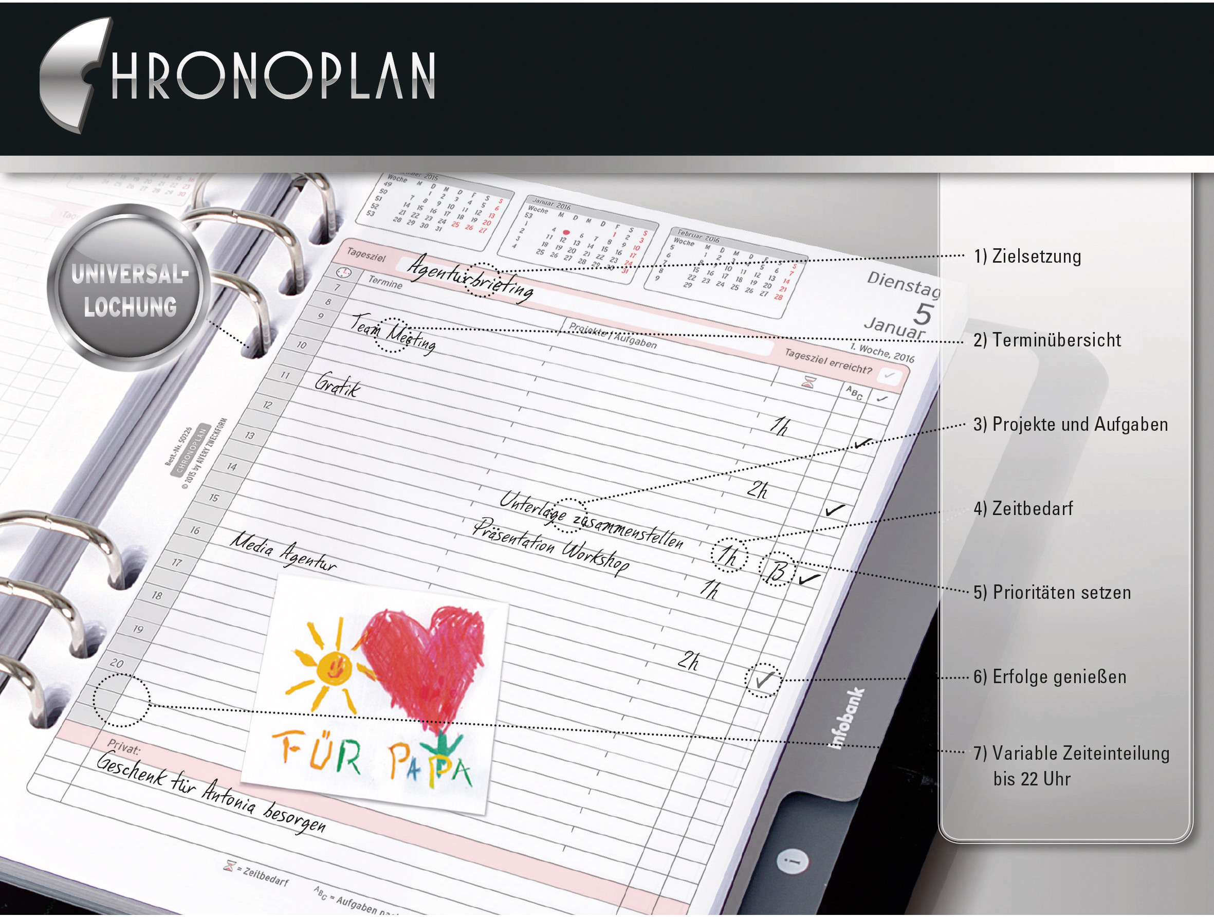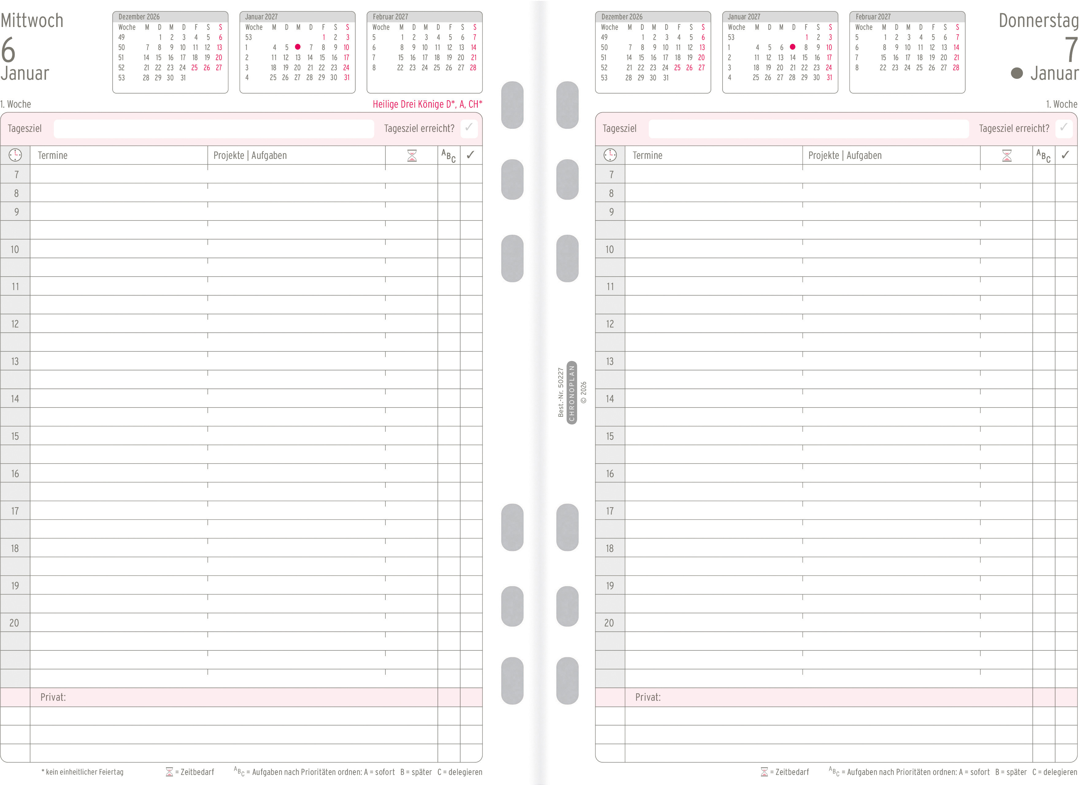 Avec l'agenda journalier 2026 de CHRONOPLAN au format A5 pour votre agenda, vous gardez une vue d'ensemble sur vos rendez-vous et vos tâches. Cet agenda permet une gestion du temps efficace et claire avec une page par jour. Grâce à la couleur bicolore