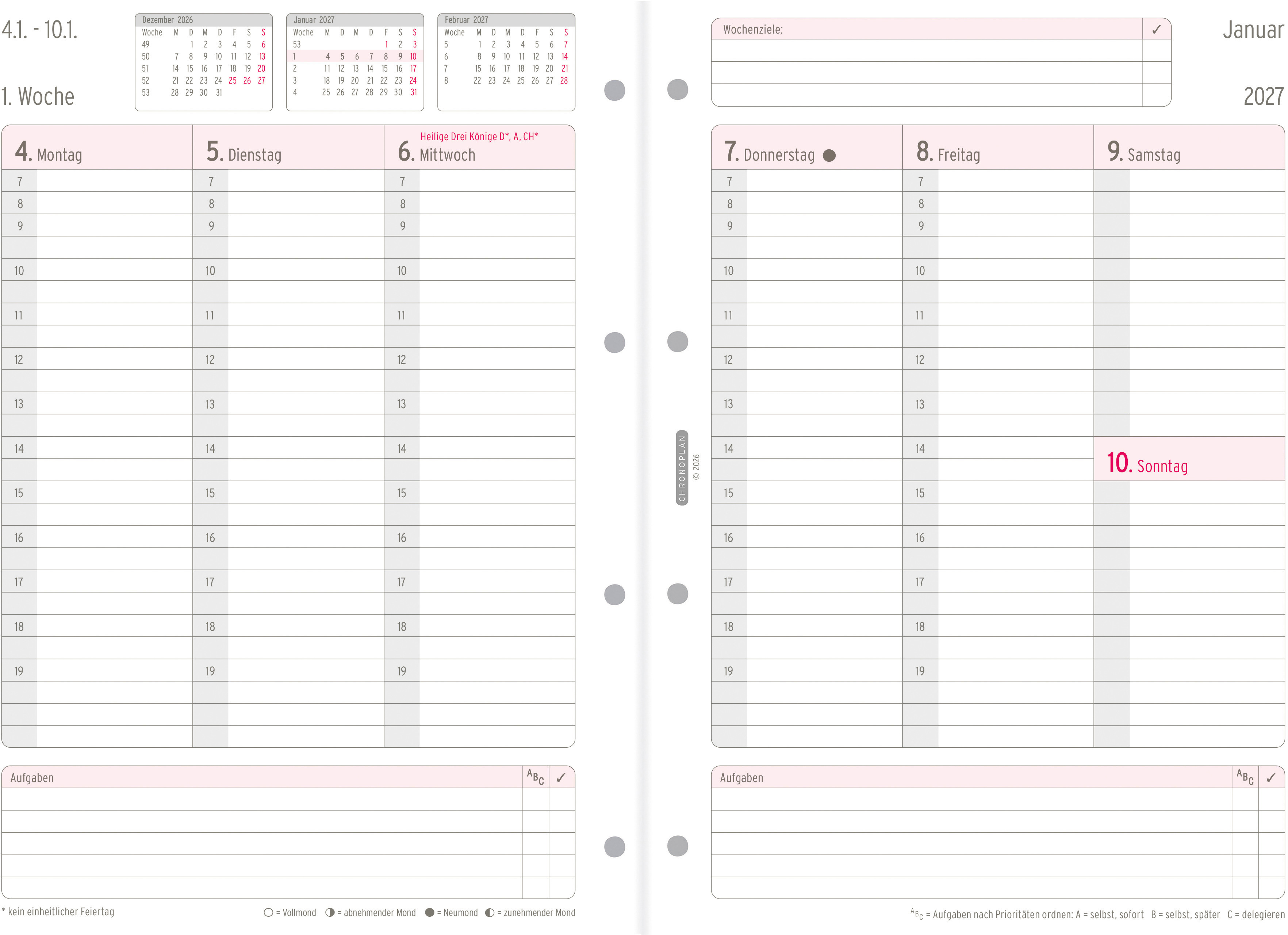 Avec l'agenda hebdomadaire 2026 de CHRONOPLAN au format A4 pour votre agenda, vous gardez une vue d'ensemble sur vos rendez-vous et vos tâches. Cet agenda permet une gestion du temps efficace et claire avec une semaine sur 2 pages. Les jours sont