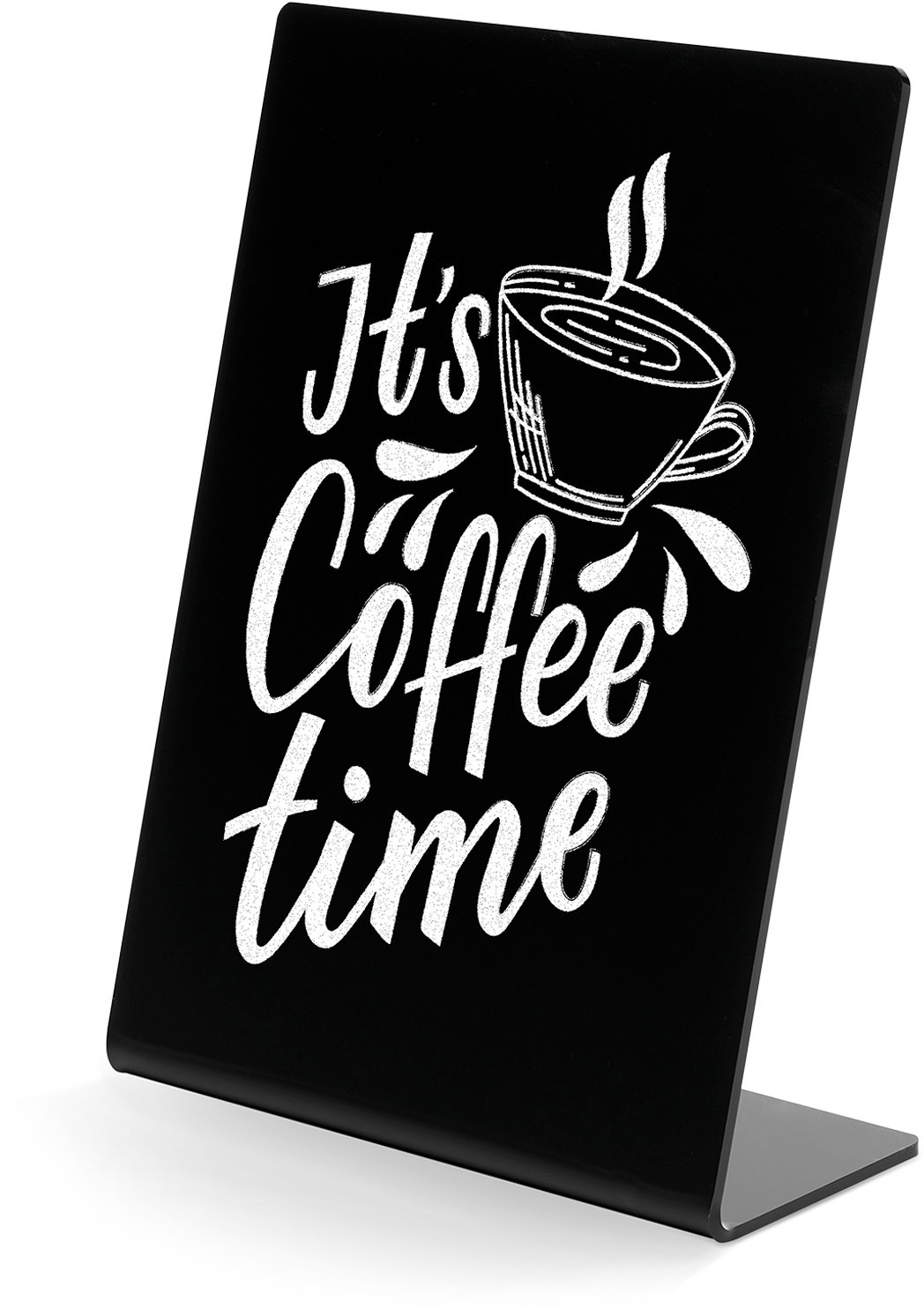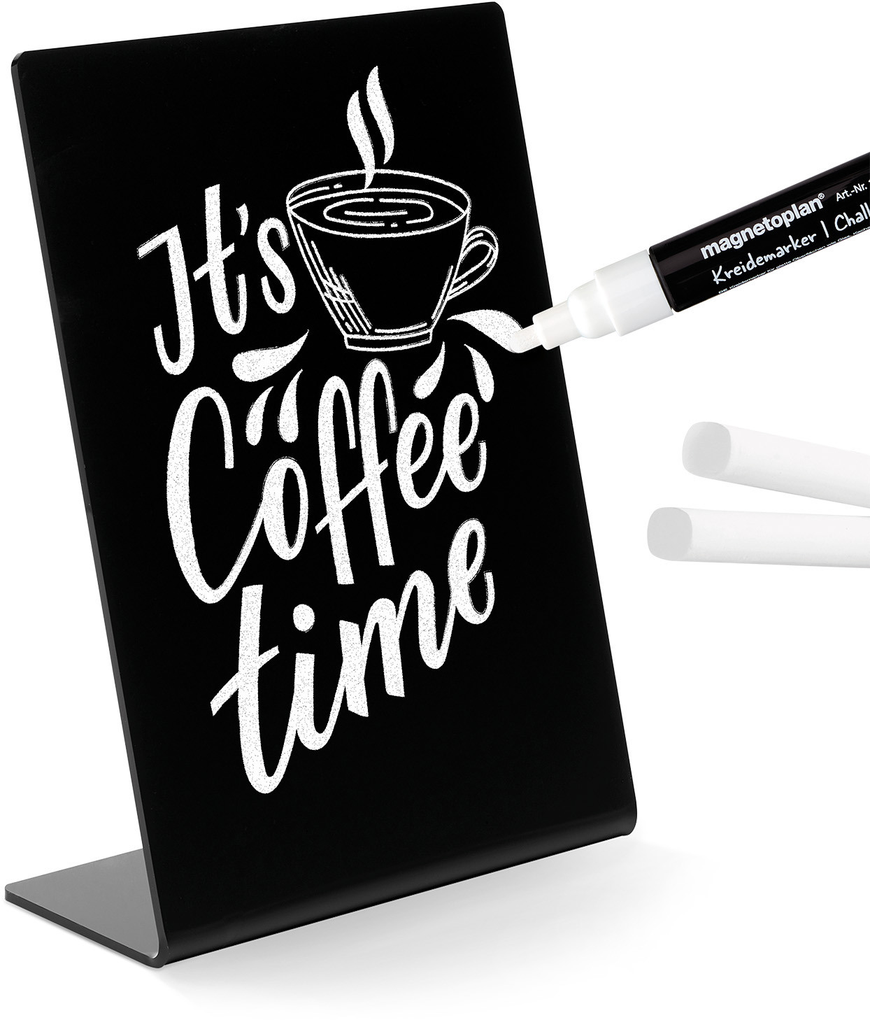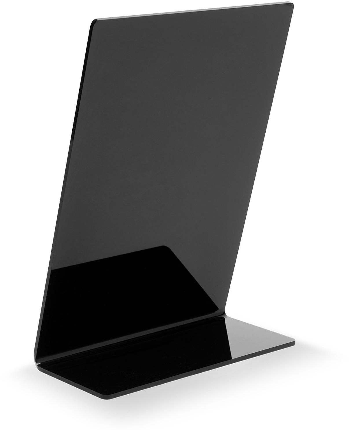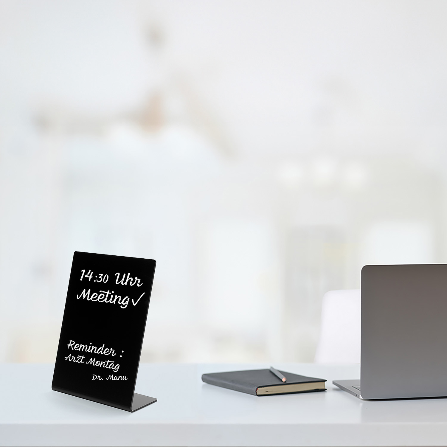 Présentoir de table incliné. Pour écrire avec des marqueurs, des marqueurs à craie et de la craie. Noir, effaçable avec un chiffon humide.