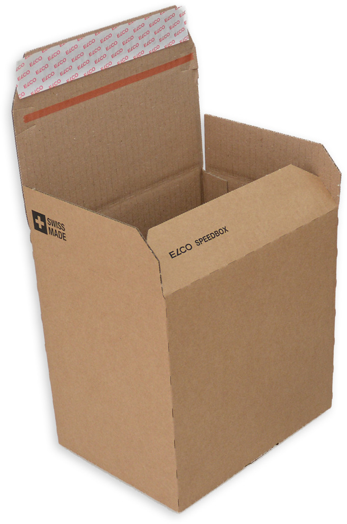 Maximisez votre efficacité avec la Speedbox ELCO - la solution parfaite pour le stockage rapide et l'expédition sûre des marchandises les plus diverses. Grâce à la bande autocollante supplémentaire, la fermeture de la boîte est encore plus simple et rapide. La boîte s'ouvre facilement grâce à l'aide à la déchirure. De même, elle est rapidement montée grâce au fond automatique.