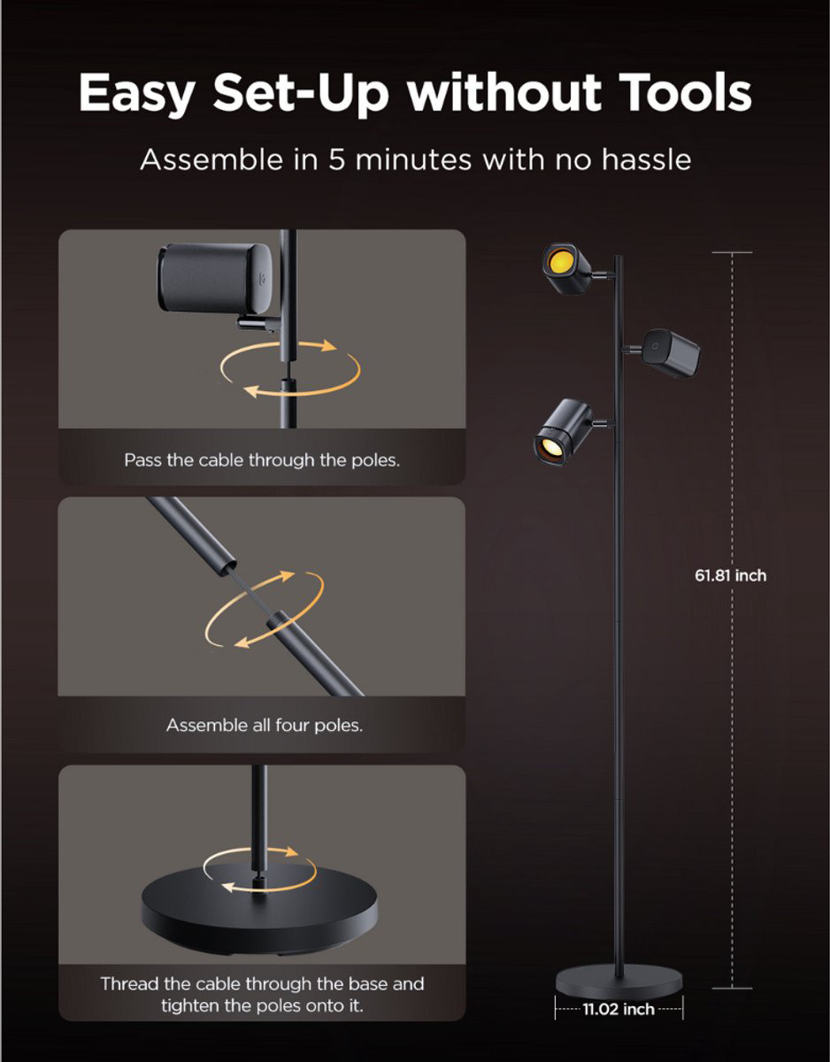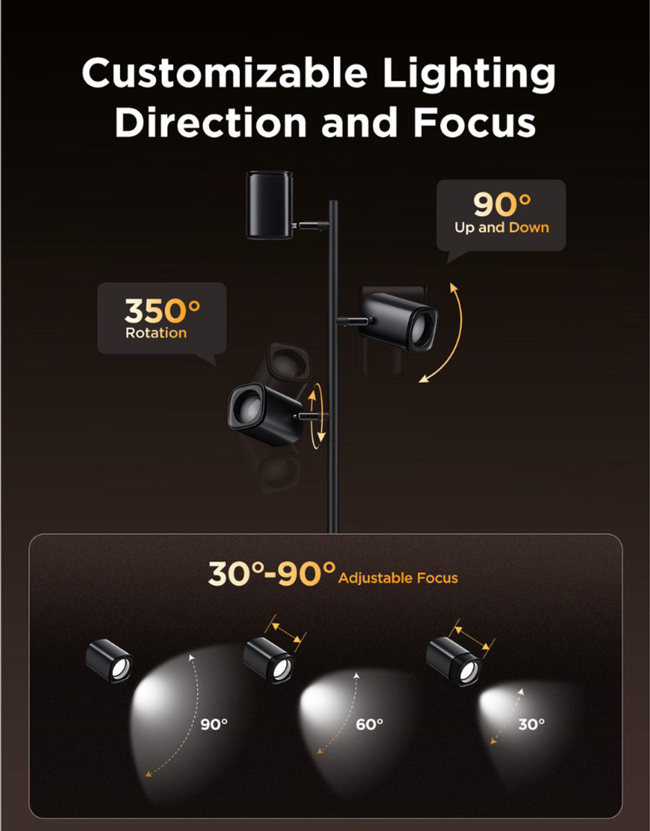 Découvrez le lampadaire Govee en forme d'arbre avec un triple contrôle flexible des lampes pour un allumage/extinction, une luminosité et des effets de couleur personnalisés. Avec des bras de lampe qui peuvent pivoter de 350° à l'horizontale et de 90° à la verticale et des têtes de lampe réglables, vous obtenez un éclairage précis.