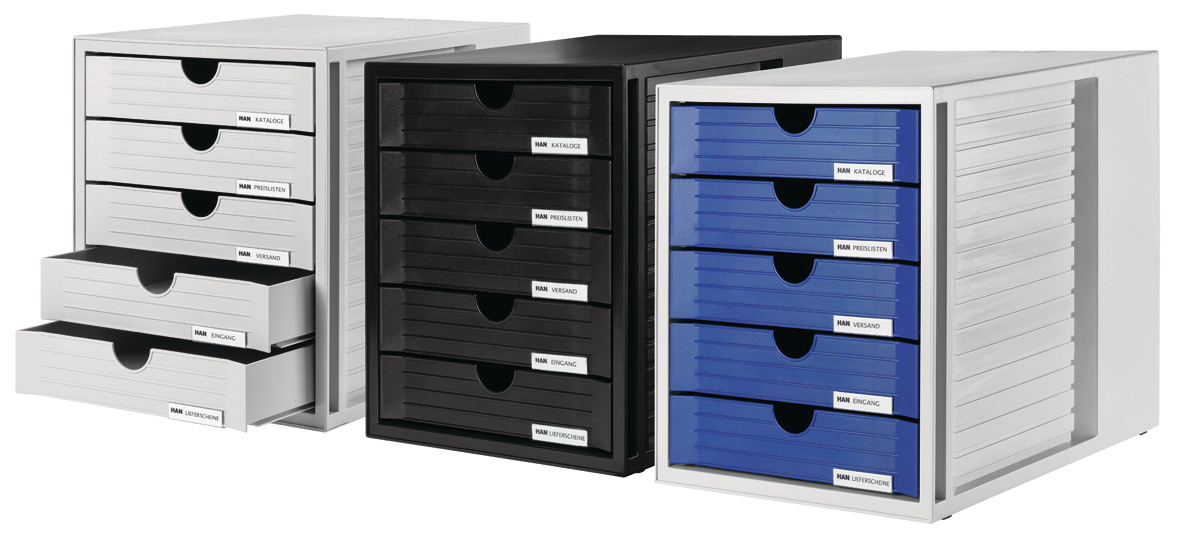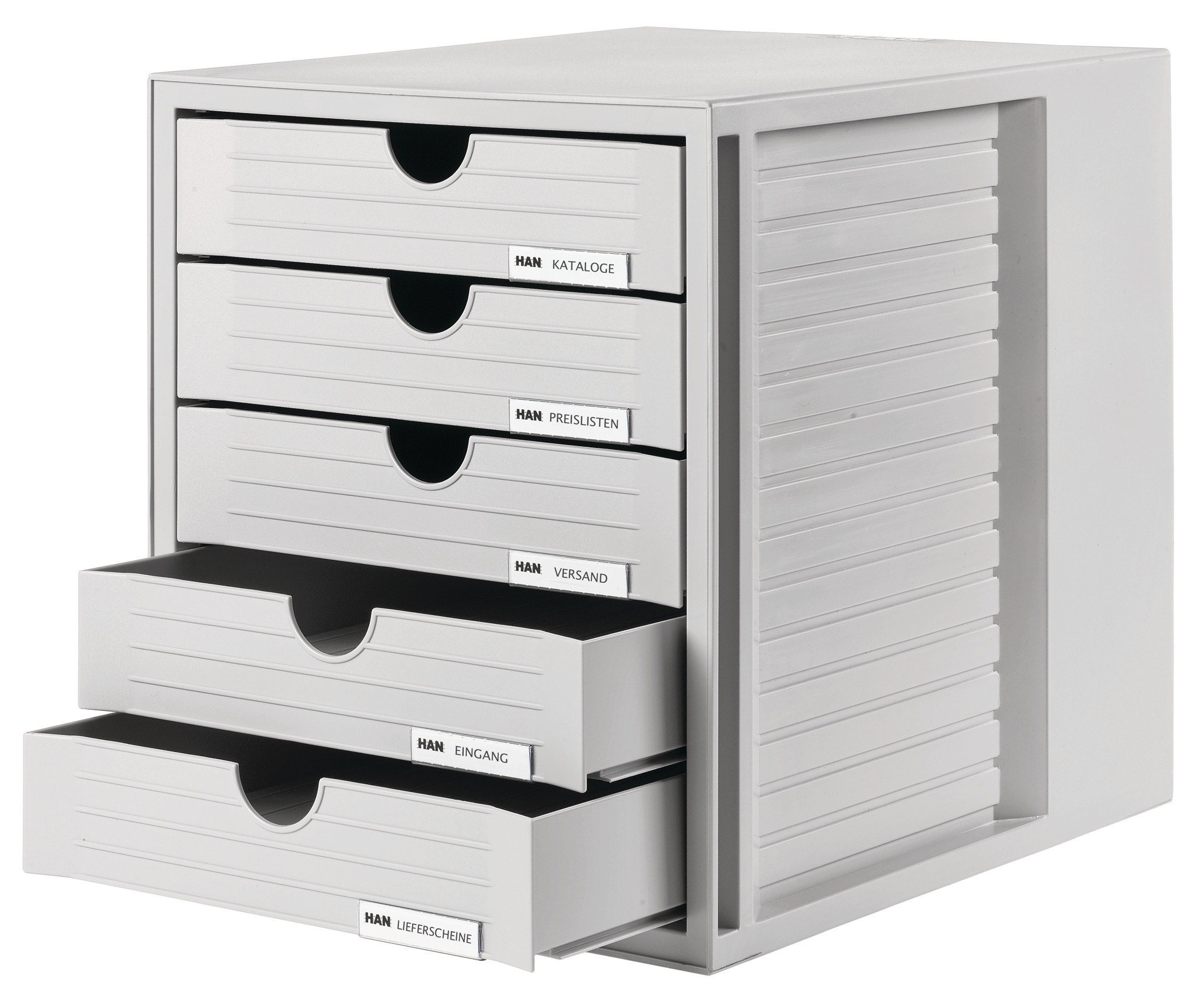 Boîte à tiroirs classique avec 5 tiroirs fermés. Le boîtier robuste s'intègre parfaitement dans une armoire. Équipé d'un trou de poignée pratique, d'étiquettes d'inscription et d'un système anti-fuite.