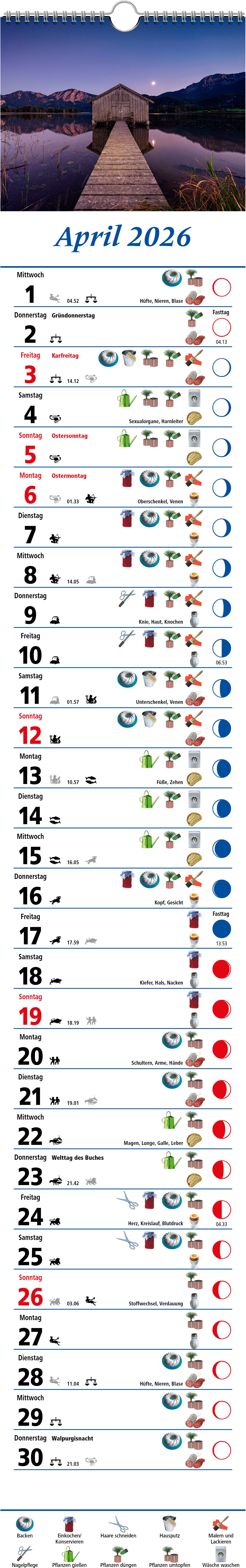Mince et élégant - l'exquis calendrier mural Föger. Ce calendrier à rayures lunaires est super mince et offre comme aucun autre une vision claire de l'évolution des phases et des positions de la lune tout au long du mois. En plus d'une brève description de l'œuf