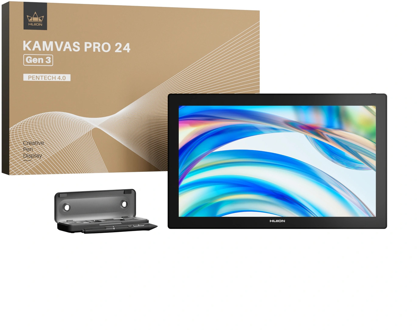 Le Huion Kamvas Pro 24 (Gen 3) est l'outil ultime pour les explorateurs créatifs. Avec un impressionnant écran UHD 4K de 23,8 pouces, la dernière technologie PenTech 4.0 et la surface innovante Canvas Glass 3.0, cet écran à stylet offre une expérience de dessin d'un réalisme et d'une précision incomparables - créé pour les professionnels qui ne font aucun compromis. L'écran grand format 4K (3.840 × 2.160) avec une densité de pixels de 185 PPI affiche chaque détail de votre travail avec une grande netteté. Grâce à la technologie Quantum Dot et à une couverture exceptionnelle de l'espace colorimétrique de 99 % sRGB, 99 % Adobe RGB, 98 % DCI-P3 et 98 % Display P3, vous découvrez des couleurs riches et naturelles et des transitions fluides avec plus d'un milliard de nuances de couleurs affichables. Chaque Kamvas Pro 24 (Gen 3) est calibré individuellement et atteint une précision des couleurs de △E < 1 grâce à la calibration matérielle 3D LUT - pour une fiabilité absolue de la reproduction des couleurs. Un rapport d'étalonnage en usine est inclus dans la livraison. Le nouveau Canvas Glass 3.0 a été spécialement conçu pour offrir une sensation de dessin similaire à celle du papier. La surface mate finement gravée réduit les reflets jusqu'à 14 % et minimise le grain tout en offrant une protection contre les traces de doigts et les rayures. Grâce au laminage complet, chaque trait semble direct et naturel, tandis que la structure améliorée du verre permet au stylo de glisser sans effort. Pour une flexibilité maximale, Huion fournit deux stylos : le PW600 et le PW600S. Tous deux sont sans pile, précis et ergonomiques. Le stylo standard offre trois boutons latéraux programmables, une gomme à l'extrémité et un agréable grip en silicone, tandis que le PW600S, plus fin, avec deux boutons et un design léger, est parfait pour les longues séances. Avec 16 384 niveaux de pression, un support d'inclinaison de ±60° et une force d'activation initiale de seulement 2 g, les deux stylos réagissent à chaque mouvement, des lignes les plus fines aux ombres les plus vives. La plage de pression peut être ajustée individuellement (200 g à 500 g) et la distance de retrait a été réduite à seulement 0,35 mm pour obtenir la sensation d'écriture la plus naturelle possible. La combinaison d'une technologie précise et d'un retour tactile rend le travail sur le Kamvas Pro 24 (Gen 3) intuitif et fluide, que ce soit pour la peinture numérique, l'illustration, la retouche ou la conception 3D. L'écran à stylet supporte le multi-touch et permet ainsi un contrôle naturel avec des gestes tels que le zoom, la rotation et le balayage. Un clavier Bluetooth optionnel est également disponible pour compléter vos raccourcis et vous offrir un contrôle efficace directement sur votre bureau. Le design ergonomique convainc également jusque dans les moindres détails : le boîtier robuste en aluminium est élégant et professionnel, tandis que quatre ouvertures d'aération à l'arrière assurent une température constante pendant les longues sessions de travail. Les connexions sur le dessus de l'appareil permettent une gestion propre des câbles et un positionnement flexible sur le poste de travail. Le Kamvas Pro 24 (Gen 3) est également compatible avec la norme VESA (100 × 100 mm) et prend en charge différentes options de support, dont une inclinaison intégrée de 20° ou des supports vendus séparément. Pour plus d'efficacité, l'écran dispose de cinq modes de couleurs librement sélectionnables, dont sRGB, Adobe RGB, DCI-P3, Display P3 et un mode noir et blanc pratique qui fait mieux ressortir les contrastes et ménage les yeux lors d'un travail prolongé. De nombreux accessoires sont inclus, dont deux stylos, une boîte à stylos, des pointes standard et en feutre, un gant, un chiffon de nettoyage, un adaptateur secteur, un câble de connexion et un colorimètre G1 exclusif pour l'étalonnage des couleurs (cadeau limité).
