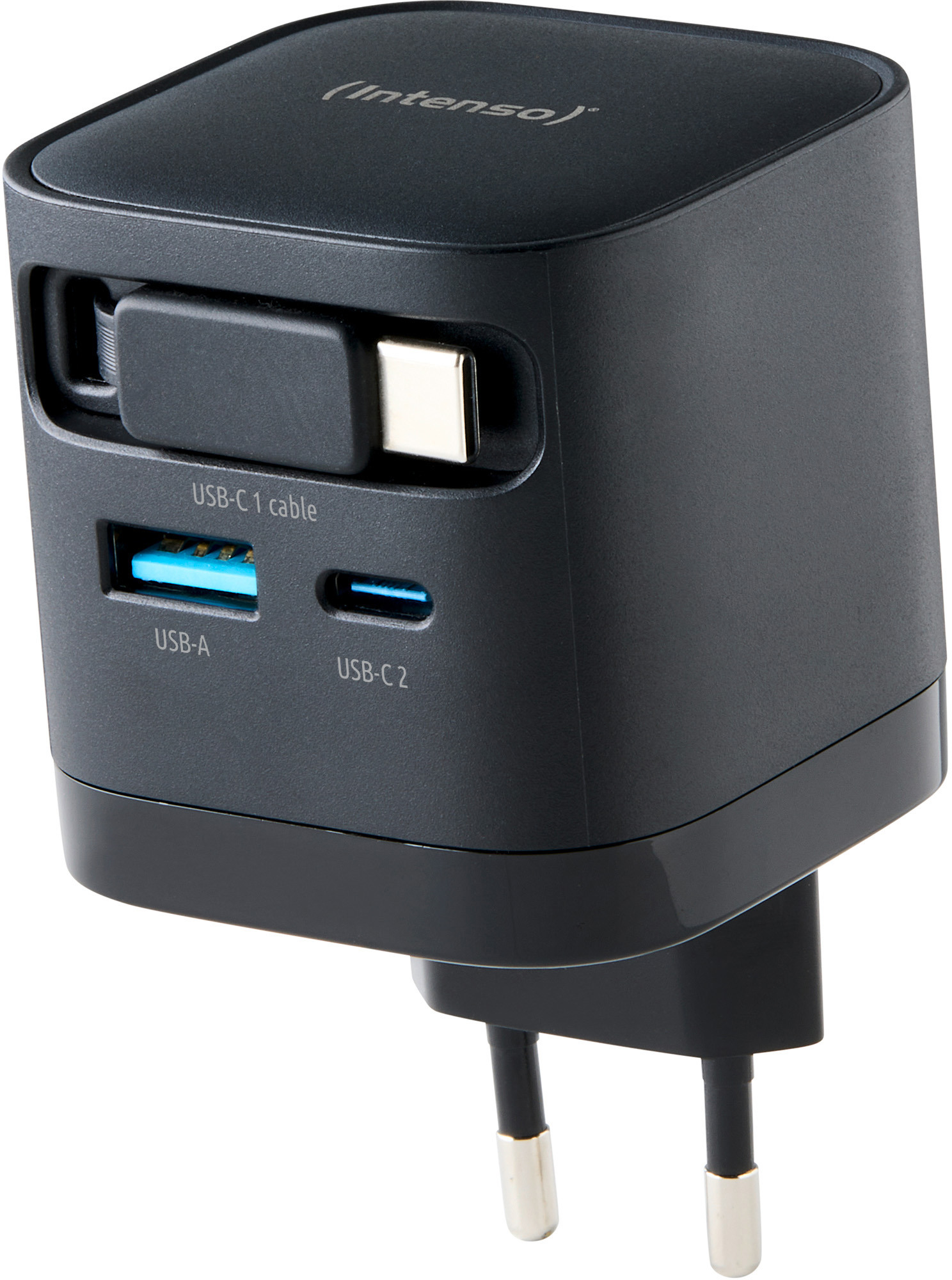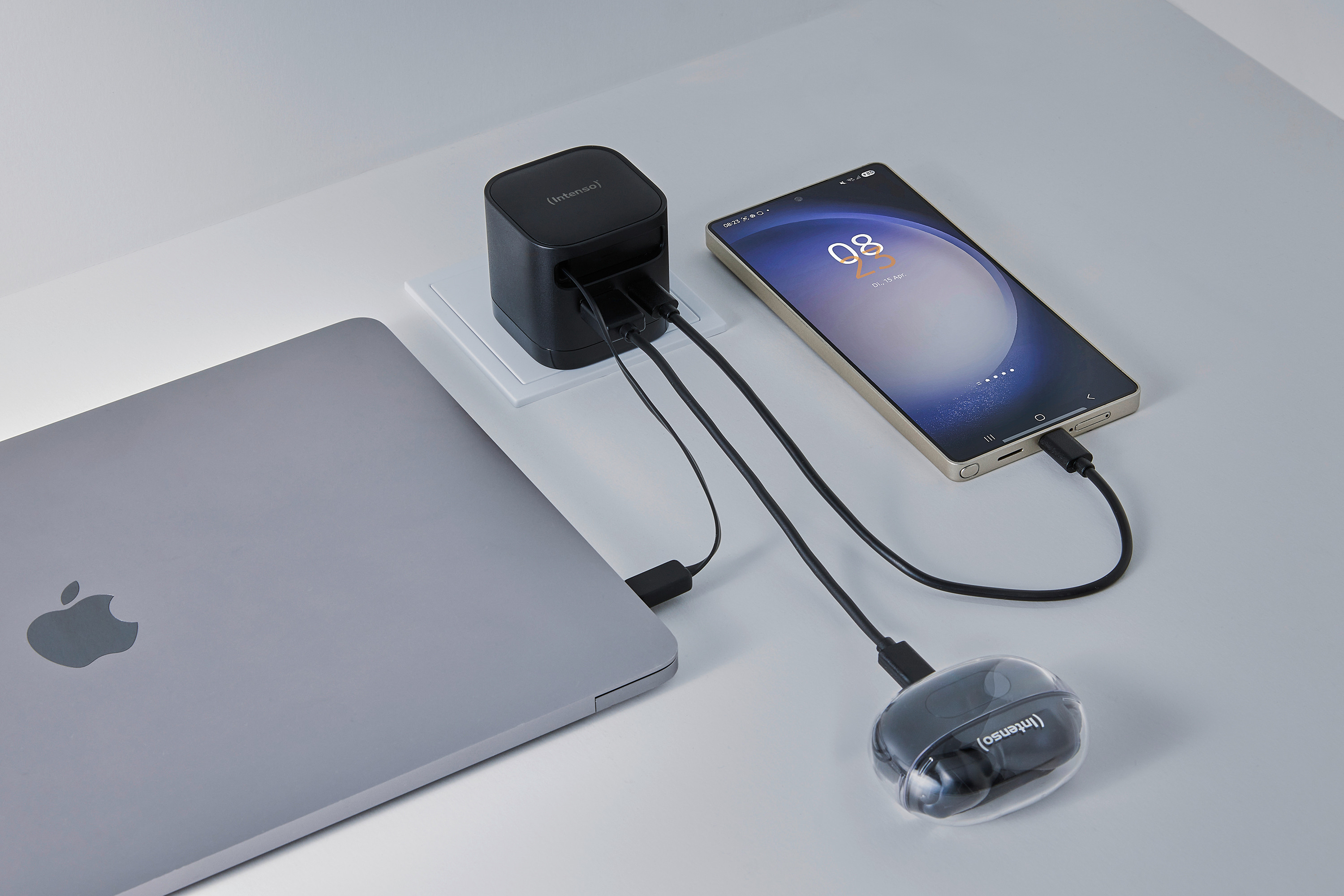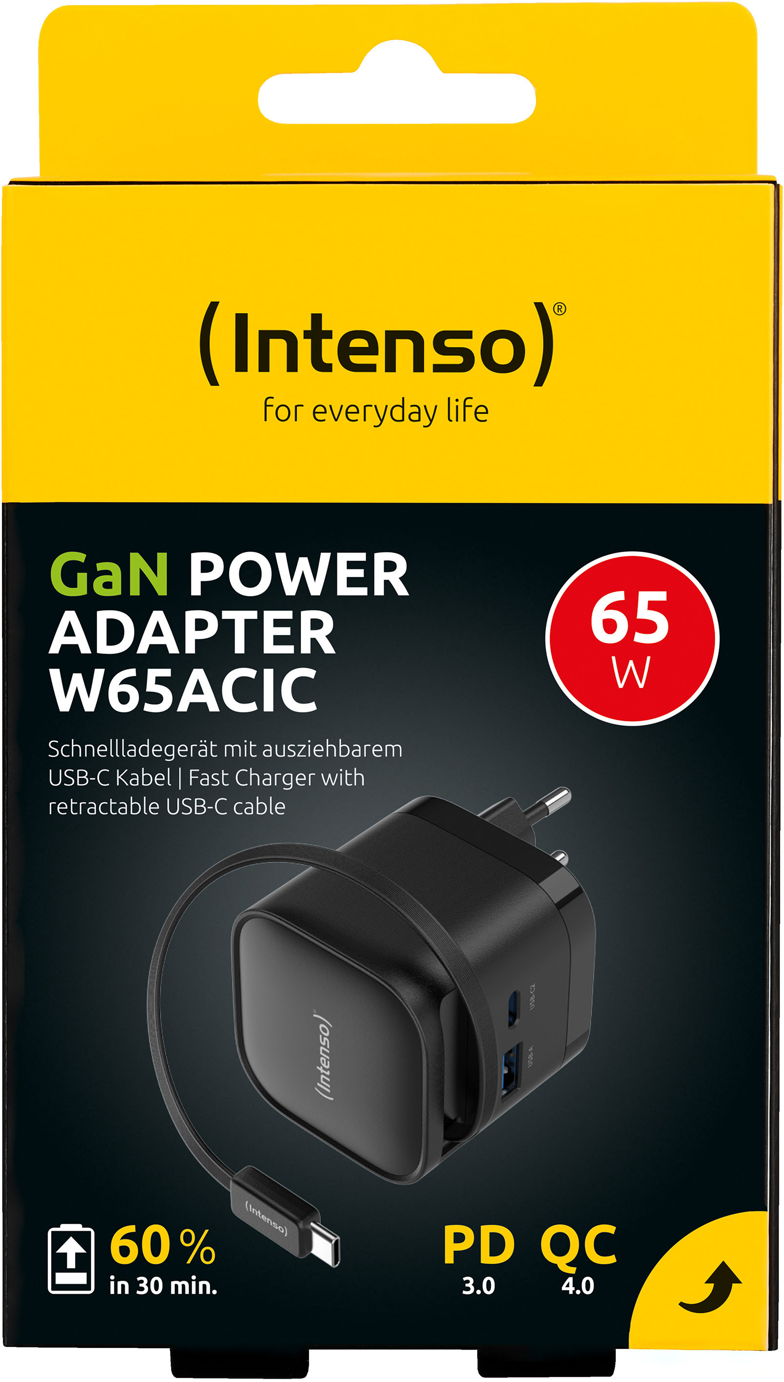 Der Intenso Power Adapter W65ACIC GaN ist ein leistungsstarkes und kompaktes Schnellladegerät für den täglichen Einsatz. Mit bis zu 65 W Ausgangsleistung lädt er Smartphones, Tablets und Notebooks zuverlässig und besonders schnell. Dank Unterstützung von Power Delivery 3.0, PPS und Quick Charge 4.0 werden moderne Geräte optimal versorgt. Das integrierte, ausziehbare 70 cm USB-C-Kabel sowie zusätzliche USB-C- und USB-A-Anschlüsse ermöglichen das gleichzeitige Laden mehrerer Geräte mit hoher Effizienz. Die moderne GaN-Technologie sorgt für eine verbesserte Energieeffizienz bei gleichzeitig geringer Wärmeentwicklung. Dadurch bleibt das Ladegerät besonders kompakt und leicht, ohne an Leistung einzubüssen. Mit einer Effizienz von über 78 % und einem Standby-Verbrauch von unter 0,3 W überzeugt der Adapter auch in puncto Nachhaltigkeit. Das robuste Gehäuse, das platzsparende Format und das geringe Gewicht machen ihn zum idealen Begleiter für Zuhause, Büro oder unterwegs. Erhältlich in Schwarz oder Weiss und passend für jede EU-Steckdose.