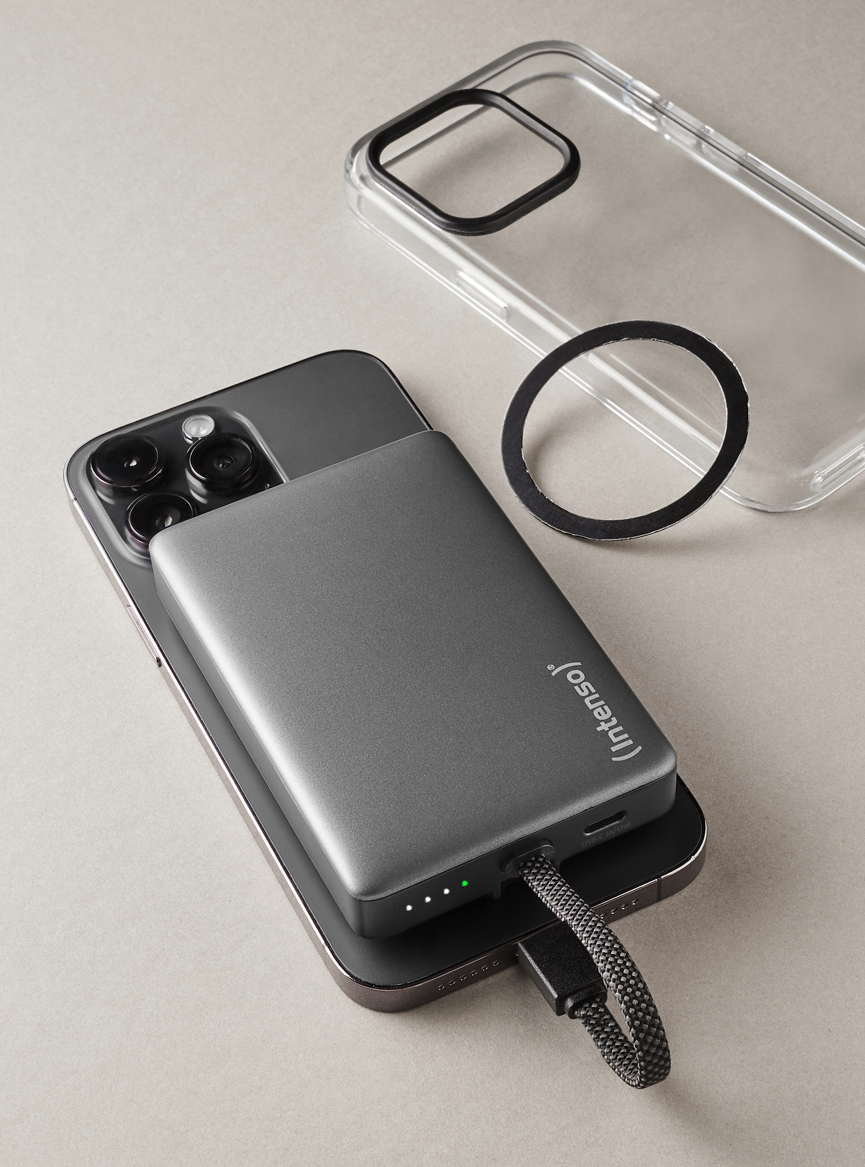 Die Powerbank MC10000 von Intenso kombiniert kompaktes Design und starke Leistung. Dank der integrierten Magnetfunktion kannst du die Powerbank einfach an der Rückseite deines Smartphones befestigen – perfekt, um dein Handy bequem beim Laden in der Hand zu halten oder sicher in der Tasche zu verstauen. Eine MagSafe-Funktion ist dabei nicht notwendig. Die MC10000 lädt dein Smartphone superschnell über das integrierte USB-C Kabel. Mit einer Kapazität von 10.000 mAh versorgt sie dein Smartphone, Tablet oder andere USB-C-Geräte mehrfach mit Energie. Dank zusätzlichem USB-C-Anschluss kannst du sogar mehrere Geräte gleichzeitig laden. Über die praktische 4-LED-Anzeige behältst du den Ladestand jederzeit im Blick. Die Intenso Powerbank MC10000 unterstützt Power Delivery bis zu 20 W und PPS-Technologie für eine intelligente, anpassungsfähige Stromabgabe. So lädst du kompatible Geräte schneller und effizienter – ob bei 5 V/3,0 A oder 12 V/1,67 A. Die Powerbank erkennt automatisch das optimale Ladeprofil. Auch der Eingang ist schnellladefähig und unterstützt Power Delivery mit bis zu 18 W, sodass die Powerbank selbst in kurzer Zeit wieder einsatzbereit ist. Hochwertige Lithium-Polymer-Zellen sorgen dabei für zuverlässige Leistung im kompakten Format. Mit ihren handlichen Maßen von 102 × 68 × 20 mm passt die Powerbank problemlos in jede Tasche. Die magnetische Rückseite ermöglicht eine sichere Befestigung am Smartphone – besonders praktisch mit dem beiliegenden selbstklebenden Metallring. Dank integrierter Sicherheitsfunktionen wie Überspannungs-, Entlade-, Überlade- und Kurzschlussschutz sind sowohl die Powerbank als auch deine Geräte optimal geschützt. Erhältlich in elegantem Grau – Schwarz ist die MC10000 der perfekte Begleiter für dich, wenn du mobile Energie im modernen Design suchst.