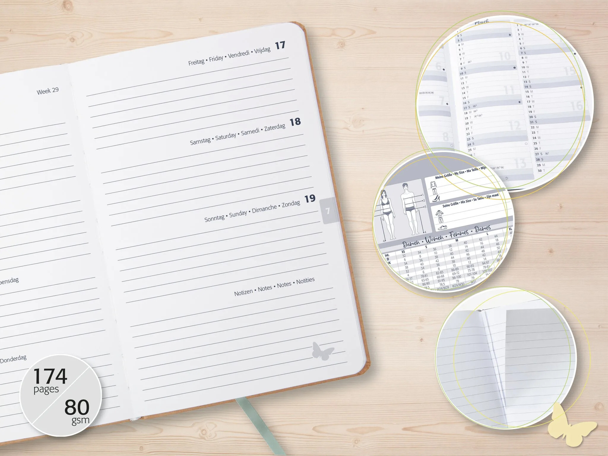 Couverture solide en papier kraft avec un joli design imprimé. Très durable grâce à une reliure à fil de haute qualité. Papier blanc (80 g/m², certifié FSC), imprimé en gris élégant. Nombreuses pages d'informations, de motifs et de planification : Aperçus mensuels et annuels (EN uniquement), vacances et jours fériés (DE/AT/CH/UK/FR/BE/NL), tableau des mesures, destinations, anniversaires et bien d'autres choses encore. Caractéristiques pratiques : fermeture par élastique, passant pour stylo, ruban de lecture. 12 feuilles de notes perforées (lignées & quadrillées à points)