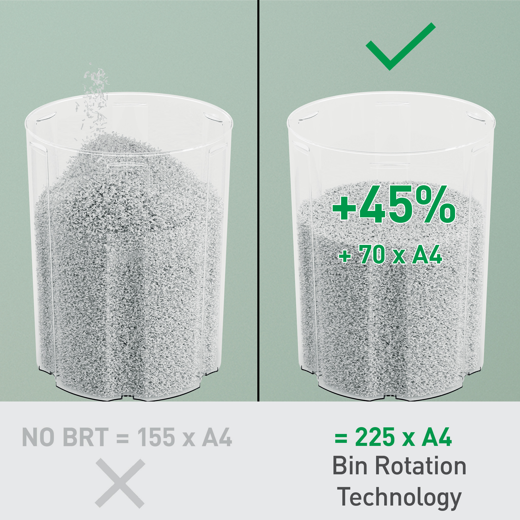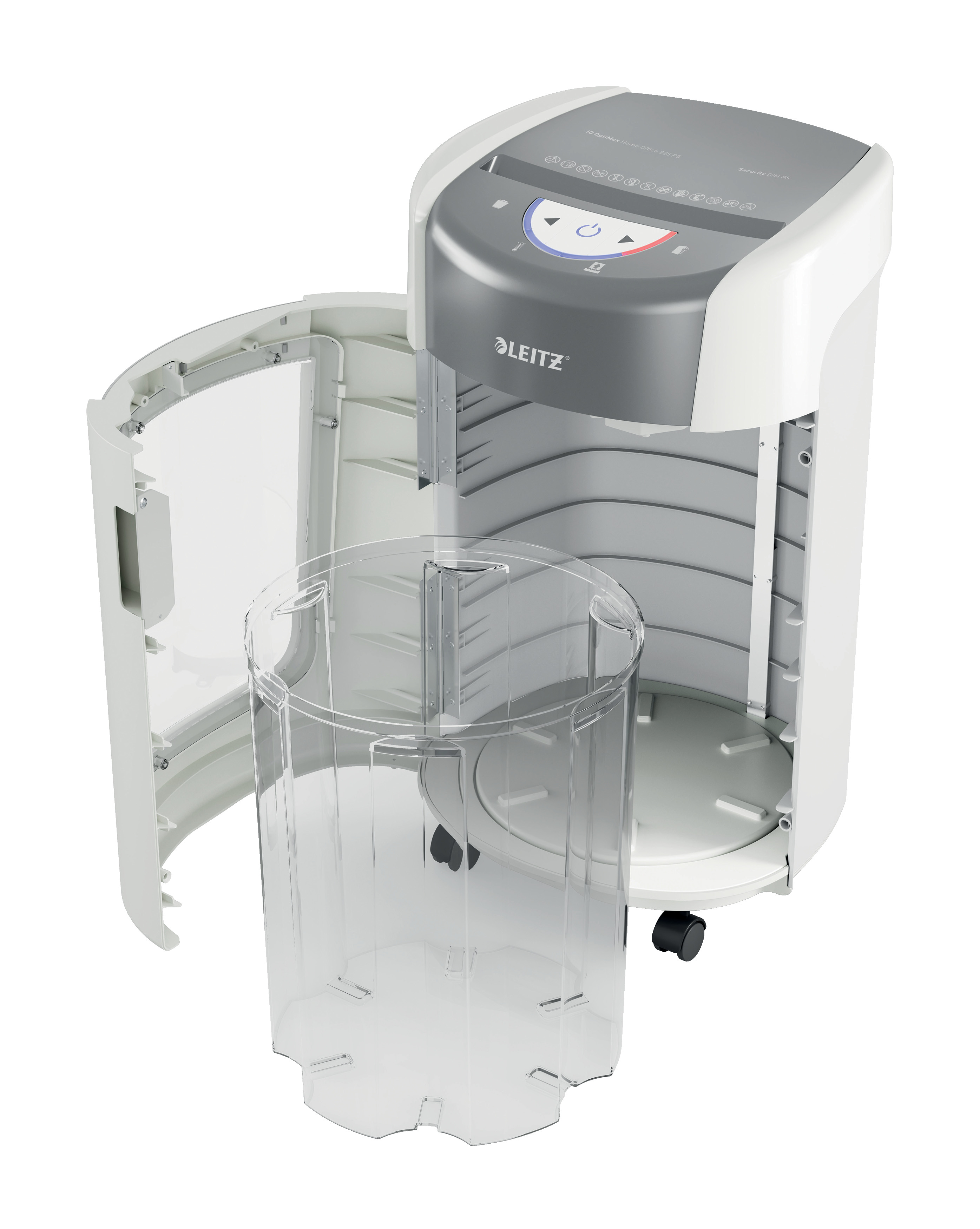 Le destructeur de documents Leitz IQ OptiMax pour le bureau à domicile est une solution innovante et élégante pour la destruction de documents, offrant une sécurité exceptionnelle des documents et une tranquillité d'esprit. Ce destructeur de documents DIN P-5 hautement sécurisé détruit sans effort jusqu'à 6 feuilles A4 à la fois en morceaux micro-découpés, ce qui en fait un petit destructeur idéal pour une utilisation personnelle ou au bureau à domicile. Grâce à la technologie unique de rotation de la cuve(BRT), le destructeur Leitz maximise la capacité de la cuve de +45%*. Le réceptacle rotatif assure une répartition plate et uniforme du papier, évite les bourrages et permet de broyer 70 feuilles A4 supplémentaires avant de devoir le vider. Avec BRT, il n'est pas nécessaire de retirer le bac ou de le secouer - l'indicateur de bac plein ne s'active que lorsque la capacité est de 100 %. Le récipient de 15 litres peut contenir jusqu'à 225 feuilles A4 et est éclairé par une élégante lumière bleue pendant le fonctionnement afin de faciliter le broyage. Un écran LED intuitif indique clairement lorsque le bac est plein, la porte ouverte, en surchauffe ou en surcharge, pour un fonctionnement fluide et sans problème. Conçu pour le travail à domicile, le destructeur Leitz IQ OptiMax 225 est particulièrement silencieux afin de minimiser les interférences, ce qui le rend parfait pour les espaces communs. Son design fin et compact s'intègre facilement dans n'importe quelle pièce, même la plus petite, sans perdre en performance. Avec un temps de fonctionnement continu de 20 minutes, ce destructeur de documents offre une destruction fiable et sûre des documents pour une élimination quotidienne. Couleur : Blanc *Leitz IQ OptiMax 225 testé avec et sans la technologie de rotation de la corbeille.