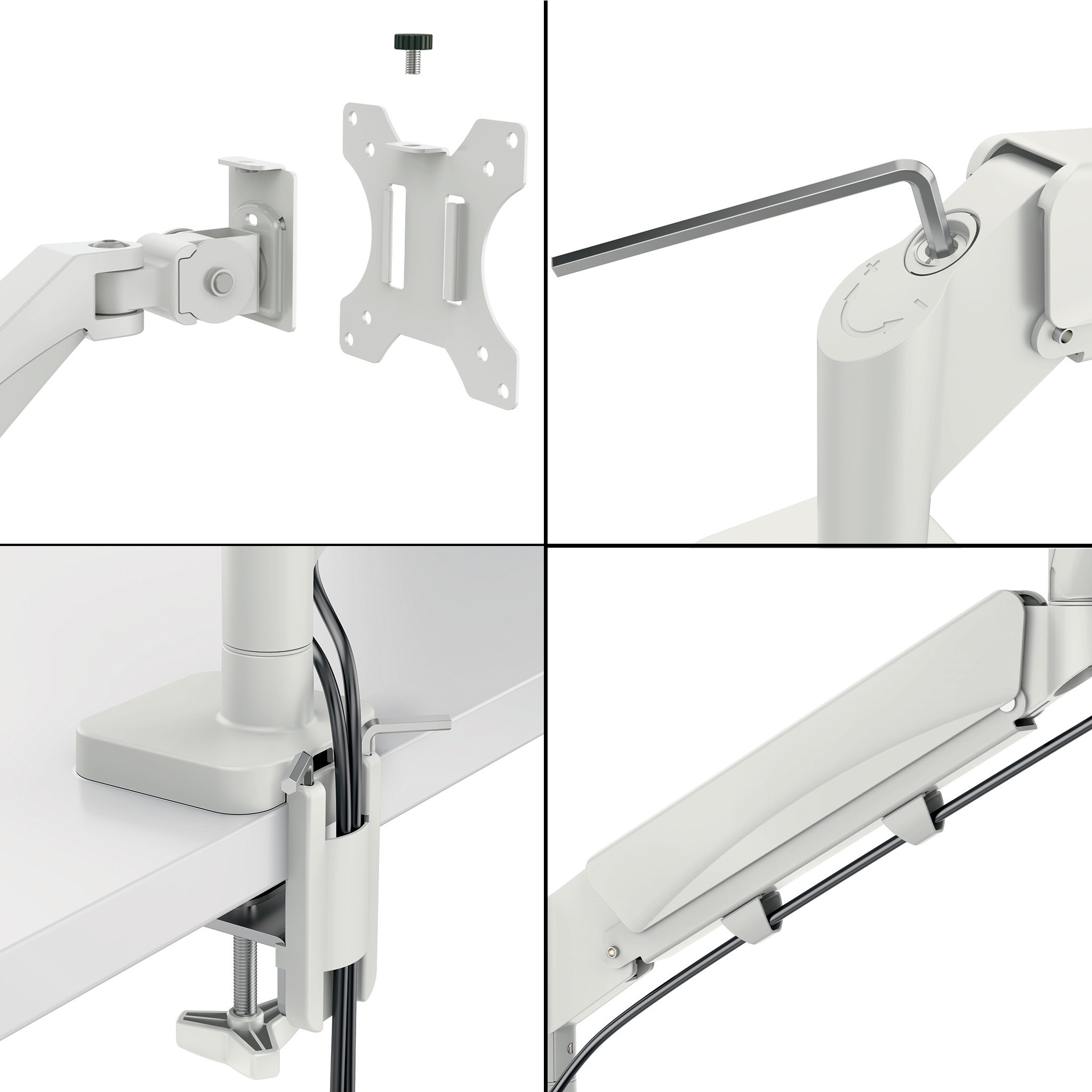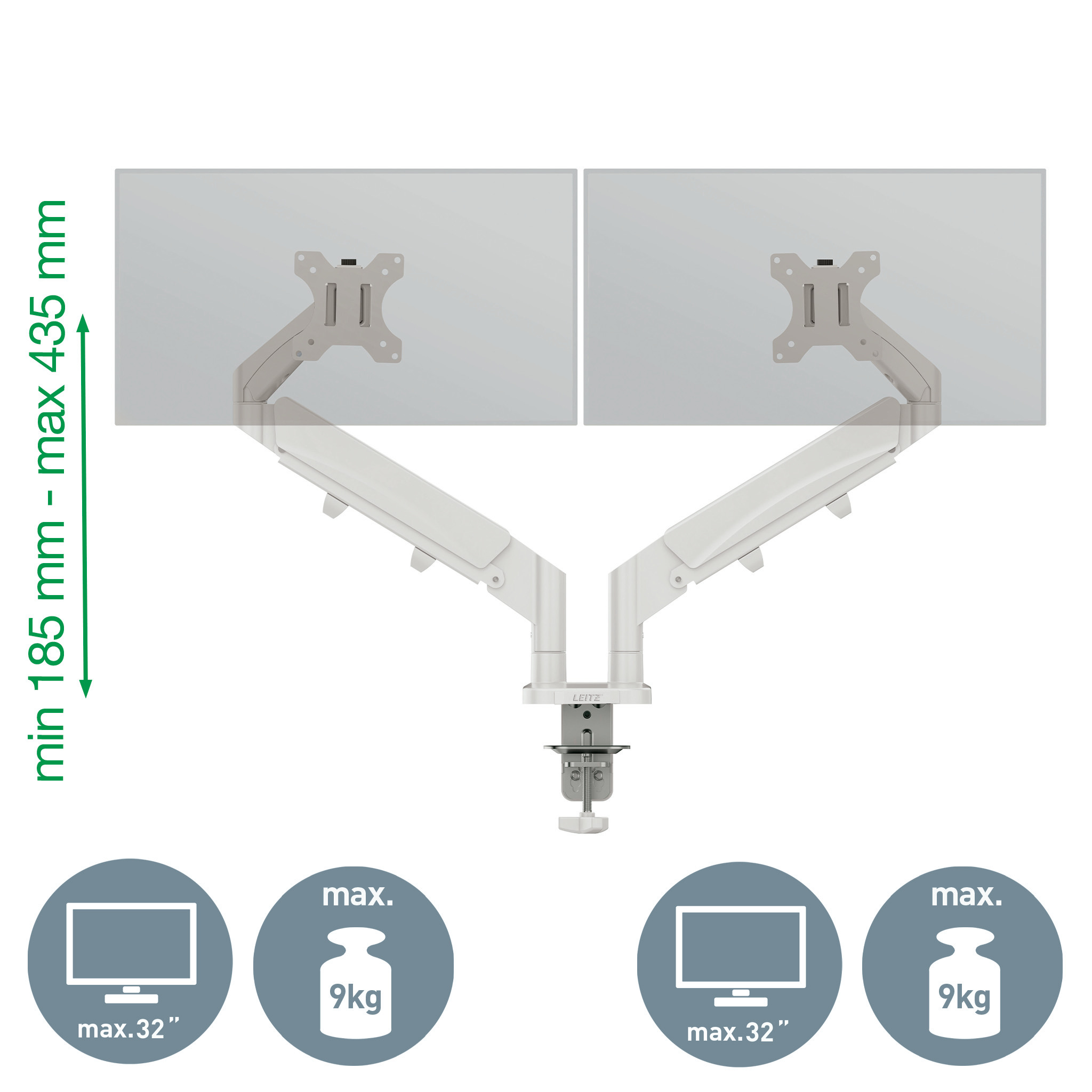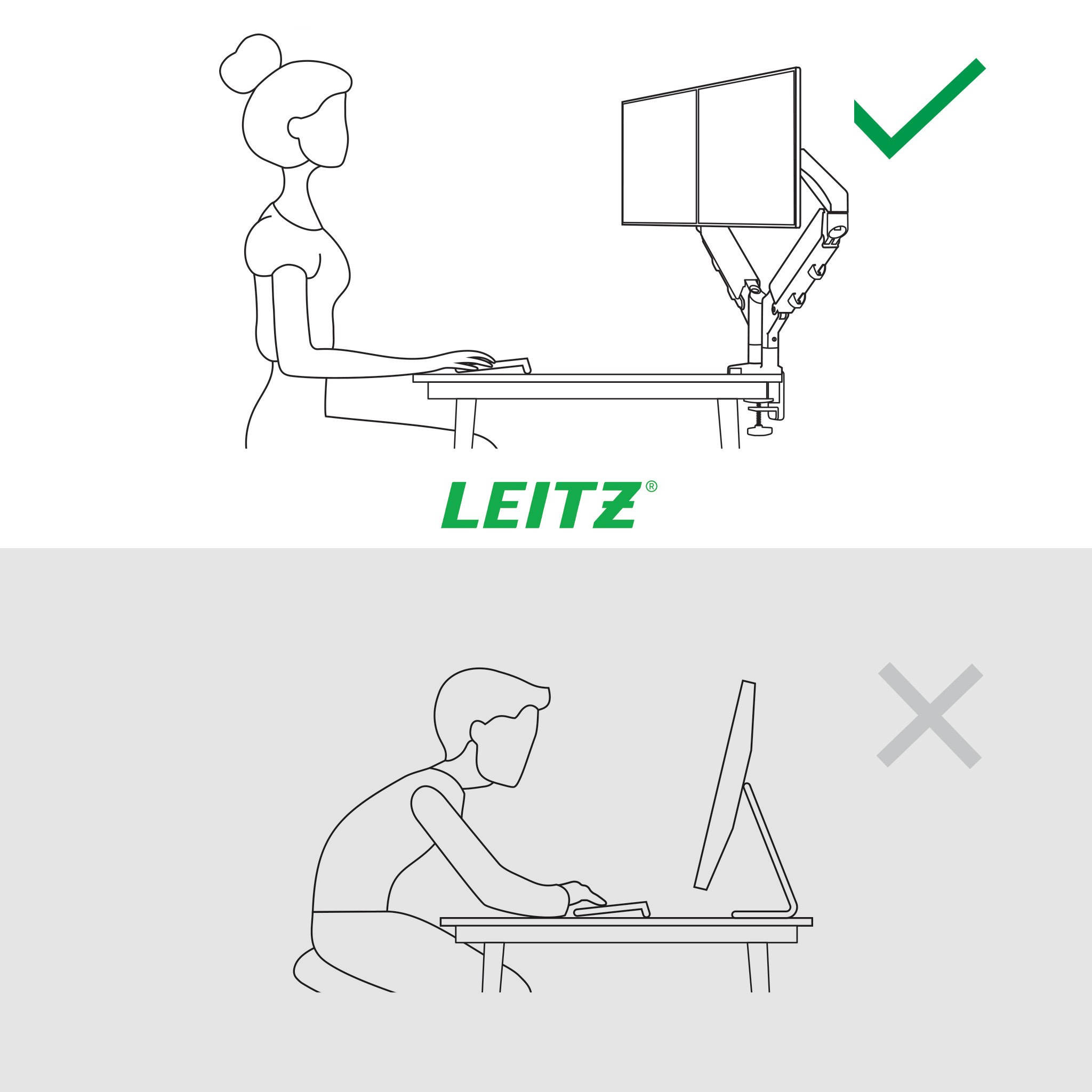 Certifié par le TÜV et l'IGR, le bras pour moniteur Leitz Ergo peu encombrant Dual a un effet positif sur la posture du corps, favorise l'alignement correct des yeux et contribue au confort de la nuque et des épaules lorsque la hauteur des moniteurs est réglée correctement et comme recommandé pour obtenir la position ergonomique idéale. Le support d'écran reste stable à toutes les hauteurs et à tous les angles, et il est facile de passer du mode paysage au mode portrait. Sa conception est idéale lorsque l'espace disponible est limité. Grâce à ses bras extrêmement polyvalents qui se replient facilement à plat, s'inclinent et se manœuvrent dans toutes les directions d'une seule main, un espace précieux est libéré sur le bureau. Conçu de manière ergonomique pour favoriser le bien-être et augmenter la productivité.