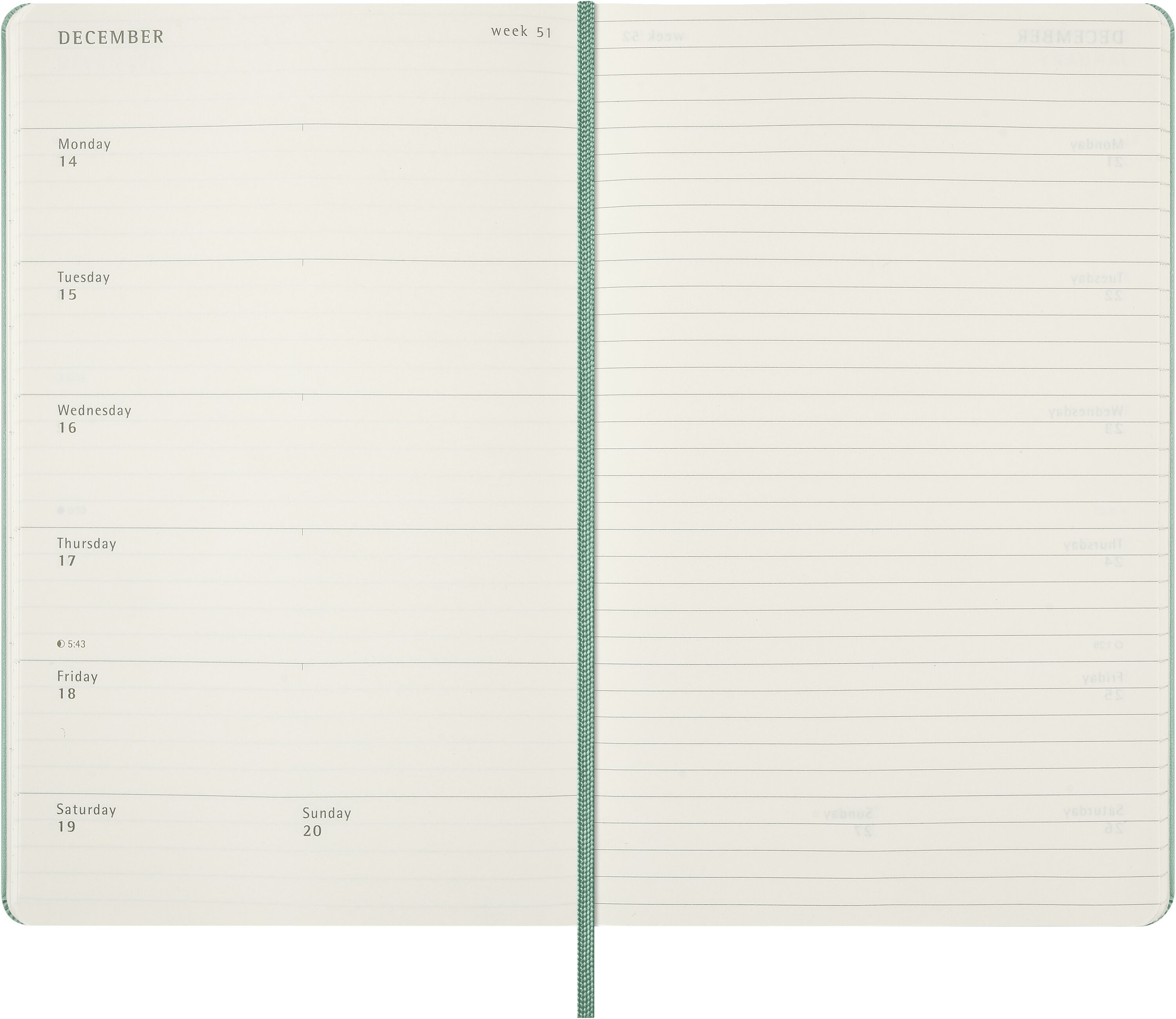 L'agenda / organiseur semainier Moleskine est daté de janvier à décembre. Avec les rendez-vous de la semaine sur la page de gauche et une page lignée à droite avec de la place pour des notes et des idées, il est à la fois pratique et polyvalent, tout en offrant la liberté d'un carnet de notes.'- daté de janvier à décembre 2027- disponible avec une couverture rigide- coins arrondis, élastique de fermeture et bande marque-page assortie- papier blanc ivoire sans acide, 70 g/m²- outils utiles : calendrier, plans de voyage, idées et objectifs, pages lignées pour les notes- autocollants pour personnaliser vos plans et autocollants de l'année pour le dos du calendrier - pochette interne pliable de couleur assortie- page de garde avec étiquette "In case of loss"- se pose à plat, s'ouvre entièrement à 180°- Le papier de cet objet Moleskine Objet Moleskine provient de forêts certifiées FSC® gérées durablement et d'autres sources contrôlées