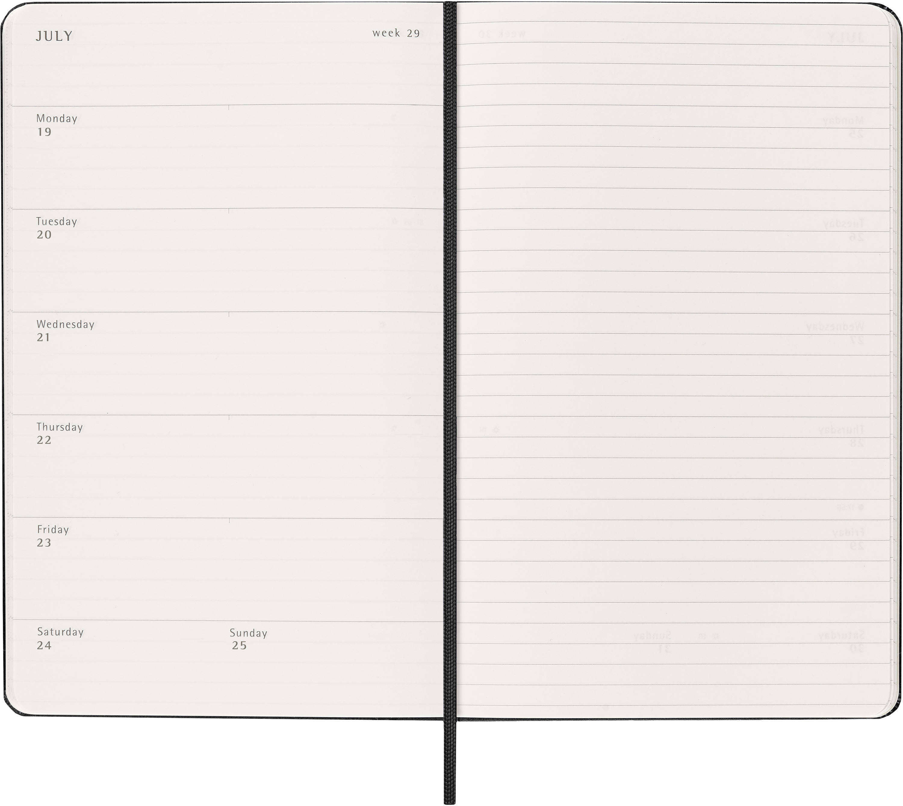 L'agenda / calendrier semainier Moleskine va de janvier à décembre. Avec les dates de la semaine sur la page de gauche et une page lignée à droite avec de l'espace pour des notes et des idées, ce format d'agenda populaire est parfait pour les apprenants, les enseignants et les professionnels.