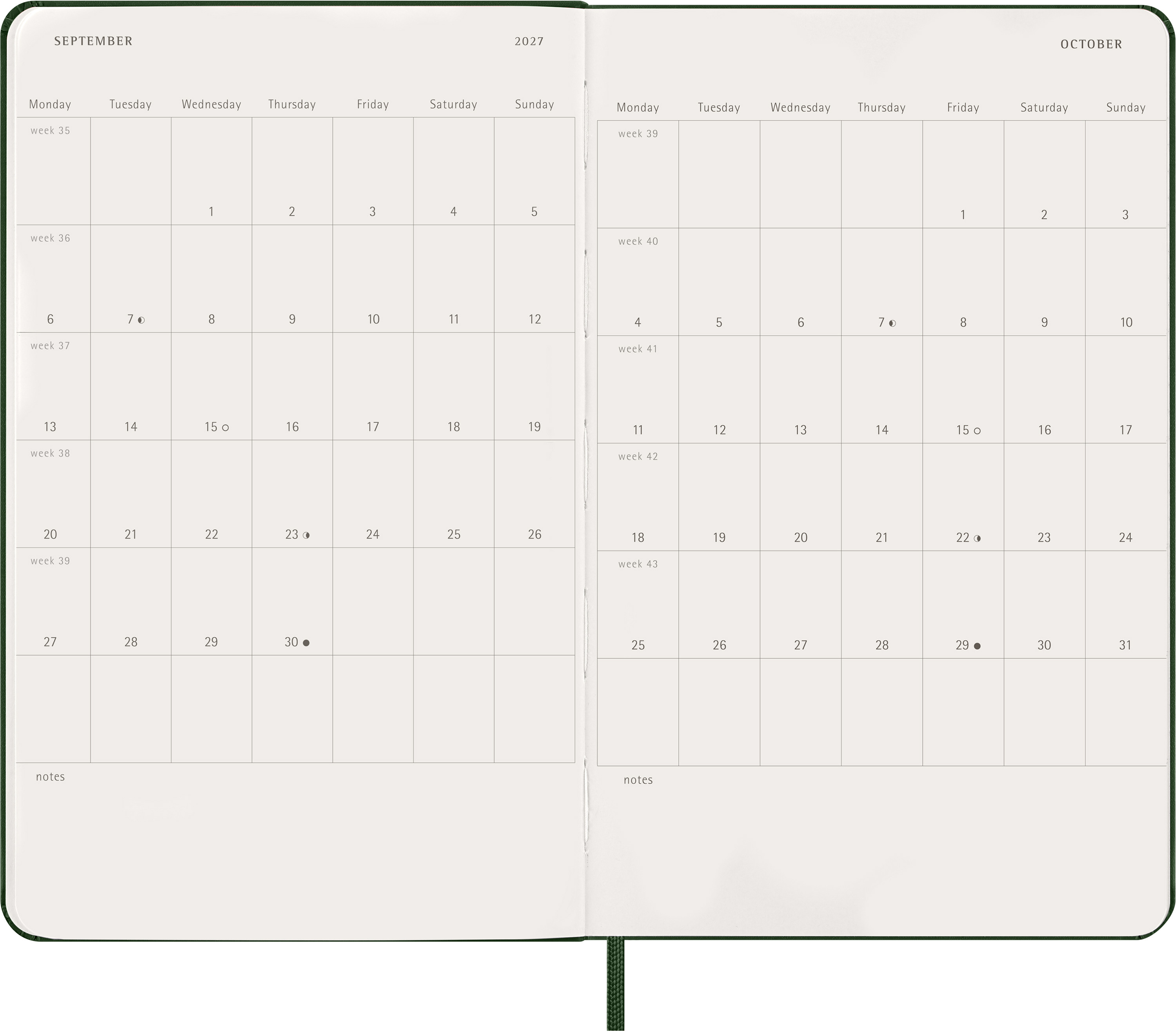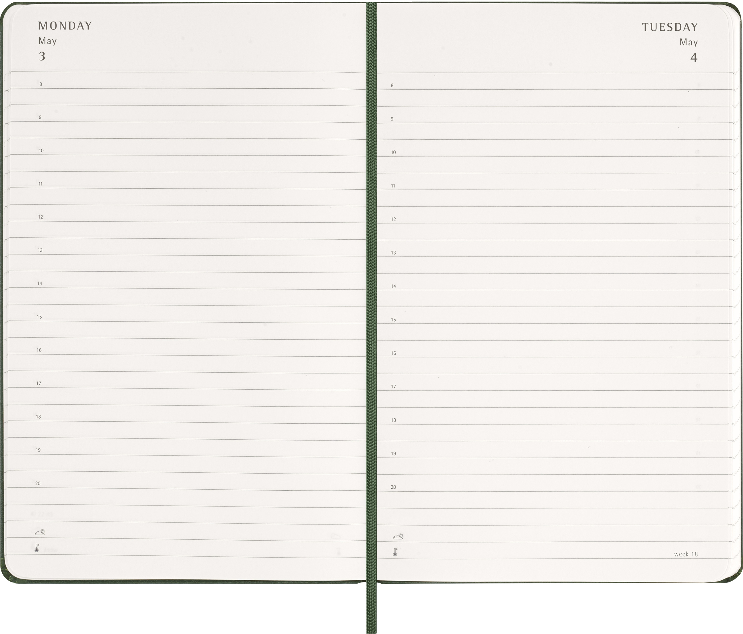 L'agenda journalier Moleskine va de janvier à décembre. Ce calendrier très apprécié, qui comporte une page par jour, est disponible dans de nombreuses couleurs afin d'immortaliser en détail chaque jour de l'année.