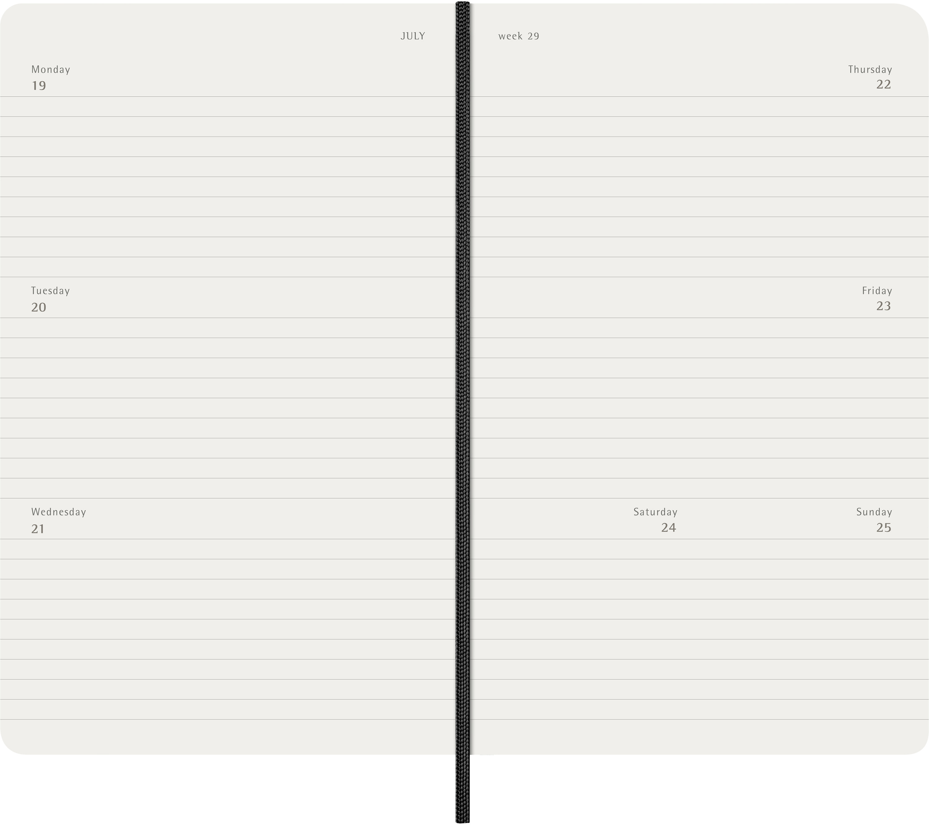 L'agenda semainier horizontal Moleskine s'étend de janvier à décembre.L'agenda horizontal populaire comporte une semaine sur deux pages (lundi, mardi et mercredi sur la gauche, jeudi, vendredi et samedi/dimanche sur la droite).