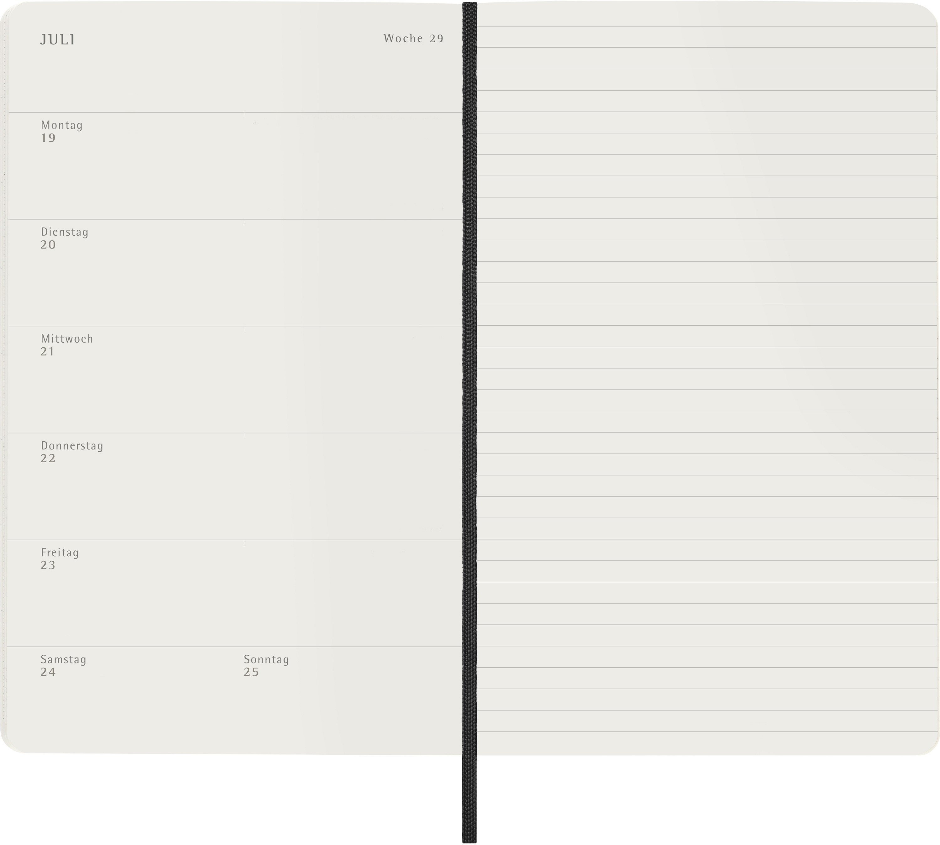 L'agenda / calendrier semainier Moleskine va de janvier à décembre. Avec les dates de la semaine sur la page de gauche et une page lignée à droite avec de l'espace pour des notes et des idées, ce format d'agenda populaire est parfait pour les apprenants, les enseignants et les professionnels.