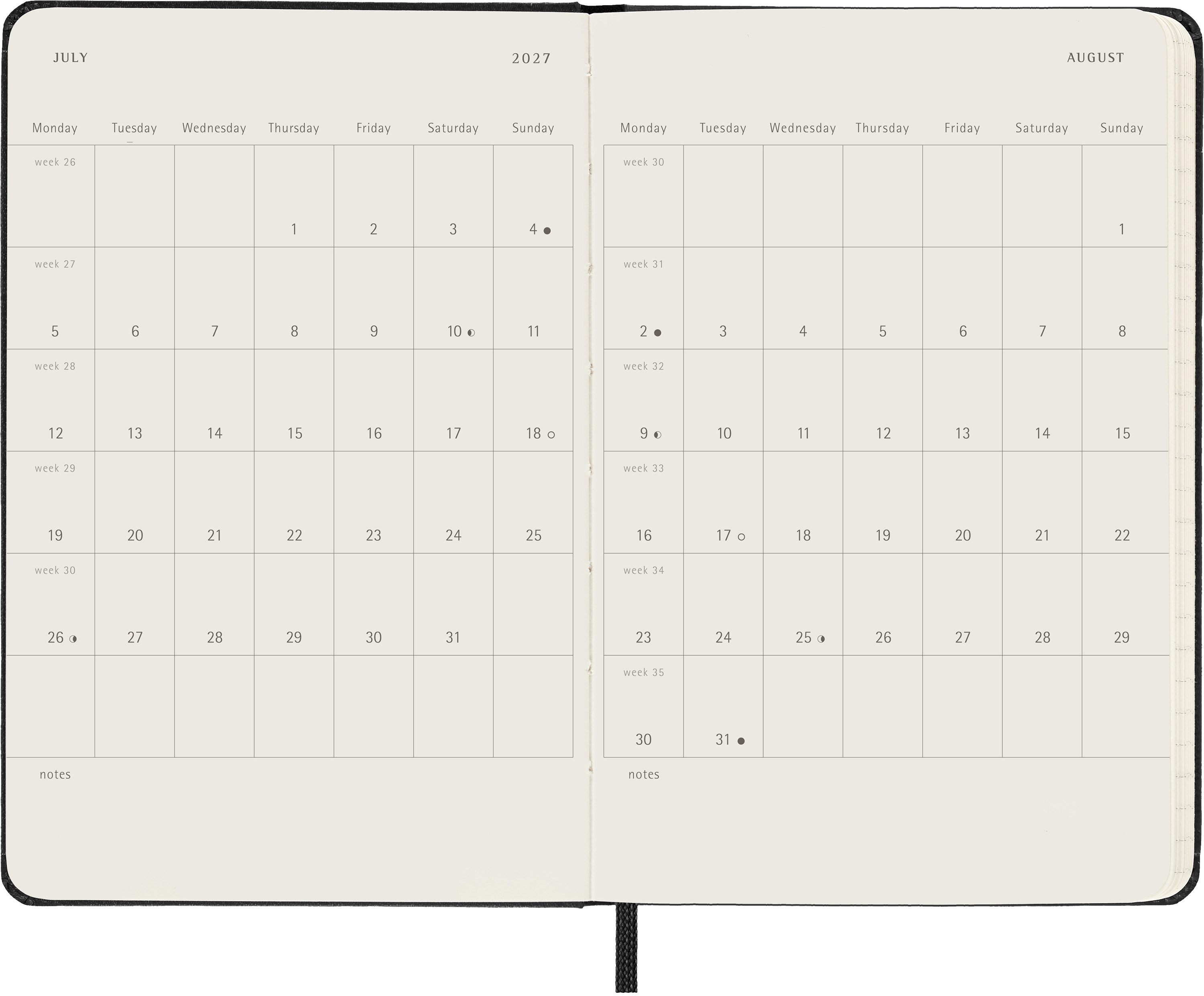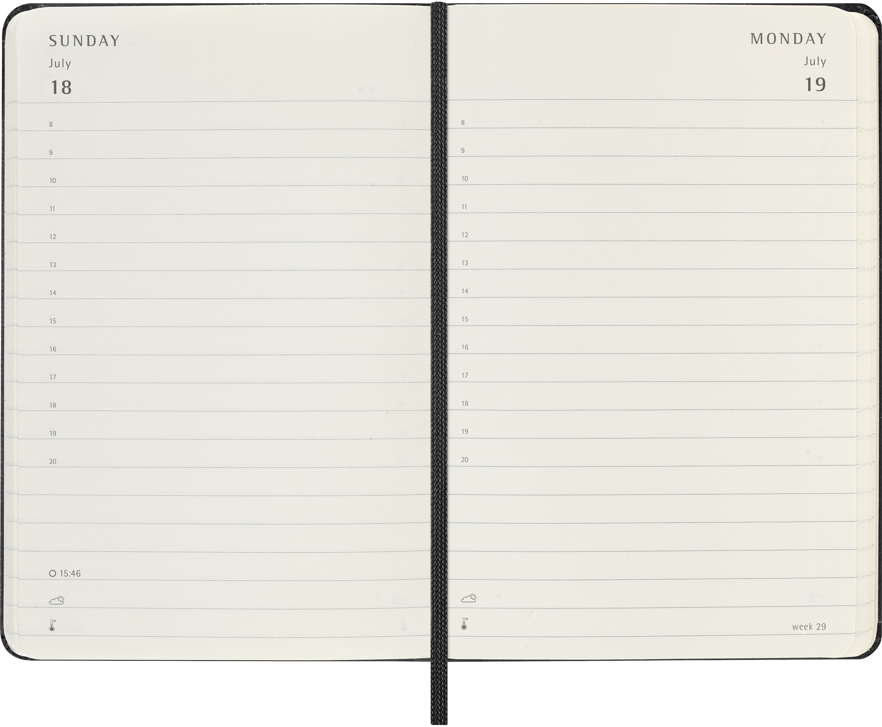 L'agenda journalier Moleskine va de janvier à décembre. Ce calendrier très apprécié, qui comporte une page par jour, est disponible dans de nombreuses couleurs afin d'immortaliser en détail chaque jour de l'année.
