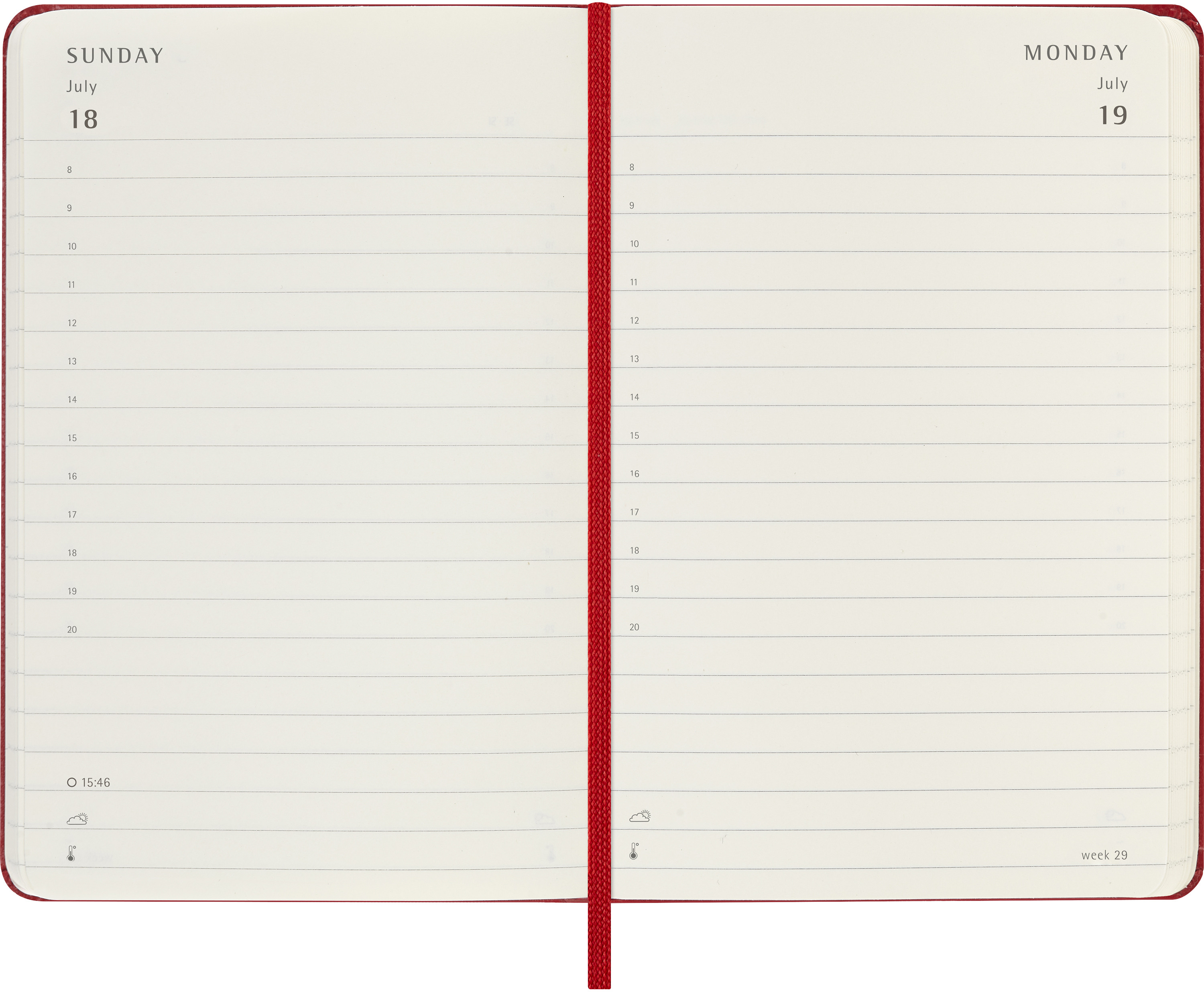 L'agenda journalier Moleskine va de janvier à décembre. Ce calendrier très apprécié, qui comporte une page par jour, est disponible dans de nombreuses couleurs afin d'immortaliser en détail chaque jour de l'année.