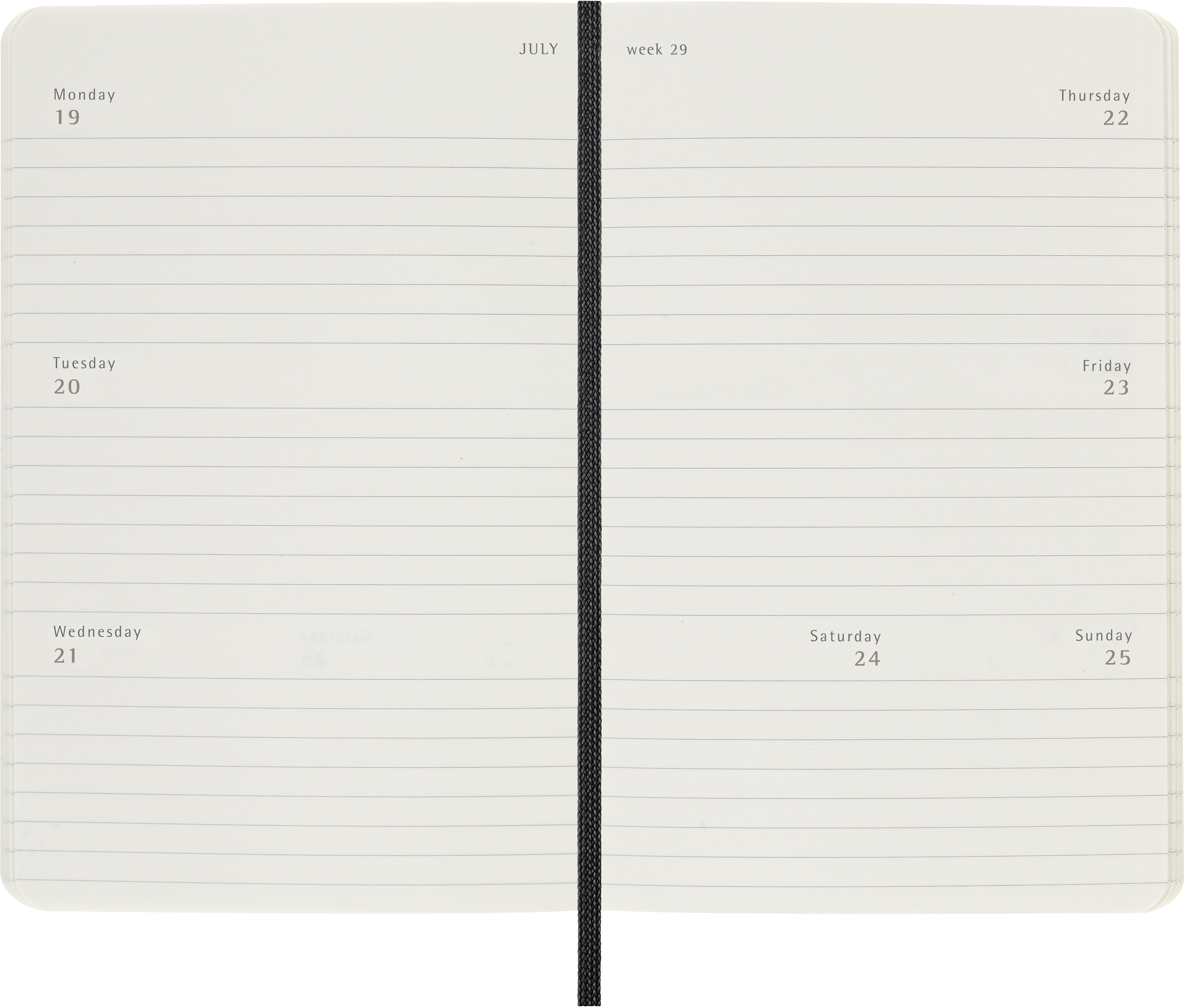 L'agenda semainier horizontal Moleskine va de janvier à décembre. Ce calendrier horizontal très apprécié comporte une semaine sur deux pages (lundi, mardi et mercredi sur la page de gauche, jeudi, vendredi et samedi/dimanche sur la page de droite).