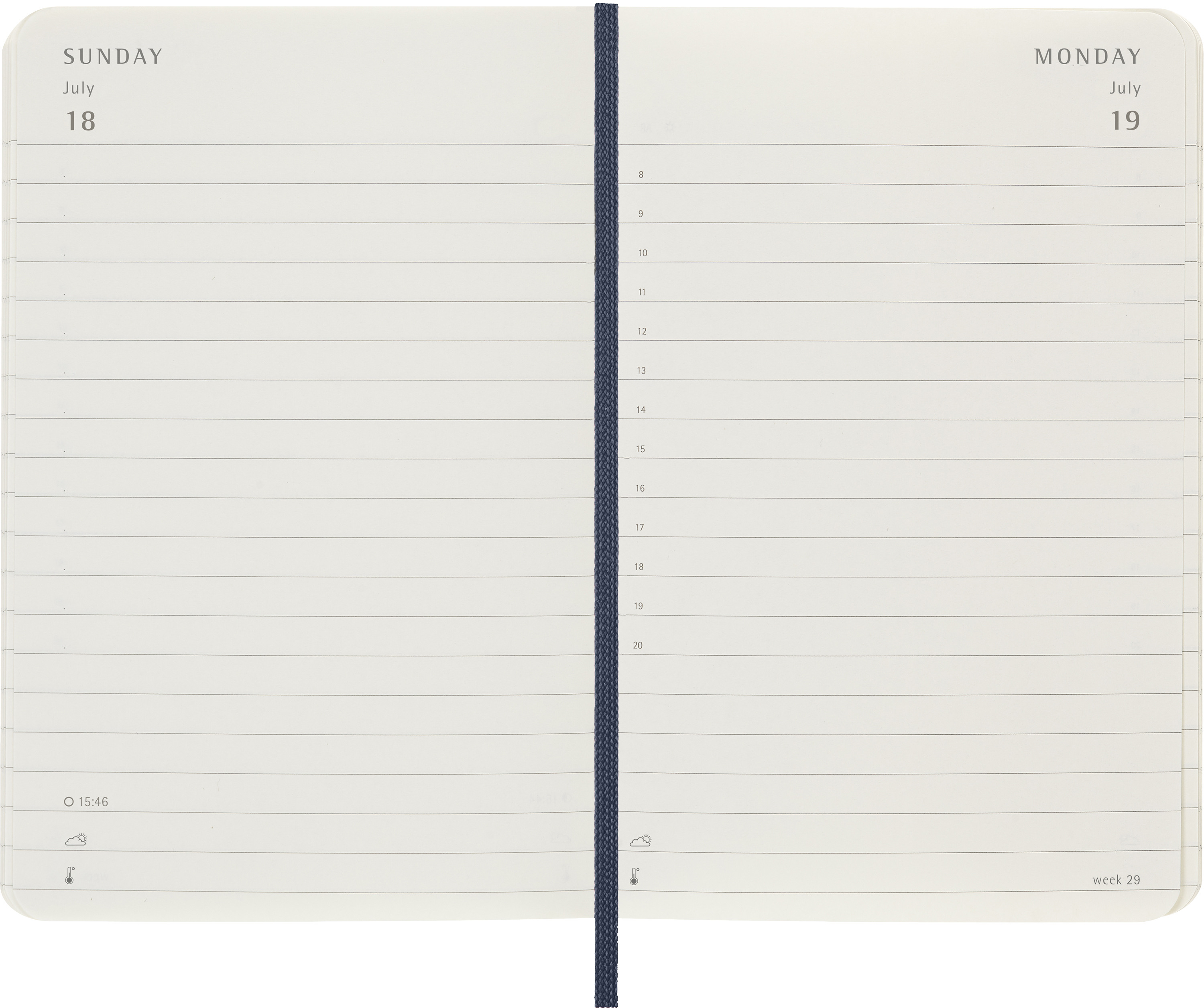 L'agenda journalier Moleskine va de janvier à décembre. Ce calendrier très apprécié, qui comporte une page par jour, est disponible dans de nombreuses couleurs afin d'immortaliser en détail chaque jour de l'année.