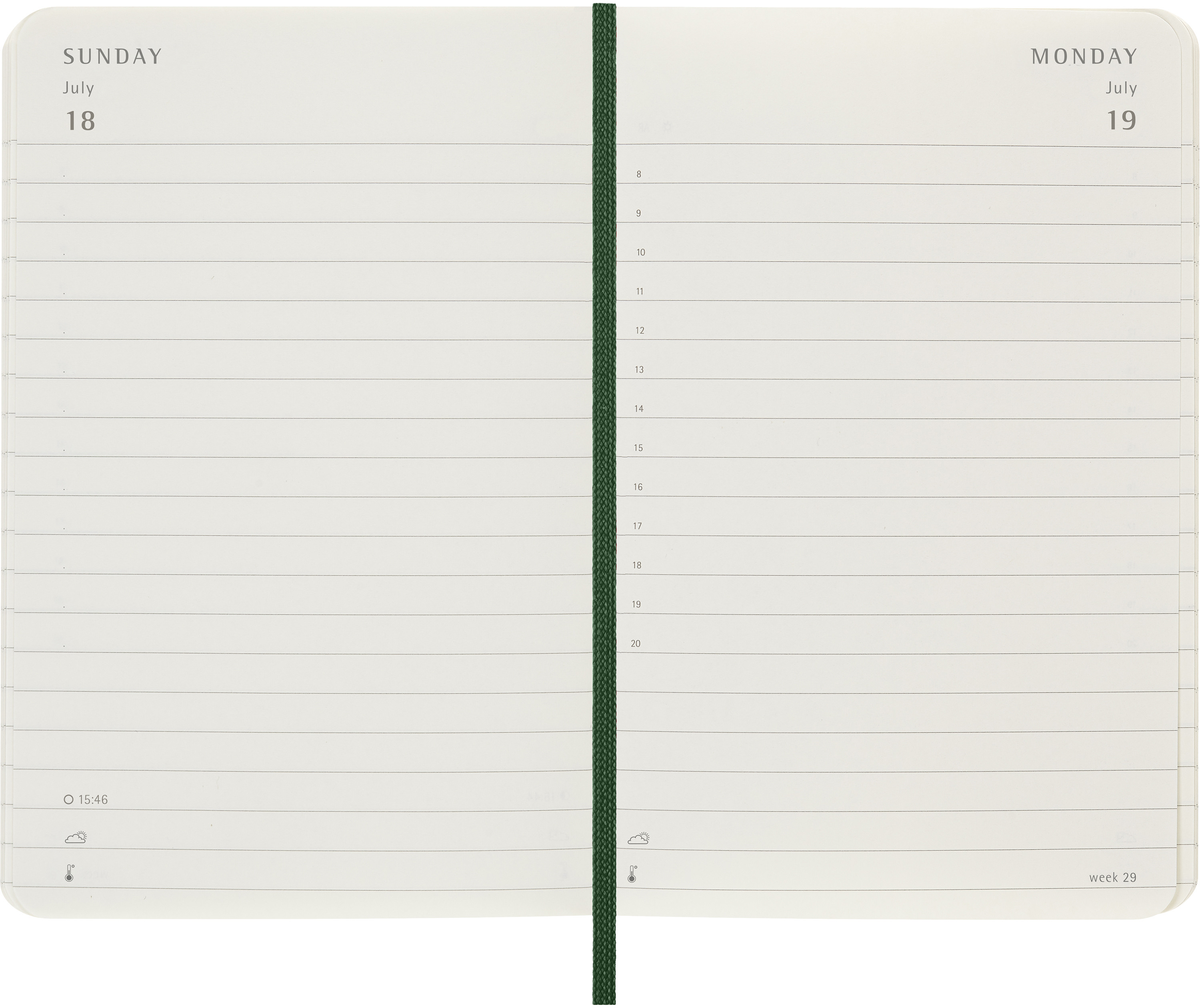 L'agenda journalier Moleskine va de janvier à décembre. Ce calendrier très apprécié, qui comporte une page par jour, est disponible dans de nombreuses couleurs afin d'immortaliser en détail chaque jour de l'année.