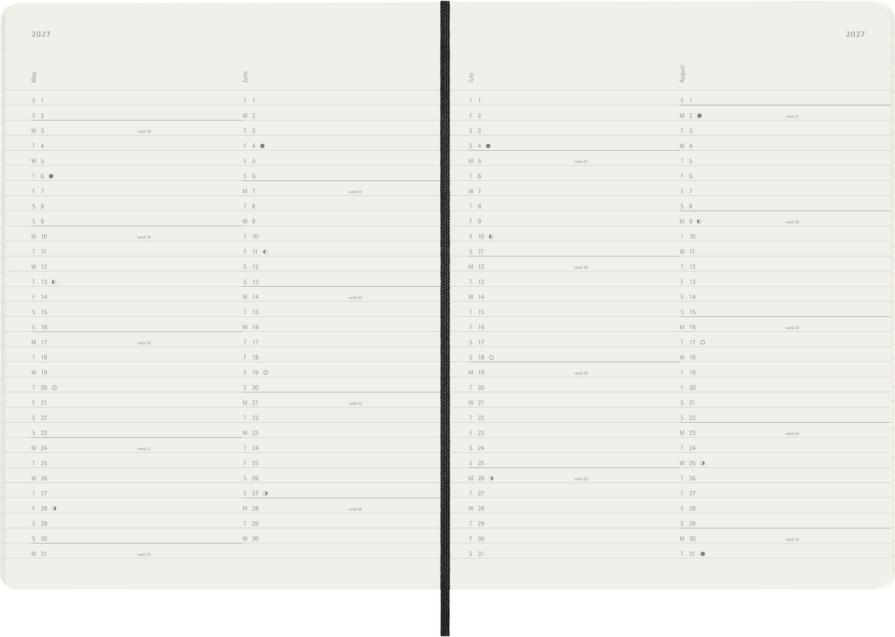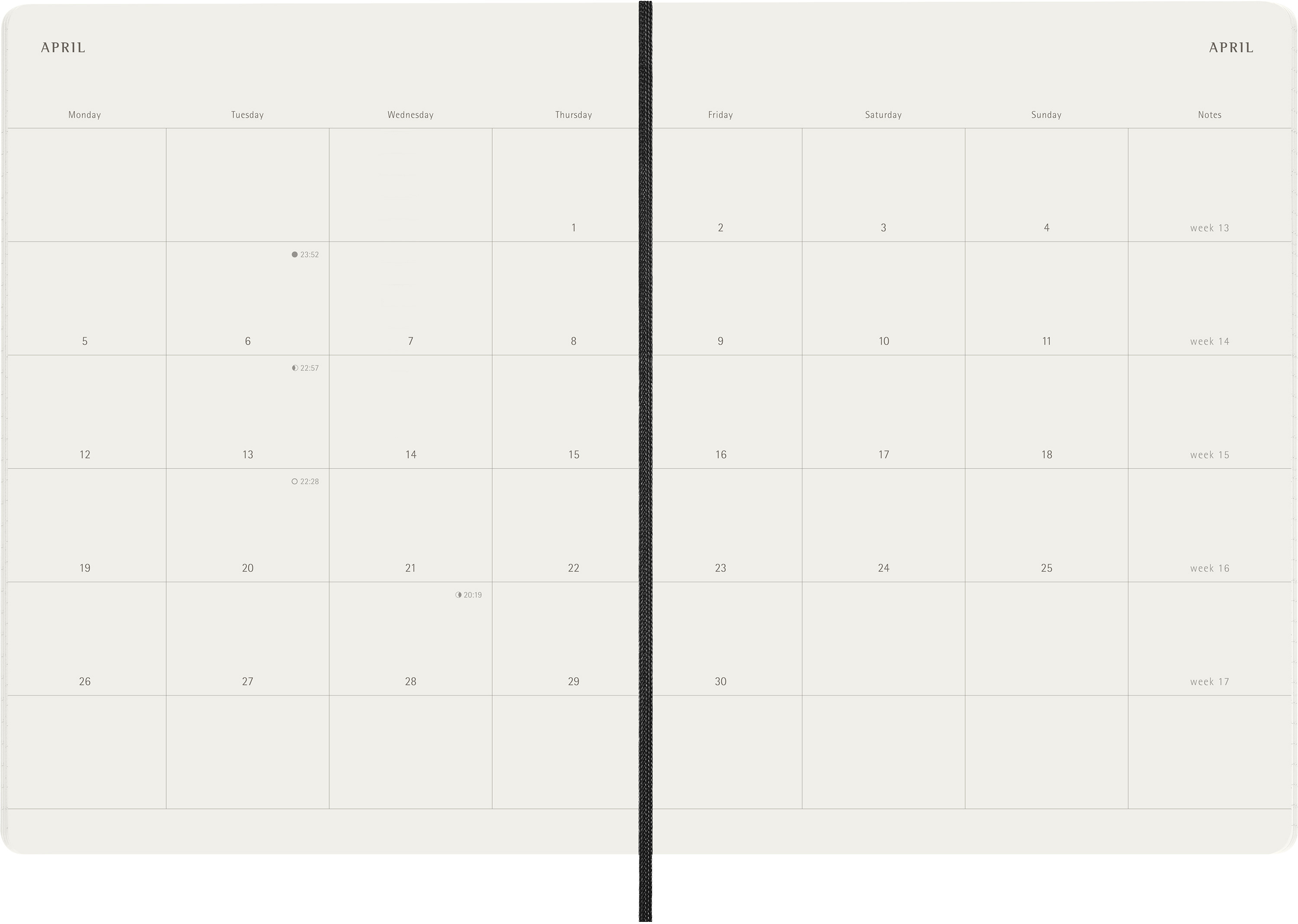 L'agenda mensuel Moleskine va de janvier à décembre. Ce calendrier présente chaque mois sur deux pages, suivies d'une double page lignée pour prendre des notes entre les mois. 51 pages lignées à la fin du calendrier offrent un espace supplémentaire.
